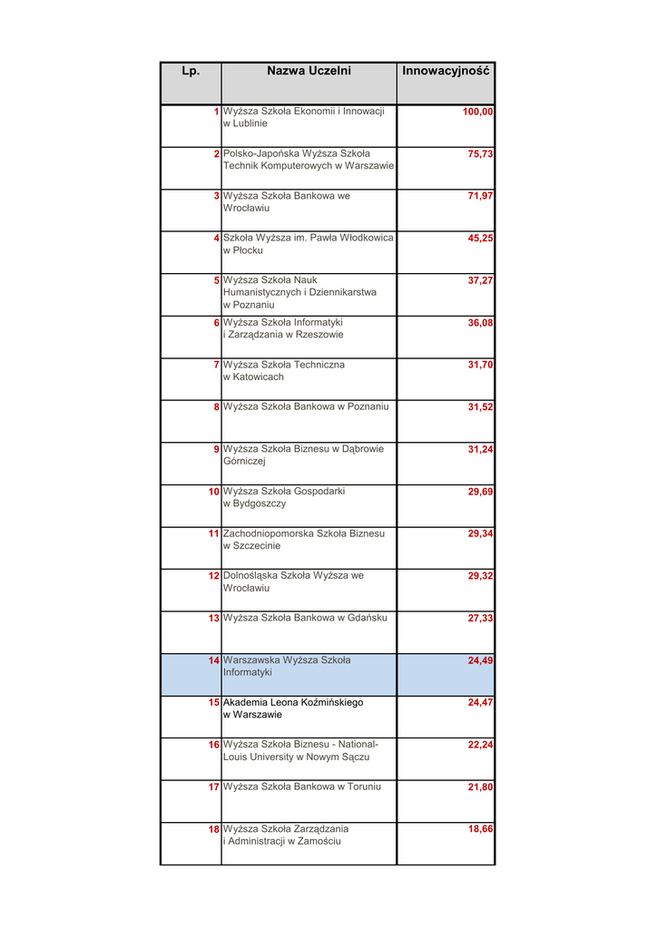 Lp. Nazwa Uczelni 1 WyŜsza Szkoła Ekonomii i Innowacji w Lublinie Innowacyjność 100,00 2 Polsko-Japońska WyŜsza Szkoła Technik Komputerowych w Warszawie 75,73 3 WyŜsza Szkoła Bankowa we Wrocławiu 71,97 4 Szkoła WyŜsza im. Pawła Włodkowica w Płocku 45,25 5 WyŜsza Szkoła Nauk Humanistycznych i Dziennikarstwa w Poznaniu 37,27 6 WyŜsza Szkoła Informatyki i Zarządzania w Rzeszowie 36,08 7 WyŜsza Szkoła Techniczna w Katowicach 31,70 8 WyŜsza Szkoła Bankowa w Poznaniu 31,52 9 WyŜsza Szkoła Biznesu w Dąbrowie Górniczej 31,24 10 WyŜsza Szkoła Gospodarki w Bydgoszczy 29,69 11 Zachodniopomorska Szkoła Biznesu w Szczecinie 29,34 12 Dolnośląska Szkoła WyŜsza we Wrocławiu 29,32 13 WyŜsza Szkoła Bankowa w Gdańsku 27,33 14 Warszawska WyŜsza Szkoła Informatyki 24,49 15 Akademia Leona Koźmińskiego w Warszawie 24,47 16 WyŜsza Szkoła Biznesu - NationalLouis University w Nowym Sączu 22,24 17 WyŜsza Szkoła Bankowa w Toruniu 21,80 18 WyŜsza Szkoła Zarządzania i Administracji w Zamościu 18,66 19 Akademia Finansów w Warszawie 17,77 20 Akademia HumanistycznoEkonomiczna w Łodzi 16,70 21 WyŜsza Szkoła Handlowa im. B. Markowskiego w Kielcach 15,22 22 WyŜsza Szkoła Ekonomii. Turystyki i Nauk Społecznych w Kielcach 11,93 23 WyŜsza Szkoła Przedsiębiorczości i Administracji w Lublinie 11,82 24 Akademia Humanistyczna im. Aleksandra Gieysztora w Pułtusku 11,60 25 Krakowska Akademia im. A. Frycza Modrzewskiego 11,20 26 WyŜsza Szkoła Ekonomii i Prawa im. prof. E. Lipińskiego w Kielcach 11,05 27 Collegium Civitas w Warszawie 10,75 28 Szkoła WyŜsza Psychologii Społecznej w Warszawie 10,73 29 Szkoła WyŜsza im. Bogdana Jańskiego w Warszawie 9,85 30 Międzynarodowa WyŜsza Szkoła Logistyki i Transportu we Wrocławiu 9,42 31 WyŜsza Szkoła Zarządzania w Częstochowie 9,30 32 WyŜsza Szkoła Handlowa we Wrocławiu 9,14 33 ŁuŜycka WyŜsza Szkoła Humanistyczna w śarach 8,85 34 WyŜsza Szkoła Logistyki w Poznaniu 8,65 35 WyŜsza Szkoła Zarządzania i Bankowości w Krakowie 8,54 36 WyŜsza Szkoła Informatyki Stosowanej i Zarządzania w Warszawie 8,43 37 Uczelnia Łazarskiego w Warszawie 8,02 38 WyŜsza Szkoła Finansów i Zarządzania w Warszawie 7,87 39 Gdańska WyŜsza Szkoła Humanistyczna 7,57 40 WyŜsza Szkoła Humanistyczna TWP w Szczecinie 7,35 41 WyŜsza Szkoła Kultury Fizycznej i Turystyki im. H. Konopackiej w Pruszkowie 7,33 42 Górnośląska WyŜsza Szkoła Handlowa im. W. Korfantego w Katowicach 7,29 43 WyŜsza Szkoła Środowiska w Bydgoszczy 6,12 44 WyŜsza Szkoła Zawodowa Kosmetyki i Pielęgnacji Zdrowia w Warszawie 5,95 45 WyŜsza Szkoła Zarządzania i Administracji w Opolu 5,71 46 WyŜsza Szkoła Finansów i Zarządzania w Białymstoku 5,65 47 Szczecińska Szkoła WyŜsza Collegium Balticum 5,44 48 WyŜsza Szkoła Ekologii i Zarządzania w Warszawie 5,15 49 WyŜsza Szkoła Biznesu i Przedsiębiorczości w Ostrowcu Świętokrzyskim 5,08 50 WyŜsza Szkoła Gospodarki Euroregionalnej im. Alcide De Gasperi w Józefowie 4,86 51 Kujawsko-Pomorska Szkoła WyŜsza w Bydgoszczy 4,44 52 WyŜsza Szkoła Studiów Międzynarodowych w Łodzi 4,18 53 Elbląska Uczelnia HumanistycznoEkonomiczna 3,78 54 WyŜsza Szkoła Zarządzania Ochroną Pracy w Katowicach 3,30 55 WyŜsza Szkoła HumanistycznoEkonomiczna we Włocławku 3,24 56 WyŜsza Szkoła EkonomicznoHumanistyczna w Bielsku-Białej 3,21 57 Szkoła WyŜsza Prawa i Dyplomacji w Gdyni 3,12 58 Społeczna WyŜsza Szkoła Przedsiębiorczości i Zarządzania w Łodzi 2,94 59 WyŜsza Szkoła Języków Obcych im. S.B. Lindego w Poznaniu 2,87 60 Collegium Mazovia Innowacyjna Szkoła WyŜsza w Siedlcach 2,43 61 WyŜsza Szkoła Pedagogiczna w Łodzi 2,30 62 WyŜsza Szkoła Lingwistyczna w Częstochowie 1,97 63 WyŜsza Szkoła MenedŜerska w Warszawie 1,94 64 WyŜsza Szkoła Humanitas w Sosnowcu 1,87 65 WyŜsza Szkoła Finansów i Prawa w Bielsku-Białej 1,78 66 WyŜsza Szkoła Informatyki. Zarządzania i Administracji w Warszawie 1,09 67 Śląska WyŜsza Szkoła Zarządzania im. gen. J. Ziętka w Katowicach 0,91 68 WyŜsza Szkoła Filologiczna we Wrocławiu 0,72 69 Niepaństwowa WyŜsza Szkoła Pedagogiczna w Białymstoku 0,63 70 Warszawska Szkoła Zarządzania Szkoła WyŜsza 0,59 71 WyŜsza Szkoła Bezpieczeństwa w Poznaniu 0,46 72 WyŜsza Szkoła Kultury Społecznej i Medialnej w Toruniu 0,27 73 Wałbrzyska WyŜsza Szkoła Zarządzania i Przedsiębiorczości 0,18 74 Uczelnia Vistula (d. WSEI w Warszawie) 0,00 75 Mazowiecka WyŜsza Szkoła Humanistyczno-Pedagogiczna w Łowiczu 0,00 76 WyŜsza Szkoła Zarządzania Marketingowego i Jęz. Obcych w Katowicach 0,00 77 WyŜsza Szkoła Agrobiznesu w ŁomŜy 0,00 78 Akademia Polonijna w Częstochowie 0,00 79 WyŜsza Szkoła Umiejętności Społecznych w Poznaniu 0,00 80 Almamer WyŜsza Szkoła Ekonomiczna w Warszawie 0,00 81 WyŜsza Szkoła MenedŜerska w Legnicy 0,00 82 WyŜsza Szkoła Komunikowania i Mediów Społecznych im. J. Giedroycia w Warszawie 0,00 83 WyŜsza Szkoła Turystyki i Hotelarstwa w Gdańsku 0,00 84 WyŜsza Szkoła Zarządzania „Edukacja” we Wrocławiu 0,00 85 WyŜsza Szkoła Informatyki i Ekonomii TWP w Olsztynie 0,00 86 WyŜsza Szkoła Administracji w Bielsku-Białej 0,00 87 Prywatna WyŜsza Szkoła Ochrony Środowiska w Radomiu 0,00 88 Wielkopolska WyŜsza Szkoła Społeczno-Ekonomiczna w Środzie Wielkopolskiej 0,00 89 WyŜsza Szkoła Turystyki i Ekologii w Suchej Beskidzkiej 0,00 90 WyŜsza Szkoła Zarządzania i Bankowości w Poznaniu 0,00 91 WyŜsza Szkoła SpołecznoPrzyrodnicza im. W. Pola w Lublinie 0,00 92 Wszechnica Mazurska w Olecku 0,00 93 WyŜsza Szkoła Wychowania Fizycznego i Turystyki w Białymstoku 0,00 94 WyŜsza Szkoła Hotelarstwa i Gastronomii w Poznaniu 0,00 95 WyŜsza Szkoła Humanistyczna im. Króla St. Leszczyńskiego w Lesznie 0,00 96 WyŜsza Szkoła Pedagogiki i Administracji im. Mieszka i w Poznaniu 0,00 97 WyŜsza Szkoła Gospodarowania Nieruchomościami w Warszawie 0,00 98 WyŜsza Szkoła Hotelarstwa. Gastr