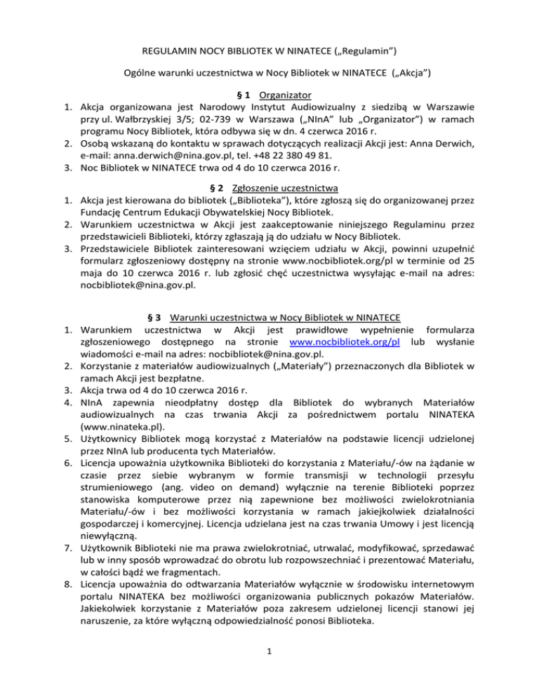 REGULAMIN NOCY BIBLIOTEK W NINATECE („Regulamin”) Ogólne warunki uczestnictwa w Nocy Bibliotek w NINATECE („Akcja”) § 1 Organizator 1. Akcja organizowana jest Narodowy Instytut Audiowizualny z siedzibą w Warszawie przy ul. Wałbrzyskiej 3/5; 02-739 w Warszawa („NInA” lub „Organizator”) w ramach programu Nocy Bibliotek, która odbywa się w dn. 4 czerwca 2016 r. 2. Osobą wskazaną do kontaktu w sprawach dotyczących realizacji Akcji jest: Anna Derwich, e-mail: [email protected], tel. +48 22 380 49 81. 3. Noc Bibliotek w NINATECE trwa od 4 do 10 czerwca 2016 r. § 2 Zgłoszenie uczestnictwa 1. Akcja jest kierowana do bibliotek („Biblioteka”), które zgłoszą się do organizowanej przez Fundację Centrum Edukacji Obywatelskiej Nocy Bibliotek. 2. Warunkiem uczestnictwa w Akcji jest zaakceptowanie niniejszego Regulaminu przez przedstawicieli Biblioteki, którzy zgłaszają ją do udziału w Nocy Bibliotek. 3. Przedstawiciele Bibliotek zainteresowani wzięciem udziału w Akcji, powinni uzupełnić formularz zgłoszeniowy dostępny na stronie www.nocbibliotek.org/pl w terminie od 25 maja do 10 czerwca 2016 r. lub zgłosić chęć uczestnictwa wysyłając e-mail na adres: [email protected]. 1. 2. 3. 4. 5. 6. 7. 8. § 3 Warunki uczestnictwa w Nocy Bibliotek w NINATECE Warunkiem uczestnictwa w Akcji jest prawidłowe wypełnienie formularza zgłoszeniowego dostępnego na stronie www.nocbibliotek.org/pl lub wysłanie wiadomości e-mail na adres: [email protected]. Korzystanie z materiałów audiowizualnych („Materiały”) przeznaczonych dla Bibliotek w ramach Akcji jest bezpłatne. Akcja trwa od 4 do 10 czerwca 2016 r. NInA zapewnia nieodpłatny dostęp dla Bibliotek do wybranych Materiałów audiowizualnych na czas trwania Akcji za pośrednictwem portalu NINATEKA (www.ninateka.pl). Użytkownicy Bibliotek mogą korzystać z Materiałów na podstawie licencji udzielonej przez NInA lub producenta tych Materiałów. Licencja upoważnia użytkownika Biblioteki do korzystania z Materiału/-ów na żądanie w czasie przez siebie wybranym w formie transmisji w technologii przesyłu strumieniowego (ang. video on demand) wyłącznie na terenie Biblioteki poprzez stanowiska komputerowe przez nią zapewnione bez możliwości zwielokrotniania Materiału/-ów i bez możliwości korzystania w ramach jakiejkolwiek działalności gospodarczej i komercyjnej. Licencja udzielana jest na czas trwania Umowy i jest licencją niewyłączną. Użytkownik Biblioteki nie ma prawa zwielokrotniać, utrwalać, modyfikować, sprzedawać lub w inny sposób wprowadzać do obrotu lub rozpowszechniać i prezentować Materiału, w całości bądź we fragmentach. Licencja upoważnia do odtwarzania Materiałów wyłącznie w środowisku internetowym portalu NINATEKA bez możliwości organizowania publicznych pokazów Materiałów. Jakiekolwiek korzystanie z Materiałów poza zakresem udzielonej licencji stanowi jej naruszenie, za które wyłączną odpowiedzialność ponosi Biblioteka. 1 § 4 Postanowienia końcowe 1. Zgłaszając się do udziału w Akcji przedstawiciele Bibliotek wyrażają zgodę na przetwarzanie danych osobowych w nim zawartych w zbiorze danych użytkowników portalu www.ninateka.pl przez Narodowy Instytut Audiowizualny z siedzibą przy ul. Wałbrzyskiej 3/5, 02-739 Warszawa, zgodnie z przepisami ustawy z dnia 29 sierpnia 1997 r. o ochronie danych osobowych (Dz.U. z 2014 r., poz. 1182 ze zm.). NInA informuje, przedstawiciele Bibliotek mają prawo wglądu, wnoszenia poprawek oraz usunięcia swoich, dobrowolnie podanych danych osobowych. 2. Biorąc udział w Akcji przedstawiciele Bibliotek podporządkowują się postanowieniom niniejszego Regulaminu i akceptują je. 3. Organizator zastrzega sobie prawo do jednostronnego dokonywania zmian Regulaminu. Zmiany wchodzą w życie z dniem ich opublikowania na stronie: www.nina.gov.pl. 4. Wszelkie dodatkowe informacje dotyczące Akcji można uzyskać kontaktując się z NInA pod numerem wskazanym w § 1 ust. 2 Regulaminu. 2