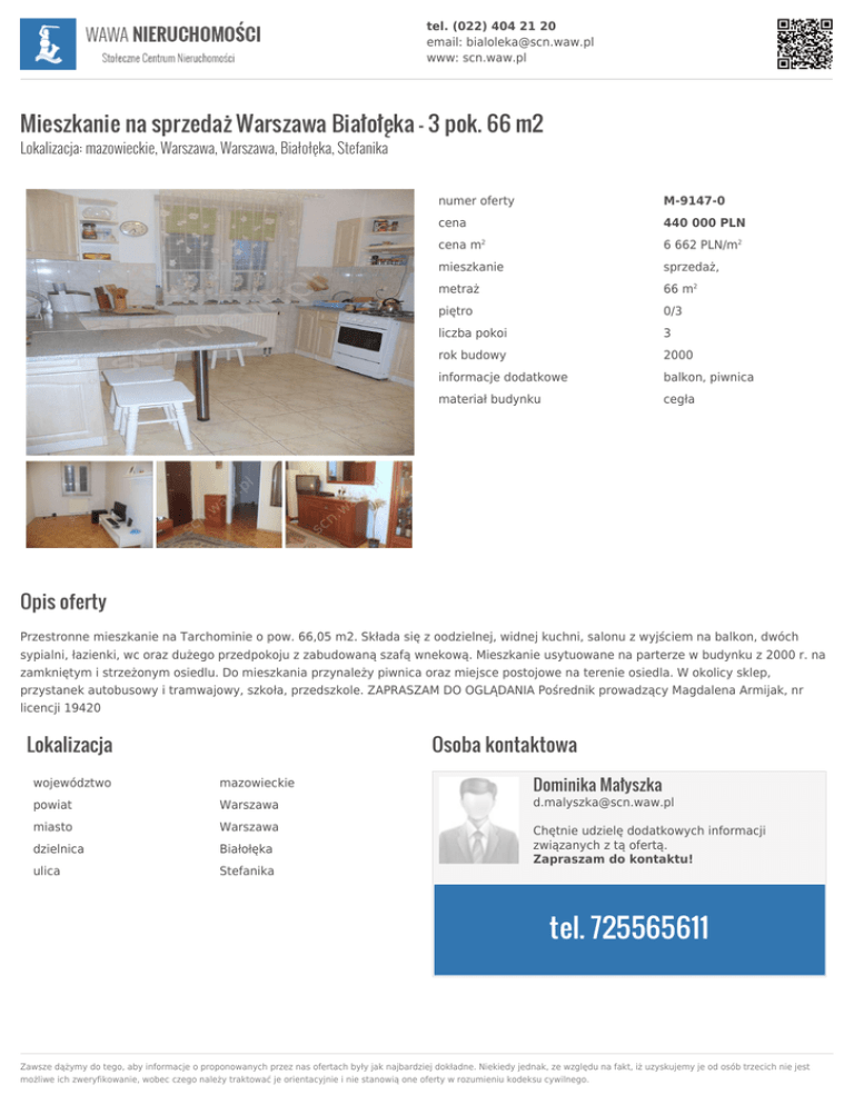 tel. (022) 404 21 20 email: [email protected] www: scn.waw.pl Mieszkanie na sprzedaż Warszawa Białołęka - 3 pok. 66 m2 Lokalizacja: mazowieckie, Warszawa, Warszawa, Białołęka, Stefanika numer oferty M-9147-0 cena 440 000 PLN cena m 6 662 PLN/m2 mieszkanie sprzedaż, metraż 66 m2 piętro 0/3 liczba pokoi 3 rok budowy 2000 informacje dodatkowe balkon, piwnica materiał budynku cegła 2 Opis oferty Przestronne mieszkanie na Tarchominie o pow. 66,05 m2. Składa się z oodzielnej, widnej kuchni, salonu z wyjściem na balkon, dwóch sypialni, łazienki, wc oraz dużego przedpokoju z zabudowaną szafą wnekową. Mieszkanie usytuowane na parterze w budynku z 2000 r. na zamkniętym i strzeżonym osiedlu. Do mieszkania przynależy piwnica oraz miejsce postojowe na terenie osiedla. W okolicy sklep, przystanek autobusowy i tramwajowy, szkoła, przedszkole. ZAPRASZAM DO OGLĄDANIA Pośrednik prowadzący Magdalena Armijak, nr licencji 19420 Lokalizacja Osoba kontaktowa Dominika Małyszka województwo mazowieckie powiat Warszawa [email protected] miasto Warszawa dzielnica Białołęka ulica Stefanika Chętnie udzielę dodatkowych informacji związanych z tą ofertą. Zapraszam do kontaktu! tel. 725565611 Zawsze dążymy do tego, aby informacje o proponowanych przez nas ofertach były jak najbardziej dokładne. Niekiedy jednak, ze względu na fakt, iż uzyskujemy je od osób trzecich nie jest możliwe ich zweryfikowanie, wobec czego należy traktować je orientacyjnie i nie stanowią one oferty w rozumieniu kodeksu cywilnego.
