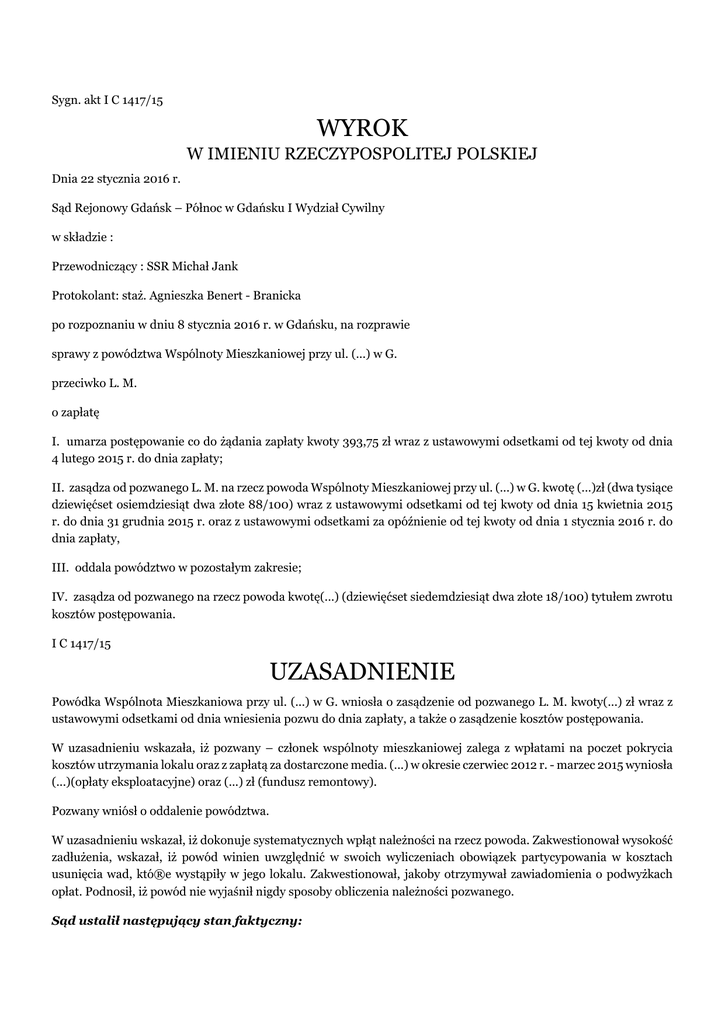 Sygn. akt I C 1417/15 WYROK W IMIENIU RZECZYPOSPOLITEJ POLSKIEJ Dnia 22 stycznia 2016 r. Sąd Rejonowy Gdańsk – Północ w Gdańsku I Wydział Cywilny w składzie : Przewodniczący : SSR Michał Jank Protokolant: staż. Agnieszka Benert - Branicka po rozpoznaniu w dniu 8 stycznia 2016 r. w Gdańsku, na rozprawie sprawy z powództwa Wspólnoty Mieszkaniowej przy ul. (...) w G. przeciwko L. M. o zapłatę I. umarza postępowanie co do żądania zapłaty kwoty 393,75 zł wraz z ustawowymi odsetkami od tej kwoty od dnia 4 lutego 2015 r. do dnia zapłaty; II. zasądza od pozwanego L. M. na rzecz powoda Wspólnoty Mieszkaniowej przy ul. (...) w G. kwotę (...)zł (dwa tysiące dziewięćset osiemdziesiąt dwa złote 88/100) wraz z ustawowymi odsetkami od tej kwoty od dnia 15 kwietnia 2015 r. do dnia 31 grudnia 2015 r. oraz z ustawowymi odsetkami za opóźnienie od tej kwoty od dnia 1 stycznia 2016 r. do dnia zapłaty, III. oddala powództwo w pozostałym zakresie; IV. zasądza od pozwanego na rzecz powoda kwotę(...) (dziewięćset siedemdziesiąt dwa złote 18/100) tytułem zwrotu kosztów postępowania. I C 1417/15 UZASADNIENIE Powódka Wspólnota Mieszkaniowa przy ul. (...) w G. wniosła o zasądzenie od pozwanego L. M. kwoty(...) zł wraz z ustawowymi odsetkami od dnia wniesienia pozwu do dnia zapłaty, a także o zasądzenie kosztów postępowania. W uzasadnieniu wskazała, iż pozwany – członek wspólnoty mieszkaniowej zalega z wpłatami na poczet pokrycia kosztów utrzymania lokalu oraz z zapłatą za dostarczone media. (...) w okresie czerwiec 2012 r. - marzec 2015 wyniosła (...)(opłaty eksploatacyjne) oraz (...) zł (fundusz remontowy). Pozwany wniósł o oddalenie powództwa. W uzasadnieniu wskazał, iż dokonuje systematycznych wpłąt należności na rzecz powoda. Zakwestionował wysokość zadłużenia, wskazał, iż powód winien uwzględnić w swoich wyliczeniach obowiązek partycypowania w kosztach usunięcia wad, któ®e wystąpiły w jego lokalu. Zakwestionował, jakoby otrzymywał zawiadomienia o podwyżkach opłat. Podnosił, iż powód nie wyjaśnił nigdy sposoby obliczenia należności pozwanego. Sąd ustalił następujący stan faktyczny: Pozwany L. M. jest członkiem powodowej Wspólnoty Mieszkaniowej przy ul. (...) (...) w G.. /okoliczność bezsporna/ Jako właściciel lokalu jest on zobowiązany do uiszczania Wspólnocie wpłat na poczet funduszu eksploatacyjnego, funduszu remontowego, należności za dostarczoną wodę, za odprowadzanie ścieków, za wywóz śmieci, za centralne ogrzewanie oraz za telewizję kablową. Na fundusz eksploatacyjny składają się wszystkie koszty niezbędne do prawidłowego funkcjonowania nieruchomości wspólnej tj. np. koszty energii zużytej w części wspólnej, koszty ubezpieczenia budynku, podatków, wynagrodzenie zarządcy, koszty sporządzania, niezbędnych przeglądów itp. Fundusz remontowy służy finansowaniu ewentualnych remontów nieruchomości wspólnej. /okoliczności bezsporne/ Pozwany zobowiązany był do uiszczania należności względem Wspólnoty do 10 dnia każdego miesiąca /okoliczność bezsporna/ Należność główna pozwanego względem powoda z tytułu kosztów zarządu w okresie od czerwca 2012 r. do marca 2015 r. wynosiły następująco: Okres Należność za dany okres (w zł) Wpłata (w zł) Zadłużenie nadpłata (w zł) Czerwiec 2012 364,29 360 - 4,19 Lipiec 2012 364,29 360 - 4,19 Sierpień 2012 364,29 0 - 364,29 Wrzesień 2012 364,29 360 - 4,19 Październik 2012 364,29 360 - 4,19 Listopad 2012 364,29 360 - 4,19 Grudzień 2012 364,29 350 - 4,19 Styczeń 2013 365,69 360 0,31 Luty 2013 365,69 0 - 365,99 / Uwagi Marzec 2013 1310,80* 400 - 910,80 Kwiecień 2013 365,69 400 34,31 Maj 2013 365,69 400 34,31 Czerwiec 2013 403,64 400 - 3,64 Lipiec 2013 409,63 400 - 9,63 Sierpień 2013 600,43* 400 - 200,43 Wrzesień 2013 409,63 400 - 9,63 Październik 2013 441,43 400 - 41,43 Listopad 2013 441,43 400 - 41,43 Grudzień 2013 441,43 400 - 41,43 Styczeń 2014 441,43 400 - 41,43 Luty 2014 441,43 400 - 41,43 Marzec 2014 916,34* 400 - 516,34 Kwiecień 2014 350,26 400 49,74 Maj 2014 350,26 400 49,74 Czerwiec 2014 570,75* 400 - 170,75 (*obejmuje także rozliczenie mediów – 945,11) (*obejmuje rozliczenie mediów 190,80) (* obejmuje rozliczenie mediów – 474,91) (*obejmuje rozliczenie mediów – 220,49) Lipiec 2014 369,79 400 30,21 Sierpień 2014 591,92* 400 - 191,92 Wrzesień 2014 367,37 400 32,63 Październik 2014 614,16* 400 - 214,16 Listopad 2014 516,25 550 33,75 Grudzień 2014 516,25 550 33,75 Styczeń 2015 567,74* 550 - 17,74 Luty 2015 586,86 550 - 36,86 Marzec 2015 586,86 550 - 36,86 suma (*obejmuje rozliczenie mediów – 224,55 (*obejmuje rozliczenie mediów – 97,91) (*obejmuje rozliczenie mediów – nadpłata 19,12) (...),88 Uwaga: 1) w kolumnie (...) oznaczono wszystkie wpłaty pozwanego według dat ich dokonywania z uwzględnieniem na poczet jakich należności zostały on zaliczone 2) w kolumnie (...) określano stan zadłużenia na koniec danego miesiąca. /dowód: potwierdzenia wpłat – k. 61-84; rozliczenie należności pozwanego – k. 95-97; plany gospodarcze – k. 13; uchwały – k. 14; zawiadomienia o wysokościach opłąt – k. 18-19/ Zaległość w opłatach pozwanego z tytułu funduszu remontowego za okres czerwiec 2012 – marzec 2015 wynosiła (...) zł Kwota ta została uiszczona w dniu 10 sierpnia 2015 r. /okoliczności bezsporne/ Pismem z dnia 4 lutego 2015 r. powód wezwał pozwanego do zapłaty (...),96 tytułem zaległości w opłatach eksploatacyjnych oraz kwoty (...) zł tytułem zaległości w opłatach na fundusz remontowy zł w terminie 7 dni od otrzymania wezwania /dowód: wezwanie do zapłaty z 4.02.2016 r. wraz z potwierdzeniem odbioru – k. 20/ Sąd zważył, co następuje: Stan faktyczny w sprawie jest w znacznej części niesporny. Pozwany nie kwestionował swojej legitymacji biernej. Strony nie wiodły również sporu co do wysokości dokonanych przez pozwaneg