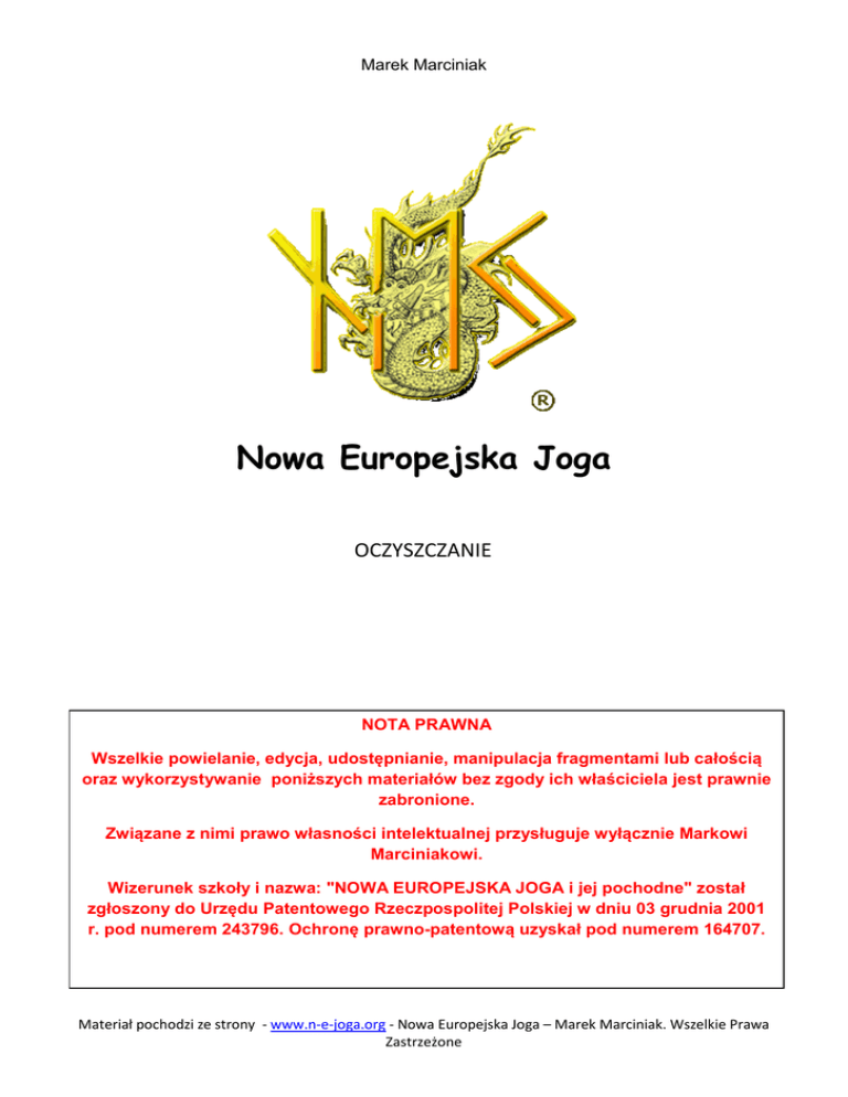 Marek Marciniak Nowa Europejska Joga OCZYSZCZANIE NOTA PRAWNA Wszelkie powielanie, edycja, udostępnianie, manipulacja fragmentami lub całością oraz wykorzystywanie poniższych materiałów bez zgody ich właściciela jest prawnie zabronione. Związane z nimi prawo własności intelektualnej przysługuje wyłącznie Markowi Marciniakowi. Wizerunek szkoły i nazwa: "NOWA EUROPEJSKA JOGA i jej pochodne" został zgłoszony do Urzędu Patentowego Rzeczpospolitej Polskiej w dniu 03 grudnia 2001 r. pod numerem 243796. Ochronę prawno-patentową uzyskał pod numerem 164707. Materiał pochodzi ze strony - www.n-e-joga.org - Nowa Europejska Joga – Marek Marciniak. Wszelkie Prawa Zastrzeżone W ciągu całego życia organizmowi powinny być dostarczane odpowiednie substancje odżywcze, aby mógł prawidłowo funkcjonować. Na poziomie fizycznym odbywa się to w sposób dobrze wszystkim znany, a mianowicie poprzez spożywanie posiłków. Dostarczone do organizmu pokarmy są przetwarzane w przewodzie pokarmowym, a następnie selekcjonowane. Część składników odżywczych, która jest przydatna, zostaje przyswojona, a niepotrzebne pozostałości - wydalone. Gdy w spożywanych pokarmach znajduje się zbyt wiele niepotrzebnych, a nawet szkodliwych substancji, zaczynają one zazwyczaj powoli zanieczyszczać organizm i tym samym mu szkodzić. Jeżeli dzieje się tak przez dłuższy czas, organizm nie nadąża usunąć wszystkich produktów przemiany materii. W konsekwencji śmieci te zalegają tworząc różnego typu złogi. W związku z tym, że ciała sąsiadujące wzajemnie na siebie oddziałują, oczywiste jest, iż w konsekwencji po pewnym czasie cierpi nie tylko ciało fizyczne, ale także ciała wyższe. Wraz z odchodami fizycznymi zalegają również odchody bioenergii (są to niewłaściwe, czyli chorobowe bioenergie). Odpady fizyczne, pozostające w organizmie to zazwyczaj wszelkiego rodzaju śluzy skrobiowe, toksyny dostarczane wraz z mięsem, jak i wszelkie inne trucizny chemiczne. Odpady te odkładają się w całym ciele fizycznym, lecz w szczególności w żołądku, jelitach, wątrobie, nerkach, tętnicach i żyłach. W miejscach szczególnego nagromadzenia toksyn wybuchają ogniska chorobowe. Rozkładające się komórki stanowią świetną pożywkę dla wzrostu różnego typu bakterii i pasożytów. Stąd płynie prosty wniosek, że od sposobu odżywiania oraz czystości ciała fizycznego (części zewnętrznej, a także jego wnętrza), zależy naturalna odporność na choroby, czyli zdrowie fizyczne i psychiczne. Bardzo ważny jest rodzaj i stopień czystości substancji wprowadzanych do organizmu. Niewłaściwy posiłek może nie tylko nie odżywiać dostatecznie, ale dodatkowo może zatruwać nasze ciała toksynami, czy obciążać go substancjami balastowymi. Zmusza to nasz system samouzdrawiania do niepotrzebnej intensywnej pracy, tym samym osłabia i zmniejsza odporność ogólną. Bioenergie, które są częścią naszego biopola niepotrzebnie są zużywane na ochronę przed nami samymi, czyli błędami, które popełniamy. Bioenergie te pracują, aby wyłapać toksyny, zneutralizować je i wydalić. To wielka praca, do której potrzebne są ogromne nakłady energii. Są one marnotrawione, o ile człowiek nierozsądnie i nierozumnie sam zatruwa swój organizm i przeciąża mechanizmy wyrównawcze. Osłabione w ten sposób biopole może nie radzić sobie z odpieraniem ciągłych ataków zewnętrznych, tych fizjologicznych i tych niepotrzebnych – patologicznych. Wobec powyższego nasuwa się pytanie - jak sobie poradzić z problemem nadmiernego zużywania bioenergii w procesach oczyszczania, detoksykacji i naprawy uszkodzeń, jeżeli pomimo naszych starań nasza dieta i środowisko nie są zdrowe. Przyczyny takiego stanu rzeczy są często niezależne od nas – chociażby z powodu zatrucia powietrza i skażenia wody, bez których przecież nie można żyć. Używamy ich nieprzerwanie i to w ilościach, które są nam niezbędne do prawidłowego funkcjonowania. W tej sytuacji konieczne staje się wykorzystanie doświadczeń nagromadzonych przez ludzkość w ciągu wieków. Mam na myśli między innymi wiedzę o korzyściach płynących z utrzymywania higieny osobistej, czyli zwyczajnego mycia ciała fizycznego. Wiedza historyczna mówi, że w minionych latach ludzie praktycznie nie myli się, a przynajmniej czynili to bardzo rzadko. Stosunkowo niedawno naukowcy akademiccy twierdzili nawet, że mycie ciała jest szkodliwe. Motywowali tę teorię prostym twierdzeniem, iż myciem odsłaniamy pory skóry, przez które przedostają się do wnętrza organizmu chorobotwórcze zarazki. Ignorowano przy tym istniejącą już wiedzę, która propagowała higienę ciała, uzasadniając swoje racje tym, że rozkładające się obumarłe komórki oraz łój stanowią świetną pożywkę dla bakterii i pasożytów. Taki brak higieny nie sprzyja oczywiście zdrowiu wręcz przeciwnie sprzyja rozwojowi wielu groźnych chorób. Materiał pochodzi ze strony - www.n-e-joga.org - Nowa Europejska Joga – Marek Marciniak. Wszelkie Prawa Zastrzeżone Dawniej nie znano antybiotyków. Jednakże, mimo warunków życia urągających dzisiejszym wyobrażeniom o normach zdrowotnych, gatunek ludzki nie wyginął. Szalejące epidemie chorób zakaźnych takich jak dżuma, cholera, choroby weneryczne, czy choćby grypa, dziesiątkowały regularnie ludzkość i jednocześnie edukowały ją skupiając stopniowo uwagę na potrzebie przestrzegania dobrze pojętej higieny. W przeszłości mycie ciała było traktowane, jak coś zupełnie niepotrzebnego. Niechęć do mycia była tak głęboka, iż Mistrzowie duchowi nakazywali uczniowi mycie całego ciała wodą raz dziennie uzależniając od tego możliwość uprawiania jogi. Było to surowe zalecenie, przekazywane jako niezbędne ćwiczenie jogiczne. Z powodu tych zaleceń ówcześni jogini byli prześladowani i wyśmiewani. Z dzisiejszej perspektywy można b