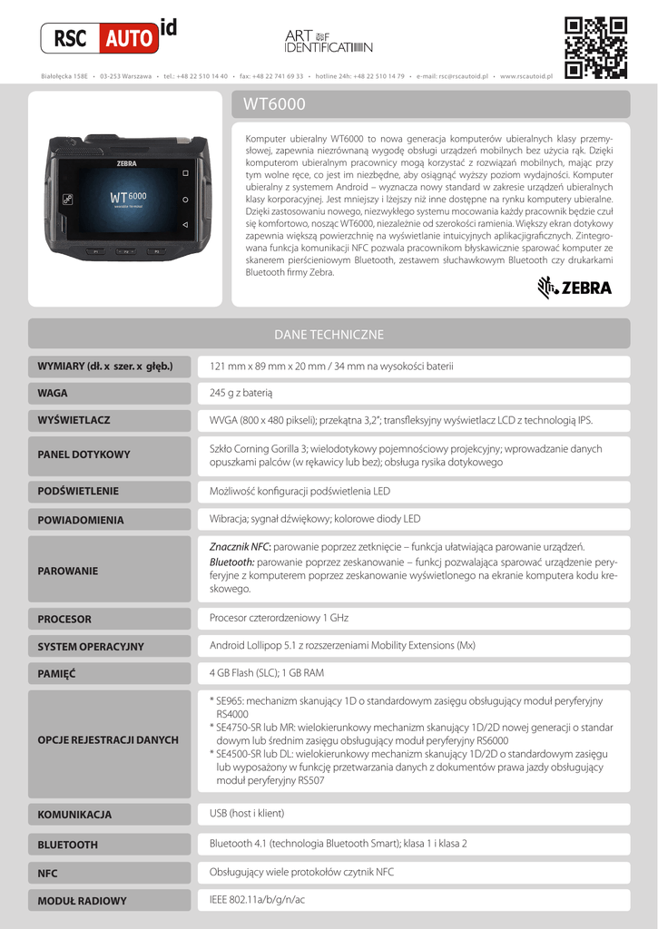 Białołęcka 158E • 03-253 Warszawa • tel.: +48+48 22 510 14 40 • fax: +48+48 22 741 69 33 • hotline 24h:24h: +48+48 22 510 14 79 • e-mail: [email protected] • www.rscautoid.pl Białołęcka 158E • 03-253 Warszawa • tel.: 22 510 14 40 • fax: 22 741 69 33 • hotline 22 510 14 79 • e-mail: [email protected] • www.rscautoid.pl WT6000 INTERMEC INTERMECPC23D PC23D Komputer ubieralny WT6000 to nowa generacja komputerów ubieralnych klasy przemysłowej, zapewnia niezrównaną wygodę obsługi urządzeń mobilnych bez użycia rąk. się Dzięki Drukarka Intermec PC23d jestjest małym gabarytowo urządzeniem, które nadaje dodo Drukarka Intermec PC23d małym gabarytowo urządzeniem, które nadaje się komputerom ubieralnym pracownicy mogą korzystać z rozwiązań mobilnych, mając przy wielu zastosowań, gdzie najczęściej potrzebna jestjest mniejsza ilość etykiet czyczy teżteż opawielu zastosowań, gdzie najczęściej potrzebna mniejsza ilość etykiet opatym wolne ręce, co jest im niezbędne, aby osiągnąć wyższy poziom wydajności. Komputer sek. Drukarka PC23d jest prosta w obsłudze. Posiada wbudowany wyświetlacz LCD. sek. Drukarka PC23d jest prosta w obsłudze. Posiada wbudowany wyświetlacz LCD. ubieralny z systemem Android – wyznacza nowy standard w zakresie urządzeń ubieralnych klasy korporacyjnej. Jest mniejszy i lżejszy niż inne dostępne na rynku komputery ubieralne. Dzięki zastosowaniu nowego, niezwykłego systemu mocowania każdy pracownik będzie czuł się komfortowo, nosząc WT6000, niezależnie od szerokości ramienia. Większy ekran dotykowy zapewnia większą powierzchnię na wyświetlanie intuicyjnych aplikacjigraficznych. Zintegrowana funkcja komunikacji NFC pozwala pracownikom błyskawicznie sparować komputer ze skanerem pierścieniowym Bluetooth, zestawem słuchawkowym Bluetooth czy drukarkami Bluetooth firmy Zebra. INTERMEC PC23D SPECYFIKACJA TECHNICZNA SPECYFIKACJA TECHNICZNA Metoda Druku Metoda Druku Max. szer. druku Max. szer. druku Max długość druku Max długość druku Termiczna Termiczna 5656 mm mm DANE TECHNICZNE 1727 mm 1727 mm 5454 mm mm 900 mm 900 mm Standardowe Standardowe WYMIARY (dł. x szer. x głęb.) 121 mm x 89 mm(RTC) x(RTC) 20 mm / 34 mm na wysokości baterii Zegar Czasu Rzeczywistego Zegar Czasu Rzeczywistego wyposażenie wyposażenie druku Prędkość druku WAGAPrędkość 8 dots/mm 8 dots/mm245 g z baterią Rozdzielczość Rozdzielczość 203 dpi 203 dpi Max. szer. etykiety Max. szer. etykiety 6060 mm mm WYŚWIETLACZ Komunikacja Komunikacja PANEL DOTYKOWY Firmware Firmware PODŚWIETLENIE Wewn. średnica Wewn. średnica rolki taśmy rolki taśmy POWIADOMIENIA Max. długość taśmy Max. długość taśmy Szerokość taśmy Szerokość taśmy Pamięć wbudowana Pamięć wbudowana PAROWANIE Fonty wbudowane Fonty wbudowane 1212 dots/mm dots/mm 300dpi 300dpi WVGA (800 x 480 pikseli); przekątna 3,2’’; transfleksyjny wyświetlacz LCD z technologią IPS. Szkło Corning Gorilla 3;Opcjonalnie: wielodotykowy pojemnościowy projekcyjny; wprowadzanie danych Standardowo: USB 2.0, USB Host Serial, parallel, WiFi, Bluetooth Standardowo: USB 2.0, USB Host Opcjonalnie: Serial, parallel, WiFi, Bluetooth opuszkami palców (w rękawicy lub bez); obsługa rysika dotykowego PL,PL, Fingerprint, ZSim (ZPLII Simulation), ESim (EPL2 Simulation), DSim (DPL Fingerprint, ZSim (ZPLII Simulation), ESim (EPL2 Simulation), DSim (DPL Simulation), XML enabled forfor SAP® AIIAII and Oracle® WMS Simulation), XML enabled SAP® and Oracle® WMS Możliwość konfiguracji podświetlenia LED 12,7mm(1/2”); 26mm (1”) 12,7mm(1/2”); 26mm (1”) Wibracja; sygnał dźwiękowy; kolorowe diody LED 91,1m lub 274,32m 91,1m lub 274,32m Znacznik NFC: parowanie poprzez zetknięcie – funkcja ułatwiająca parowanie urządzeń. 2,36” – 4,33” 2,36” – 4,33” Bluetooth: parowanie poprzez zeskanowanie –32GB) funkcj pozwalająca sparować urządzenie pery128MB Flash memory, 128MB SDRAM (opcjonalnie dodo 32GB) 128MB Flash memory, 128MB SDRAM (opcjonalnie feryjne z komputerem poprzez zeskanowanie wyświetlonego na ekranie komputera kodu kre1212 Monotype True Type fonts i 4i bitmap fonts (tylko IPL) Monotype True Type fonts 4 bitmap fonts (tylko IPL) skowego. 1D1D - wszystkie główne kody jednowymiarowe - wszystkie główne kody jednowymiarowe Procesor czterordzeniowy 1 Matrix, GHz Dot 2D2D - Aztec, Code 16K, Code 49,49, Data Matrix, Code, EAN-8, EAN-13, EAN.UCC 128, Grid Matrix, - Aztec, Code 16K, Code Data Dot Code, EAN-8, EAN-13, EAN.UCC 128, Grid Matrix, HIBC 39,39, HIBC 128, MaxiCode, MSI, PDF417, Micro PDF417, Planet, Plessey, Postnet, QR-Code, RSS-14 HIBC HIBC 128, MaxiCode, MSI, PDF417, Micro PDF417, Planet, Plessey, Postnet, QR-Code, RSS-14 Android Lollipop 5.1 z rozszerzeniami Mobility Extensions (Mx) SYSTEMTemperatura OPERACYJNY 5 –5 40˚C – 40˚C Temperatura Drukowane kody Drukowane kody PROCESOR Wilgotność PAMIĘĆ Wilgotność Waga Waga 10-80 %% bez 10-80 bez kondensacji 4kondensacji GB Flash (SLC); 1 GB RAM 1.45 kgkg 1.45 *x SE965: mechanizm 1Dx odługość) zasięgu obsługujący moduł peryferyjny 177 x 125 x 215 mm (wysokość xskanujący szerokość 177 x 125 215 mm (wysokość x szerokość xstandardowym długość) RS4000 Opcje dodatkowe Opcje dodatkowe Dyspenser Dyspenser* SE4750-SR lub MR: wielokierunkowy mechanizm skanujący 1D/2D nowej generacji o standar OPCJE REJESTRACJI DANYCH dowym lub średnim zasięgu obsługujący moduł peryferyjny RS6000 Zastosowanie Zastosowanie Opieka zdrowotna, transport, i biuro. Opieka zdrowotna, transport, handel i biuro. mechanizm skanujący 1D/2D o standardowym zasięgu * SE4500-SR lub DL:handel wielokierunkowy lub wyposażony w funkcję przetwarzania danych z dokumentów prawa jazdy obsługujący moduł peryferyjny RS507 Parametry fizyczne Parametry fizyczne Zapewniamy oprogramowanie i materiały Zapewniamy oprogramowanie i materiały eksploatacyjne renomowanych firm eksploatac