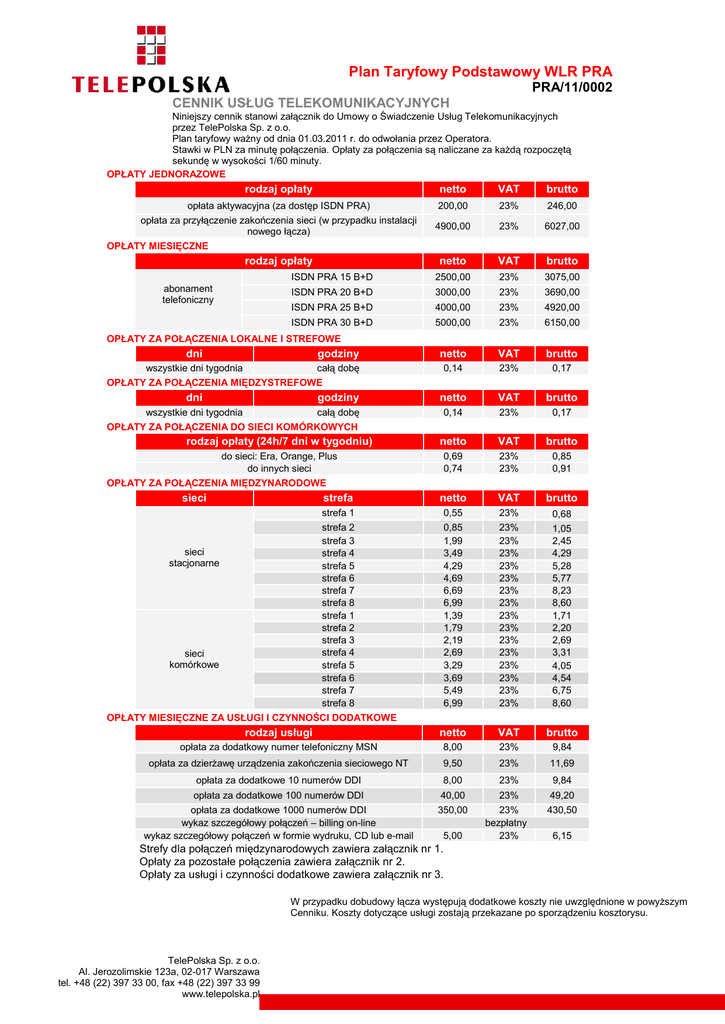 Plan taryfowy podstawowy PRA 01.03.2011 r.
