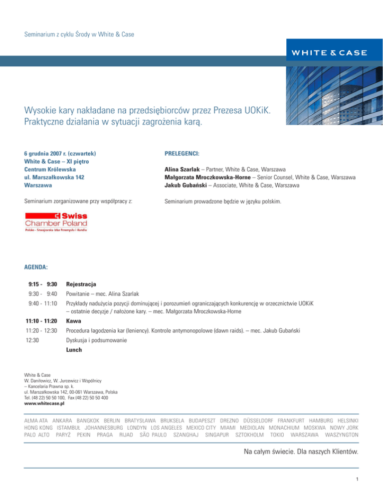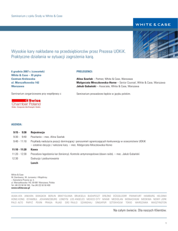 Seminarium z cyklu Środy w White & Case Wysokie kary nakładane na przedsiębiorców przez Prezesa UOKiK. Praktyczne działania w sytuacji zagrożenia karą. 6 grudnia 2007 r. (czwartek) White & Case – XI piętro Centrum Królewska ul. Marszałkowska 142 Warszawa PRELEGENCI: Seminarium zorganizowane przy współpracy z: Seminarium prowadzone będzie w języku polskim. Alina Szarlak – Partner, White & Case, Warszawa Małgorzata Mroczkowska-Horne – Senior Counsel, White & Case, Warszawa Jakub Gubański – Associate, White & Case, Warszawa AGENDA: 9:15 - 9:30 Rejestracja 9:30 - 9:40 Powitanie – mec. Alina Szarlak 9:40 - 11:10 Przykłady nadużycia pozycji dominującej i porozumień ograniczających konkurencję w orzecznictwie UOKiK – ostatnie decyzje / nałożone kary. – mec. Małgorzata Mroczkowska-Horne 11:10 - 11:20 Kawa 11:20 - 12:30 Procedura łagodzenia kar (leniency). Kontrole antymonopolowe (dawn raids). – mec. Jakub Gubański 12:30 Dyskusja i podsumowanie Lunch White & Case W. Daniłowicz, W. Jurcewicz i Wspólnicy – Kancelaria Prawna sp. k. ul. Marszałkowska 142, 00-061 Warszawa, Polska Tel. (48 22) 50 50 100, Fax (48 22) 50 50 400 www.whitecase.pl AŁMA ATA ANKARA BANGKOK BERLIN BRATYSŁAWA BRUKSELA BUDAPESZT DREZNO DÜSSELDORF FRANKFURT HAMBURG HELSINKI HONG KONG ISTAMBUŁ JOHANNESBURG LONDYN LOS ANGELES MEXICO CITY MIAMI MEDIOLAN MONACHIUM MOSKWA NOWY JORK PALO ALTO PARYŻ PEKIN PRAGA RIJAD SÃO PAULO SZANGHAJ SINGAPUR SZTOKHOLM TOKIO WARSZAWA WASZYNGTON Na całym świecie. Dla naszych Klientów. 1