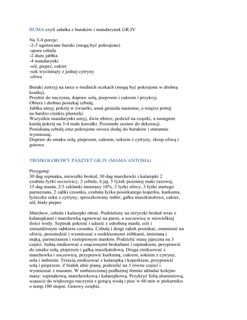 BUMA czyli sałatka z buraków i mandarynek GR.IV Na 3-4 porcje: -2-3 ugotowane buraki (mogą być pokrojone) -spora cebula -2 duże jabłka -4 mandarynki -sól, pieprz, cukier -sok wyciśnięty z jednej cytryny -oliwa Buraki zetrzyj na tarce o średnich oczkach (mogą być pokrojone w drobną kostkę). Przełóż do naczynia, dopraw solą, pieprzem i cukrem i przykryj. Obierz i drobno posiekaj cebulę. Jabłka umyj, pokrój w ćwiartki, usuń gniazda nasienne, a miąższ potnij na bardzo cienkie plasterki. Wszystkie mandarynki umyj, dwie obierz, podziel na cząstki, a następnie każdą pokrój na 3-4 małe kawałki. Pozostałe zostaw do dekoracji. Posiekaną cebulę oraz pokrojone owoce dodaj do buraków i starannie wymieszaj. Dopraw do smaku solą, pieprzem, cukrem, sokiem z cytryny, skrop oliwą i gotowe. TRÓJKOLOROWY PASZTET GR.IV (MAMA ANTOSIA) Przygotuj: 30 dag szpinaku, niewielki brokuł, 30 dag marchewki i kalarepki 2 czubate łyżki soczewicy, 2 cebule, 6 jaj, 5 łyżek pszennej maki razowej, 15 dag masła, 2/3 szklanki śmietany 18%, 2 łyżki oliwy, 3 łyżki startego parmezanu, 2 ząbki czosnku, czubata łyżka posiekanego koperku, kurkuma, łyżeczka soku z cytryny, sproszkowany imbir, gałka muszkatołowa, cukier, sól, biały pieprz Marchew, cebule i kalarepki obrać. Podzielony na różyczki brokuł wraz z kalarepkami i marchewką ugotować na parze, a soczewicę w niewielkiej ilości wody. Szpinak pokroić i udusić z odrobiną masła, soli i zmiażdżonym ząbkiem czosnku. Cebulę i drugi ząbek posiekać, zrumienić na oliwie, przestudzić i wymieszać z rozkłóconymi żółtkami, śmietaną i mąką, parmezanem i roztopionym masłem. Podzielić masę jajeczna na 3 części. Jedną zmiksować z osączonymi brokułami i szpinakiem, przyprawić do smaku solą, pieprzem i gałką muszkatołową. Druga zmiksować z marchewka i soczewicą, przyprawić kurkumą, cukrem, sokiem z cytryny, sola i imbirem. Trzecią zmiksować z kalarepką i koperkiem, przyprawić solą i pieprzem. Z białek ubić pianę, podzielić na 3 równe części i wymieszać z masami. W natłuszczonej podłużnej formie układać kolejno masy: szpinakową, marchewkową i kalarepkową. Przykryć folią aluminiową, wstawić do większego naczynia z gorącą wodą i piec w 60 min w piekarniku o temp.180 stopni. Gotowy oziębić. PASTA Z RZEŻUCHY I PIECZAREK GR.IV (MAMA ANTOSIA) Czas przygotowania: 10minut Czas gotowania: 5 minut Porcje:4 Składniki: -30 g masła -1 cebula drobno pokrojona -90 g pieczarek drobno pokrojonych -1 pęczek rzeżuchy drobno posiekanej -120 gram chudego twarogu - kilka kropli sosu sojowego -1/2 łyżeczki kminku -świeżo zmielony czarny pieprz - cząstki limonki do przybrania Przygotowanie: Roztopić masło w rondelku, na małym ogniu, dodać cebulę i smażyć aż zmięknie, ale nie zbrązowieje, mieszając od czasu do czasu. Zwiększyć ogień, dodać grzyby i smażyć 2 minuty, często mieszając. Dodać posiekana rzeżuchę i mieszać przez 30 sekund, aż rzeżucha zmięknie. Zawartość patelni wraz z serem i sosem sojowym przełożyć do miski i zmiksować. Dodać kminek i pieprz do smaku. Wyłożyć na małe miseczki lub na większy półmisek, przykryć i wstawić do lodówki na 2 godziny. Przed podaniem pasta powinna sie ściąć. Przybrać kawałkami limonki. Propozycję podania: - podawać z grzankami lub z chlebem i masłem ZUPA RZODKIEWKOWA GR.IV (MAMA MARYSI) Składniki: 3l wody, 3-4 kostki bulionu cielęcego, 3 pęczki rzodkiewek, 1/2 pęczka kopru, 3 ziemniaki, 1/4 kostki dobrego masła, mały kubek kwaśnej śmietany, 1/2 świeżego ogórka, sól, pieprz Przygotowanie: Ziemniaki myjemy, obieramy, siekamy w małą kostkę. Zagotowujemy wodę, wrzucamy kostki bulionowe i ziemniaki. Rzodkiewki myjemy, kroimy w półplasterki. W rondlu powoli roztapiamy masło i wrzucamy rzodkiewki. Dusimy na małym ogniu 2-3 minuty, uważając aby się nie zrumieniły. Gdy ziemniaki będą miękkie, dodajemy rzodkiewki uduszone z masłem. Ogórka myjemy i razem ze skórką ścieramy na tarce o dużych oczkach. Dodajemy do zupy. Koperek myjemy, osączamy i drobno kroimy. Garnek zdejmujemy z ognia i dodajemy koperek. Zupę mieszamy i zaprawiamy śmietaną. Na koniec doprawiamy solą i pieprzem do smaku. SAŁATKA OWOCOWA GR.IV (MAMA MARCINA) Porcje: na 4 osoby Składniki: 1 średniej wielkości arbuz, 1 melon, 2 gruszki, 2 brzoskwinie, kiść winogron, 1 łyżka posiekanej melisy lub mięty, sok z 1/2 cytryny Przygotowanie: Arbuza przecinamy na pół i łyżeczką wycinamy kulki z miąższu. Podobnie postępujemy z melonem. Gruszki obieramy i usuwamy gniazda nasienne, kroimy w duża kostkę. Dodajemy winogrona. Wszystkie składniki umieszczamy w wydrążonej połówce arbuza, polewamy sokiem z cytryny, mieszamy i posypujemy melisą lub liśćmi mięty.