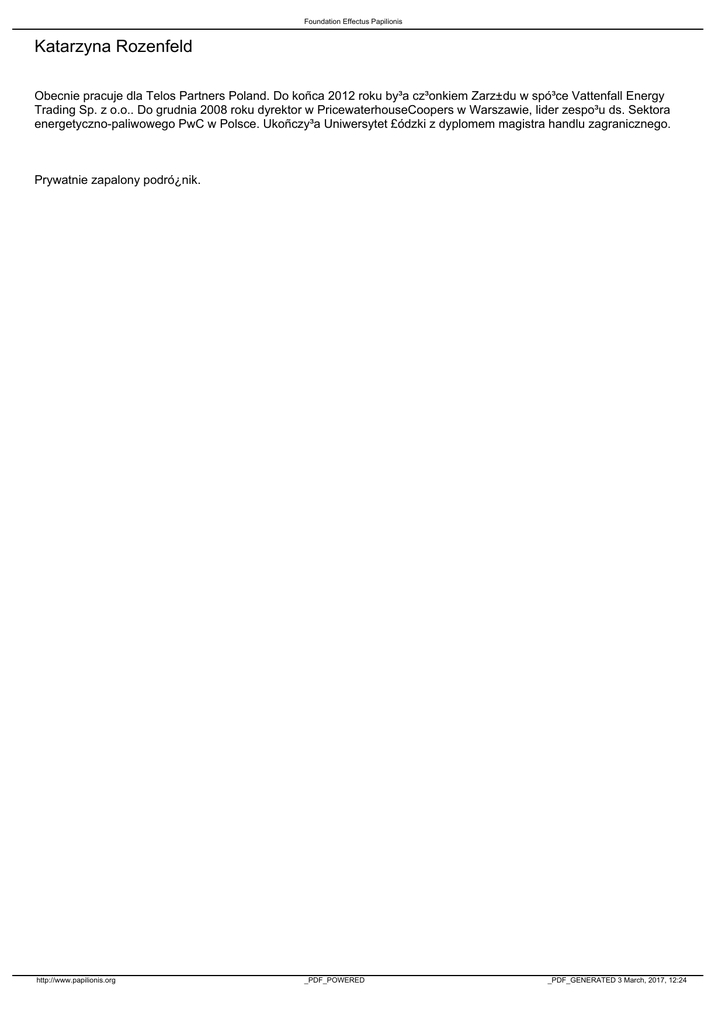 Foundation Effectus Papilionis Katarzyna Rozenfeld Obecnie pracuje dla Telos Partners Poland. Do koñca 2012 roku by³a cz³onkiem Zarz±du w spó³ce Vattenfall Energy Trading Sp. z o.o.. Do grudnia 2008 roku dyrektor w PricewaterhouseCoopers w Warszawie, lider zespo³u ds. Sektora energetyczno-paliwowego PwC w Polsce. Ukoñczy³a Uniwersytet £ódzki z dyplomem magistra handlu zagranicznego. Prywatnie zapalony podró¿nik. http://www.papilionis.org _PDF_POWERED _PDF_GENERATED 3 March, 2017, 12:24