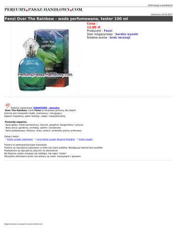Informacje o produkcie Utworzono 03-03-2017 Fenzi Over The Rainbow - woda perfumowana, tester 100 ml Cena : 12,00 zł Producent : Fenzi Stan magazynowy : bardzo wysoki Średnia ocena : brak recenzji Rodzina zapachowa: KWIATOWE - damskie Over The Rainbow marki Fenzi to kwiatowe perfumy dla kobiet. Aromat jest niezwykle rzadki, promienny i intrygujący. Zapach tropikalny, pełen fantazji, ciepły i niepowtarzalny Piramida zapachu: - Nuta głowy: kwiat pomarańczy, hiacynt, grejpfrut, bergamotka i cytryna - Nuta serca: gardenia, orchidea, jaśmin i wiciokrzew - Nuta podstawowa: hibiskus, śliwa, ambra i ambrette (piżmo ambrowe). Zobacz także : Estee Lauder [damskie] Linia Estee Lauder Beyond Paradise Estee Lauder Testery to pełnowartościowe kosmetyki. Testery są najczęściej pakowane w białe lub szare pudełka. Występują również bez pudełek. Pozbawione są najczęściej zatyczki na atomizerze. Na flakonie często znajduje się naklejka, lub napis "tester". Wszystkie oferowane przez nas testery są nowe, nieużywane i sprawne Wygenerowano w programie www.oscGold.com