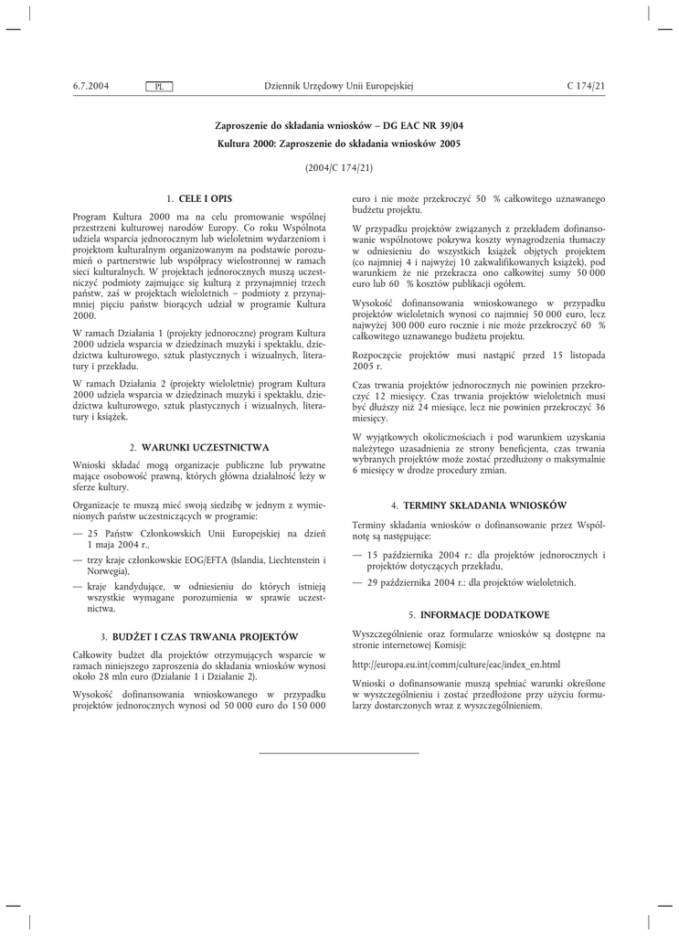 6.7.2004 Dziennik Urzędowy Unii Europejskiej PL C 174/21 Zaproszenie do składania wniosków – DG EAC NR 39/04 Kultura 2000: Zaproszenie do składania wniosków 2005 (2004/C 174/21) 1. CELE I OPIS Program Kultura 2000 ma na celu promowanie wspólnej przestrzeni kulturowej narodów Europy. Co roku Wspólnota udziela wsparcia jednorocznym lub wieloletnim wydarzeniom i projektom kulturalnym organizowanym na podstawie porozumień o partnerstwie lub współpracy wielostronnej w ramach sieci kulturalnych. W projektach jednorocznych muszą uczestniczyć podmioty zajmujące się kulturą z przynajmniej trzech państw, zaś w projektach wieloletnich – podmioty z przynajmniej pięciu państw biorących udział w programie Kultura 2000. euro i nie może przekroczyć 50 % całkowitego uznawanego budżetu projektu. W przypadku projektów związanych z przekładem dofinansowanie wspólnotowe pokrywa koszty wynagrodzenia tłumaczy w odniesieniu do wszystkich książek objętych projektem (co najmniej 4 i najwyżej 10 zakwalifikowanych książek), pod warunkiem że nie przekracza ono całkowitej sumy 50 000 euro lub 60 % kosztów publikacji ogółem. Wysokość dofinansowania wnioskowanego w przypadku projektów wieloletnich wynosi co najmniej 50 000 euro, lecz najwyżej 300 000 euro rocznie i nie może przekroczyć 60 % całkowitego uznawanego budżetu projektu. W ramach Działania 1 (projekty jednoroczne) program Kultura 2000 udziela wsparcia w dziedzinach muzyki i spektaklu, dziedzictwa kulturowego, sztuk plastycznych i wizualnych, literatury i przekładu. Rozpoczęcie projektów musi nastąpić przed 15 listopada 2005 r. W ramach Działania 2 (projekty wieloletnie) program Kultura 2000 udziela wsparcia w dziedzinach muzyki i spektaklu, dziedzictwa kulturowego, sztuk plastycznych i wizualnych, literatury i książek. Czas trwania projektów jednorocznych nie powinien przekroczyć 12 miesięcy. Czas trwania projektów wieloletnich musi być dłuższy niż 24 miesiące, lecz nie powinien przekroczyć 36 miesięcy. 2. WARUNKI UCZESTNICTWA Wnioski składać mogą organizacje publiczne lub prywatne mające osobowość prawną, których główna działalność leży w sferze kultury. Organizacje te muszą mieć swoją siedzibę w jednym z wymienionych państw uczestniczących w programie: — 25 Państw Członkowskich Unii Europejskiej na dzień 1 maja 2004 r., — trzy kraje członkowskie EOG/EFTA (Islandia, Liechtenstein i Norwegia), — kraje kandydujące, w odniesieniu do których istnieją wszystkie wymagane porozumienia w sprawie uczestnictwa. 3. BUDŻET I CZAS TRWANIA PROJEKTÓW Całkowity budżet dla projektów otrzymujących wsparcie w ramach niniejszego zaproszenia do składania wniosków wynosi około 28 mln euro (Działanie 1 i Działanie 2). Wysokość dofinansowania wnioskowanego w przypadku projektów jednorocznych wynosi od 50 000 euro do 150 000 W wyjątkowych okolicznościach i pod warunkiem uzyskania należytego uzasadnienia ze strony beneficjenta, czas trwania wybranych projektów może zostać przedłużony o maksymalnie 6 miesięcy w drodze procedury zmian. 4. TERMINY SKŁADANIA WNIOSKÓW Terminy składania wniosków o dofinansowanie przez Wspólnotę są następujące: — 15 października 2004 r.: dla projektów jednorocznych i projektów dotyczących przekładu, — 29 października 2004 r.: dla projektów wieloletnich. 5. INFORMACJE DODATKOWE Wyszczególnienie oraz formularze wniosków są dostępne na stronie internetowej Komisji: http://europa.eu.int/comm/culture/eac/index_en.html Wnioski o dofinansowanie muszą spełniać warunki określone w wyszczególnieniu i zostać przedłożone przy użyciu formularzy dostarczonych wraz z wyszczególnieniem.
