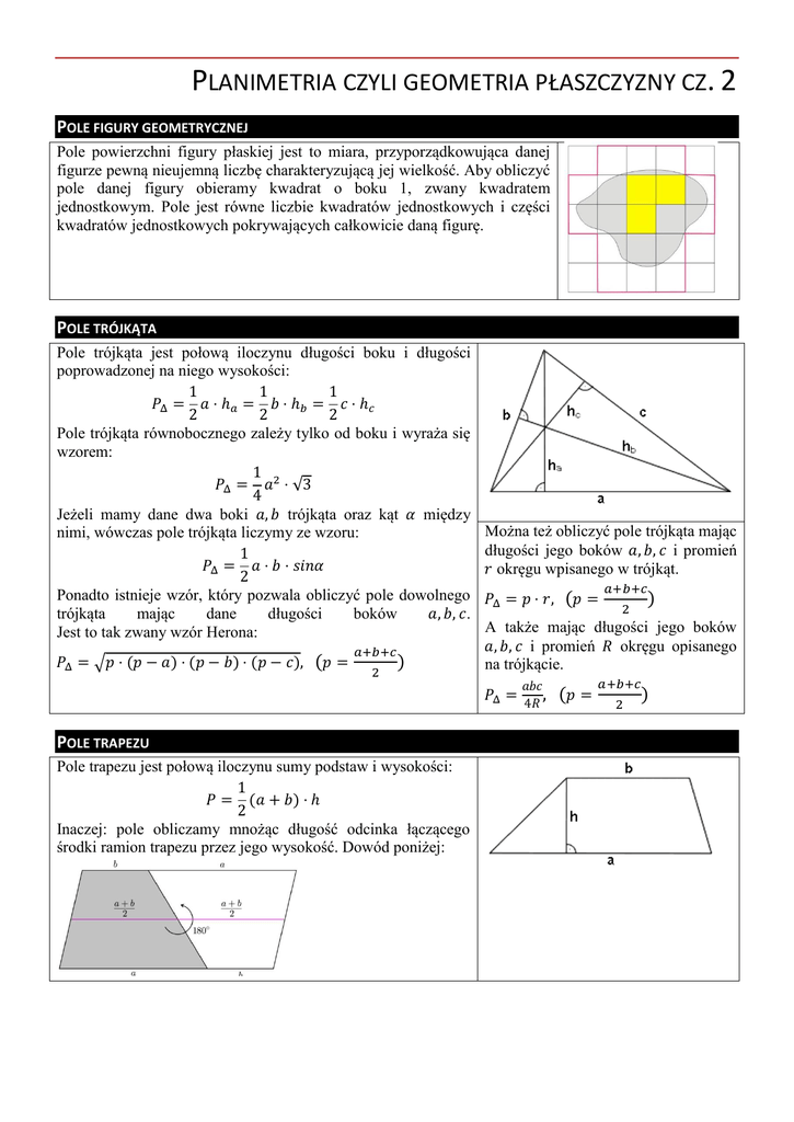 PLANIMETRIA CZYLI GEOMETRIA PŁASZCZYZNY CZ. 2 POLE FIGURY GEOMETRYCZNEJ Pole powierzchni figury płaskiej jest to miara, przyporządkowująca danej figurze pewną nieujemną liczbę charakteryzującą jej wielkość. Aby obliczyć pole danej figury obieramy kwadrat o boku 1, zwany kwadratem jednostkowym. Pole jest równe liczbie kwadratów jednostkowych i części kwadratów jednostkowych pokrywających całkowicie daną figurę. POLE TRÓJKĄTA Pole trójkąta jest połową iloczynu długości boku i długości poprowadzonej na niego wysokości: Pole trójkąta równobocznego zależy tylko od boku i wyraża się wzorem: √ Jeżeli mamy dane dwa boki trójkąta oraz kąt nimi, wówczas pole trójkąta liczymy ze wzoru: między Można też obliczyć pole trójkąta mając długości jego boków i promień okręgu wpisanego w trójkąt. Ponadto istnieje wzór, który pozwala obliczyć pole dowolnego trójkąta mając dane długości boków . A także mając długości jego boków Jest to tak zwany wzór Herona: i promień okręgu opisanego √ na trójkącie. POLE TRAPEZU Pole trapezu jest połową iloczynu sumy podstaw i wysokości: Inaczej: pole obliczamy mnożąc długość odcinka łączącego środki ramion trapezu przez jego wysokość. Dowód poniżej: POLE RÓWNOLEGŁOBOKU Pole równoległoboku (dotyczy to także rombu, prostokąta i kwadratu) jest równe iloczynowi długości dowolnego boku i poprowadzonej na niego wysokości: POLE ROMBU Pole rombu jest połową iloczynu jego przekątnych: POLE DELTOIDU Pole deltoidu również jest połową iloczynu jego przekątnych: POLE KOŁA Pole koła: POLE WYCINKA KOŁA Pole wycinka koła:
