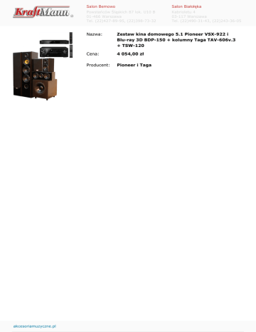 akcesoriamuzyczne.pl Salon Bemowo Salon Białołęka Powstańców Śląskich 87 lok. U10 B 01-466 Warszawa Tel. (22)427-89-95, (22)398-73-32 Kabrioletu 4 03-117 Warszawa Tel. (22)490-31-43, (22)243-36-05 Nazwa: Zestaw kina domowego 5.1 Pioneer VSX-922 i Blu-ray 3D BDP-150 + kolumny Taga TAV-606v.3 + TSW-120 Cena: 4 054,00 zł Producent: Pioneer i Taga