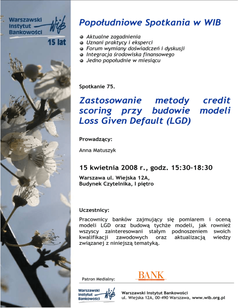 Popołudniowe Spotkania w WIB Aktualne zagadnienia Uznani praktycy i eksperci Forum wymiany doświadczeń i dyskusji Integracja środowiska finansowego Jedno popołudnie w miesiącu Spotkanie 75. Zastosowanie metody credit scoring przy budowie modeli Loss Given Default (LGD) Prowadzący: Anna Matuszyk 15 kwietnia 2008 r., godz. 15:30–18:30 Warszawa ul. Wiejska 12A, Budynek Czytelnika, I piętro Uczestnicy: Pracownicy banków zajmujący się pomiarem i oceną modeli LGD oraz budową tychŜe modeli, jak rownieŜ wszyscy zainteresowani stałym podnoszeniem swoich kwalifikacji zawodowych oraz aktualizacją wiedzy związanej z niniejszą tematyką. Patron Medialny: 1 Warszawski Instytut Bankowości ul. Wiejska 12A, 00-490 Warszawa, www.wib.org.pl Ekspert prowadzący: Anna Matuszyk - doktor nauk ekonomicznych Szkoły Głównej Handlowej w Warszawie. Zajmuje się metodami oceny ryzyka kredytowego, w szczególności metodą scoringową, prowadzi badania naukowe, sensu stricte związane z tą metodą. Brała udział w projektach doradczych dotyczących budowy modeli credit scoring dla zagranicznych instytucji finansowych, prowadzonych w ścisłej współpracy z biznesem. Autorka publikacji związanych z ryzykiem kredytowym, w tym ksiąŜki pt. „Credit scoring. Metoda zarządzania ryzykiem kredytowym.” Program: Pomiar i ocena LGD - wprowadzenie teoretyczne - Definicja PD, LGD, EAD - Czynniki ekonomiczne mające wpływ na wielkość LGD - Modele ryzyka kredytowego - Przykłady strategii odzyskiwania długu Modelowanie procesu windykacji oraz zaleglych splat na przykladzie poŜyczek osobistych oraz kart kredytowych udzielonych osobom fizycznym – przykłady z praktyki - Poziomy windykacji (model drzewa decyzyjnego) - Czynniki wpływające na spłatę długu (poŜyczki osobiste, karty kredytowe) - Modelowanie i predykcja LGD dla poŜyczek osobistych i kart kredytowych - Opis metody stosowanej w przypadku kredytow hipotecznych - Wzorce płatności Podsumowanie Odpłatność: Koszt uczestnictwa w spotkaniu: 380 zł Rabat specjalny: Weź udział w 3 spotkaniach popołudniowych. Na 4. wstęp wolny! Rabat obowiązuje w ciągu 12 miesięcy od daty pierwszego z trzech spotkań. Zgłoszenia i informacje: Zgłoszenia przyjmujemy na załączonym formularzu do 1 kwietnia 2008 r. Programem opiekuje się i chętnie udzieli wszelkich informacji Joanna Obiegałka, MenedŜer Projektów Szkoleniowych, tel. 022 826 99 24, 022 826 81 35, e-mail: [email protected] 2