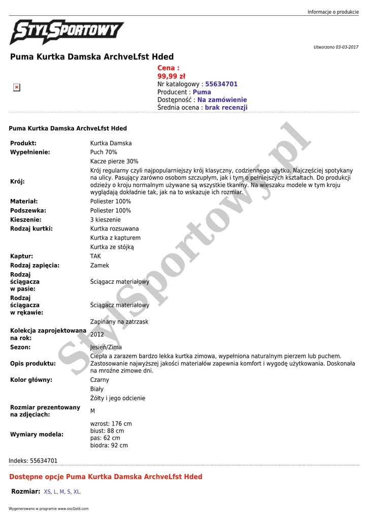 Informacje o produkcie Utworzono 03-03-2017 Puma Kurtka Damska ArchveLfst Hded Cena : 99,99 zł Nr katalogowy : 55634701 Producent : Puma Dostępność : Na zamówienie Średnia ocena : brak recenzji Produkt: Kurtka Damska Wypełnienie: Puch 70% Kacze pierze 30% pl Puma Kurtka Damska ArchveLfst Hded Materiał: Poliester 100% Podszewka: Poliester 100% Kieszenie: 3 kieszenie Rodzaj kurtki: Kurtka rozsuwana or to w y. Krój: Krój regularny czyli najpopularniejszy krój klasyczny, codziennego użytku. Najczęściej spotykany na ulicy. Pasujący zarówno osobom szczupłym, jak i tym o pełniejszych kształtach. Do produkcji odzieży o kroju normalnym używane są wszystkie tkaniny. Na wieszaku modele w tym kroju wyglądają dokładnie tak, jak na to wskazuje ich rozmiar. Kurtka z kapturem Kurtka ze stójką TAK Rodzaj zapięcia: Zamek Rodzaj ściągacza w pasie: Ściągacz materiałowy Rodzaj ściągacza w rękawie: lS p Kaptur: Ściągacz materiałowy Zapinany na zatrzask Sezon: St y Kolekcja zaprojektowana 2012 na rok: Jesień/Zima Opis produktu: Ciepła a zarazem bardzo lekka kurtka zimowa, wypełniona naturalnym pierzem lub puchem. Zastosowanie najwyższej jakości materiałów zapewnia komfort i wygodę użytkowania. Doskonała na mroźne zimowe dni. Kolor główny: Czarny Biały Żółty i jego odcienie Rozmiar prezentowany na zdjęciach: M Wymiary modela: wzrost: 176 cm biust: 88 cm pas: 62 cm biodra: 92 cm Indeks: 55634701 Dostępne opcje Puma Kurtka Damska ArchveLfst Hded Rozmiar: XS, L, M, S, XL. Wygenerowano w programie www.oscGold.com