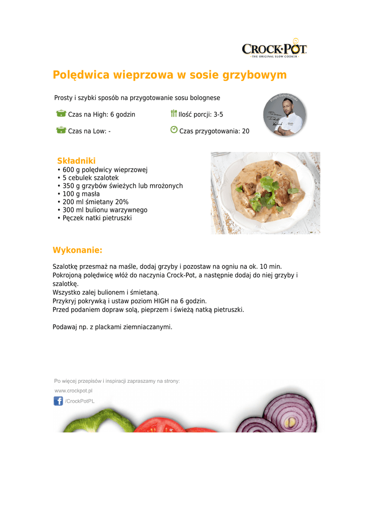 Polędwica wieprzowa w sosie grzybowym Prosty i szybki sposób na przygotowanie sosu bolognese Czas na High: 6 godzin Ilość porcji: 3-5 Czas na Low: - Czas przygotowania: 20 Składniki • 600 g polędwicy wieprzowej • 5 cebulek szalotek • 350 g grzybów świeżych lub mrożonych • 100 g masła • 200 ml śmietany 20% • 300 ml bulionu warzywnego • Pęczek natki pietruszki Wykonanie: Szalotkę przesmaż na maśle, dodaj grzyby i pozostaw na ogniu na ok. 10 min. Pokrojoną polędwicę włóż do naczynia Crock-Pot, a następnie dodaj do niej grzyby i szalotkę. Wszystko zalej bulionem i śmietaną. Przykryj pokrywką i ustaw poziom HIGH na 6 godzin. Przed podaniem dopraw solą, pieprzem i świeżą natką pietruszki. Podawaj np. z plackami ziemniaczanymi.