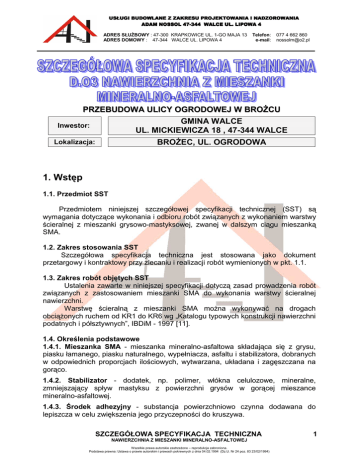 USŁUGI BUDOWLANE Z ZAKRESU PROJEKTOWANIA I NADZOROWANIA ADAM NOSSOL 4747-344 WALCE WALCE UL. LIPOWA 4 ADRES SŁUśBOWY : 47-300 KRAPKOWICE UL. 1-GO MAJA 13 ADRES DOMOWY : 47-344 WALCE UL. LIPOWA 4 Telefon: e-mail: 077 4 662 860 [email protected] PRZEBUDOWA ULICY OGRODOWEJ W BROśCU GMINA WALCE Inwestor: UL. MICKIEWICZA 18 , 47-344 WALCE BROśEC, UL. OGRODOWA Lokalizacja: 1. Wstęp 1.1. Przedmiot SST Przedmiotem niniejszej szczegółowej specyfikacji technicznej (SST) są wymagania dotyczące wykonania i odbioru robót związanych z wykonaniem warstwy ścieralnej z mieszanki grysowo-mastyksowej, zwanej w dalszym ciągu mieszanką SMA. 1.2. Zakres stosowania SST Szczegółowa specyfikacja techniczna jest stosowana jako dokument przetargowy i kontraktowy przy zlecaniu i realizacji robót wymienionych w pkt. 1.1. 1.3. Zakres robót objętych SST Ustalenia zawarte w niniejszej specyfikacji dotyczą zasad prowadzenia robót związanych z zastosowaniem mieszanki SMA do wykonania warstwy ścieralnej nawierzchni. Warstwę ścieralną z mieszanki SMA moŜna wykonywać na drogach obciąŜonych ruchem od KR1 do KR6 wg „Katalogu typowych konstrukcji nawierzchni podatnych i półsztywnych”, IBDiM - 1997 [11]. 1.4. Określenia podstawowe 1.4.1. Mieszanka SMA - mieszanka mineralno-asfaltowa składająca się z grysu, piasku łamanego, piasku naturalnego, wypełniacza, asfaltu i stabilizatora, dobranych w odpowiednich proporcjach ilościowych, wytwarzana, układana i zagęszczana na gorąco. 1.4.2. Stabilizator - dodatek, np. polimer, włókna celulozowe, mineralne, zmniejszający spływ mastyksu z powierzchni grysów w gorącej mieszance mineralno-asfaltowej. 1.4.3. Środek adhezyjny - substancja powierzchniowo czynna dodawana do lepiszcza w celu zwiększenia jego przyczepności do kruszywa. SZCZEGÓŁOWA SPECYFIKACJA TECHNICZNA NAWIERZCHNIA Z MIESZANKI MINERALNO-ASFALTOWEJ Wszelkie prawa autorskie zastrzeŜone – reprodukcja zabroniona. Podstawa prawna: Ustawa o prawie autorskim i prawach pokrewnych z dnia 04.02.1994 (Dz.U. Nr 24 poz. 83 23/02/1994) 1 USŁUGI BUDOWLANE Z ZAKRESU PROJEKTOWANIA I NADZOROWANIA ADAM NOSSOL 4747-344 WALCE WALCE UL. LIPOWA 4 ADRES SŁUśBOWY : 47-300 KRAPKOWICE UL. 1-GO MAJA 13 ADRES DOMOWY : 47-344 WALCE UL. LIPOWA 4 Telefon: e-mail: 077 4 662 860 [email protected] 1.4.4. Pozostałe określenia podstawowe są zgodne z obowiązującymi, odpowiednimi polskimi normami i definicjami podanymi w OST D.00 „Wymagania ogólne” pkt 1.4. 1.5. Ogólne wymagania dotyczące robót Ogólne wymagania dotyczące robót podano w OST D.00 „Wymagania ogólne” pkt 1.5. 2. Materiały 2.1. Ogólne wymagania dotyczące materiałów Ogólne wymagania dotyczące materiałów, ich pozyskiwania i składowania, podano w OST D.00 „Wymagania ogólne” pkt 2. 2.2. Asfalt NaleŜy stosować asfalt drogowy D-50, D-70 i D-100 spełniający wymagania określone w SST w oparciu o projekt nowelizowanej normy PN-C-96170 [9] lub asfalt modyfikowany wg wskazań producenta. 2.3. Wypełniacz NaleŜy stosować wypełniacz wapienny, spełniający wymagania określone w PN-S-96504 [5] dla wypełniacza podstawowego. 2.4. Kruszywo NaleŜy stosować kruszywo: − grysy klasy I wg PN-B-11112 [1], − piasek łamany lub mieszankę drobną granulowaną wg PN-B-11112 [1], − piasek naturalny wg PN-B-11113 [2], − Ŝwir kruszony spełniający wymagania jak dla grysu klasy I, wg PN-B-11112 [1]. 2.5. Stabilizator i środek adhezyjny Dodatek stabilizujący mieszankę SMA i środek adhezyjny, musi posiadać aprobatę techniczną, wydaną przez jednostkę uprawnioną oraz zaakceptowany przez InŜyniera. 3. Sprzęt 3.1. Ogólne wymagania dotyczące sprzętu Ogólne wymagania dotyczące sprzętu podano w OST D.00 „Wymagania ogólne” pkt 3. 3.2. Sprzęt do wykonania warstwy nawierzchni z mieszanki SMA Wykonawca przystępujący do wykonania warstwy nawierzchni z mieszanki grysowo-mastyksowej (SMA) powinien wykazać się moŜliwością korzystania z następującego sprzętu: SZCZEGÓŁOWA SPECYFIKACJA TECHNICZNA NAWIERZCHNIA Z MIESZANKI MINERALNO-ASFALTOWEJ Wszelkie prawa autorskie zastrzeŜone – reprodukcja zabroniona. Podstawa prawna: Ustawa o prawie autorskim i prawach pokrewnych z dnia 04.02.1994 (Dz.U. Nr 24 poz. 83 23/02/1994) 2 USŁUGI BUDOWLANE Z ZAKRESU PROJEKTOWANIA I NADZOROWANIA ADAM NOSSOL 4747-344 WALCE WALCE UL. LIPOWA 4 ADRES SŁUśBOWY : 47-300 KRAPKOWICE UL. 1-GO MAJA 13 ADRES DOMOWY : 47-344 WALCE UL. LIPOWA 4 Telefon: e-mail: 077 4 662 860 [email protected] − wytwórni stacjonarnej o mieszaniu cyklicznym lub ciągłym do wytwarzania mieszanek mineralno-asfaltowych, wyposaŜonej w dozownik stabilizatora, − układarek do rozkładania mieszanki mineralno-asfaltowej, − walców stalowych gładkich średnich lub cięŜkich, − rozsypywarek kruszywa w przypadku rozsypywania kruszywa na warstwie ścieralnej, − szczotek mechanicznych. 4. Transport 4.1. Ogólne wymagania dotyczące transportu Ogólne wymagania dotyczące transportu podano w OST D.00 „Wymagania ogólne” pkt 4. 4.2. Transport materiałów 4.2.1. Asfalt Transport asfaltu powinien odbywać się zgodnie z zasadami podanymi w PNC-04024 [3]. Transport asfaltów drogowych moŜe odbywać się w: − cysternach kolejowych, − cysternach samochodowych, − bębnach blaszanych, lub innych pojemnikach stalowych, zaakceptowanych przez InŜyniera. 4.2.2. Wypełniacz Wypełniacz luzem naleŜy przewozić w cysternach przystosowanych do przewozu materiałów sypkich, umoŜliwiających rozładunek pneumatyczny. Wypełniacz workowany moŜna przewozić dowolnymi środkami transportu w sposób zabezpieczony przed zawilgoceniem. 4.2.3. Kruszywo Kruszywo moŜna przewozić dowolnymi środkami transportu w sposób zabezpieczony przed zawilgoceniem, zanieczyszczeniem i zmieszaniem z innymi asortymentami materiałów. 4.2.4. Mieszanka SMA Mieszankę SMA naleŜy przewozić samochodami samowyładowczymi wyposaŜonymi w pokrowce brezentowe. W czasie tra