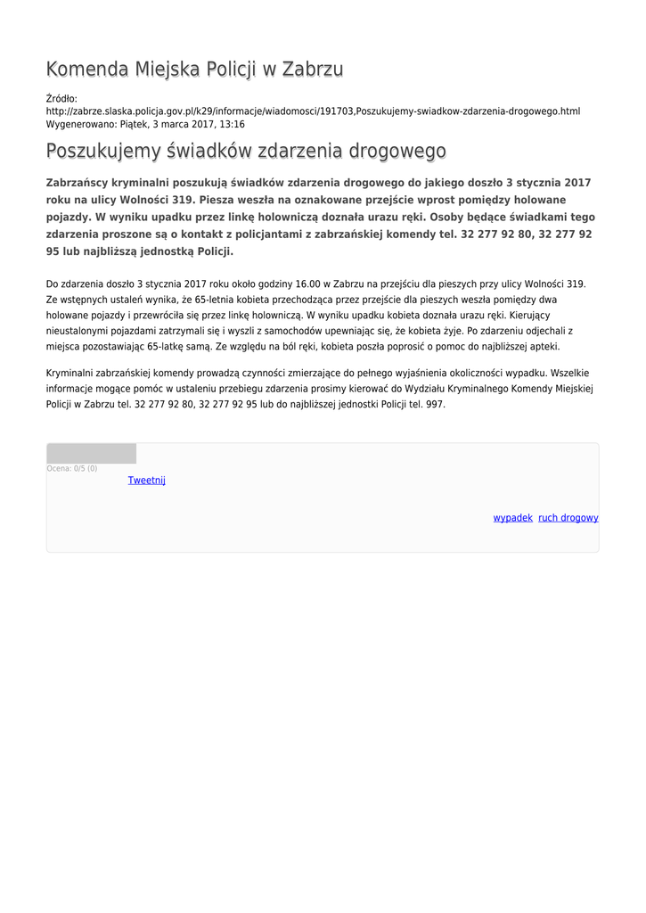 Komenda Miejska Policji w Zabrzu Źródło: http://zabrze.slaska.policja.gov.pl/k29/informacje/wiadomosci/191703,Poszukujemy-swiadkow-zdarzenia-drogowego.html Wygenerowano: Piątek, 3 marca 2017, 13:16 Poszukujemy świadków zdarzenia drogowego Zabrzańscy kryminalni poszukują świadków zdarzenia drogowego do jakiego doszło 3 stycznia 2017 roku na ulicy Wolności 319. Piesza weszła na oznakowane przejście wprost pomiędzy holowane pojazdy. W wyniku upadku przez linkę holowniczą doznała urazu ręki. Osoby będące świadkami tego zdarzenia proszone są o kontakt z policjantami z zabrzańskiej komendy tel. 32 277 92 80, 32 277 92 95 lub najbliższą jednostką Policji. Do zdarzenia doszło 3 stycznia 2017 roku około godziny 16.00 w Zabrzu na przejściu dla pieszych przy ulicy Wolności 319. Ze wstępnych ustaleń wynika, że 65-letnia kobieta przechodząca przez przejście dla pieszych weszła pomiędzy dwa holowane pojazdy i przewróciła się przez linkę holowniczą. W wyniku upadku kobieta doznała urazu ręki. Kierujący nieustalonymi pojazdami zatrzymali się i wyszli z samochodów upewniając się, że kobieta żyje. Po zdarzeniu odjechali z miejsca pozostawiając 65-latkę samą. Ze względu na ból ręki, kobieta poszła poprosić o pomoc do najbliższej apteki. Kryminalni zabrzańskiej komendy prowadzą czynności zmierzające do pełnego wyjaśnienia okoliczności wypadku. Wszelkie informacje mogące pomóc w ustaleniu przebiegu zdarzenia prosimy kierować do Wydziału Kryminalnego Komendy Miejskiej Policji w Zabrzu tel. 32 277 92 80, 32 277 92 95 lub do najbliższej jednostki Policji tel. 997. Ocena: 0/5 (0) Tweetnij wypadek, ruch drogowy