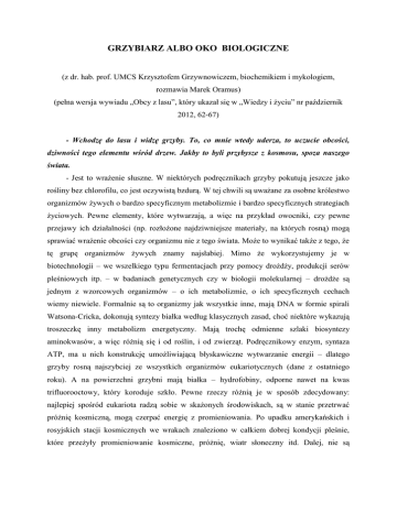 GRZYBIARZ ALBO OKO BIOLOGICZNE (z dr. hab. prof. UMCS Krzysztofem Grzywnowiczem, biochemikiem i mykologiem, rozmawia Marek Oramus) (pełna wersja wywiadu „Obcy z lasu”, który ukazał się w „Wiedzy i życiu” nr październik 2012, 62-67) - Wchodzę do lasu i widzę grzyby. To, co mnie wtedy uderza, to uczucie obcości, dziwności tego elementu wśród drzew. Jakby to byli przybysze z kosmosu, spoza naszego świata. - Jest to wrażenie słuszne. W niektórych podręcznikach grzyby pokutują jeszcze jako rośliny bez chlorofilu, co jest oczywistą bzdurą. W tej chwili są uważane za osobne królestwo organizmów żywych o bardzo specyficznym metabolizmie i bardzo specyficznych strategiach życiowych. Pewne elementy, które wytwarzają, a więc na przykład owocniki, czy pewne przejawy ich działalności (np. rozłożone najdziwniejsze materiały, na których rosną) mogą sprawiać wrażenie obcości czy organizmu nie z tego świata. Może to wynikać także z tego, że tę grupę organizmów żywych znamy najsłabiej. Mimo że wykorzystujemy je w biotechnologii – we wszelkiego typu fermentacjach przy pomocy drożdży, produkcji serów pleśniowych itp. – w badaniach genetycznych czy w biologii molekularnej – drożdże są jednym z wzorcowych organizmów – o ich metabolizmie, o ich specyficznych cechach wiemy niewiele. Formalnie są to organizmy jak wszystkie inne, mają DNA w formie spirali Watsona-Cricka, dokonują syntezy białka według klasycznych zasad, choć niektóre wykazują troszeczkę inny metabolizm energetyczny. Mają trochę odmienne szlaki biosyntezy aminokwasów, a więc różnią się i od roślin, i od zwierząt. Podręcznikowy enzym, syntaza ATP, ma u nich konstrukcję umożliwiającą błyskawiczne wytwarzanie energii – dlatego grzyby rosną najszybciej ze wszystkich organizmów eukariotycznych (dane z ostatniego roku). A na powierzchni grzybni mają białka – hydrofobiny, odporne nawet na kwas trifluorooctowy, który koroduje szkło. Pewne rzeczy różnią je w sposób zdecydowany: najlepiej spośród eukariota radzą sobie w skażonych środowiskach, są w stanie przetrwać próżnię kosmiczną, mogą czerpać energię z promieniowania. Po upadku amerykańskich i rosyjskich stacji kosmicznych we wrakach znaleziono w całkiem dobrej kondycji pleśnie, które przeżyły promieniowanie kosmiczne, próżnię, wiatr słoneczny itd. Dalej, nie są typowymi organizmami żeńskimi czy męskimi, ale mają od czterech do ośmiu płci, zależnie od grupy grzybów, które badamy. No i w ścianie komórkowej mają chitynę, jak owady. - Sądziłem, więc, że zostały one na Ziemię zawleczone z kosmosu, oczywiście nie w takiej formie jak dziś widzimy, tylko pierwociny, która potem się tu rozwinęły. - Jest taka spekulacja, bo jeszcze nie hipoteza, że grzyby były pierwszymi organizmami eukariotycznymi na Ziemi. Nie prokariota, czyli organizmy bezjądrowe, tylko właśnie grzyby, niższe eukariota. Być może zostały zawleczone z przestrzeni pozaziemskiej (hipoteza panspermii). Wiadomo, że w kilku etapach ewolucji życia na Ziemi grały bardzo ważną rolę, np. pomogły roślinom wyjść z praoceanu na ląd. - W jaki sposób? - Przez mikoryzę, jeden z najstarszych procesów symbiotycznych. Rośliny wychodząc ze środowiska wodnego na ląd potrzebowały jakiegoś organizmu, który im pomoże przyswajać azot albo minerały – i tę funkcję pełniły wtedy grzyby. W pewnym okresie grzyby wystąpiły w roli dinozaurów: roślinki miały po kilka centymetrów wysokości, a grzyby po kilka czy nawet kilkanaście metrów. Potem nastąpiło odwrócenie ról – grzyby zeszły do gleby, zaszyły się w jakichś substratach, a rośliny wybujały. Na pewno grzyby nie powstały przez „uproszczenie” roślin, to jest zupełnie niezależne królestwo i nawet, jeśli się widzi podręcznikowe drzewa pokrewieństwa organizmów żywych, to grzyby zawsze są osobne. Nie jesteśmy tylko w stanie uzgodnić, czy z nich wywodzą się rośliny i/lub zwierzęta, czy to wszystko rozwijało się równolegle od wspólnego praprzodka. Ta rzecz czeka na rozstrzygnięcie i będzie chyba kłopotliwa, bo mykologia jako nauka jest w potwornej niełasce. Może wynika to stąd, że boimy się grzybic, pleśni, grzybów trujących, a może ze zwykłego lekceważenia, nawet przez naukowców. - A może z tego, że wszyscy utożsamiają grzyby z poczciwymi kapeluszowcami z lasu. - To takie rozumienie przez Kowalskiego: grzyb to jest prawdziwek albo muchomor sromotnikowy, czyli zielonawy, jak powinno się go nazywać - a tu grzybów jest mnóstwo (szacuje się na ponad milion gatunków), w większości niewidocznych. Owocniki są tylko jednym z przejawów funkcjonowania grzyba, może ich w ogóle nie być, a tymczasem grzybnia żyje w glebie, w drewnie, w odpadkach. Poczciwą kurkę czy rydza wciągnięto już na listę gatunków zagrożonych i raptem w latach 90. kurki wysypały w całej Europie w takich ilościach, że można było ciężarówkami wozić. Po prostu grzybnia przyczaiła się w glebie i czekała na sprzyjające warunki biologiczne, klimatyczne i nie wiadomo jeszcze jakie, żeby wytworzyć owocniki. Bardzo słabo znamy styl życia grzybów, dla nas są to organizmy w pewnym sensie magiczne – niby wiemy, czym są, ale nie do końca. - Po co grzybom owocniki, skoro mogą znakomicie egzystować pod postacią grzybni? - Tego nie wiadomo, poza tym, że wysiewają jeden z typów zarodników. Nie bardzo rozumiemy, czy jest to związane z jakąś zmianą środowiskową, która stymuluje pojawianie się owocników, czy też z zagrożeniem dla grzybni, które sprawia, że owocniki muszą się wytworzyć. Część badaczy uważa, że owocniki są po to, aby wysiać zarodniki, które dostaną się na nowe miejsca, by tam założyć nowe kolonie grzybni, a inni są zdania, że jakieś warunki stresowe, np. załamanie środowiska, albo odwrotnie – właśnie komfortowe warun