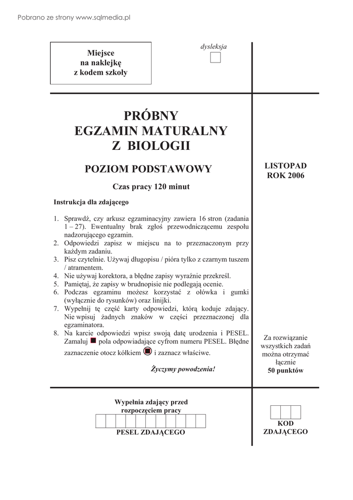 Pobrano ze strony www.sqlmedia.pl dysleksja Miejsce na naklejkĊ z kodem szkoáy PRÓBNY EGZAMIN MATURALNY Z BIOLOGII POZIOM PODSTAWOWY LISTOPAD ROK 2006 Czas pracy 120 minut Instrukcja dla zdającego 1. SprawdĨ, czy arkusz egzaminacyjny zawiera 16 stron (zadania 1 – 27). Ewentualny brak zgáoĞ przewodniczącemu zespoáu nadzorującego egzamin. 2. Odpowiedzi zapisz w miejscu na to przeznaczonym przy kaĪdym zadaniu. 3. Pisz czytelnie. UĪywaj dáugopisu / pióra tylko z czarnym tuszem / atramentem. 4. Nie uĪywaj korektora, a báĊdne zapisy wyraĨnie przekreĞl. 5. PamiĊtaj, Īe zapisy w brudnopisie nie podlegają ocenie. 6. Podczas egzaminu moĪesz korzystaü z oáówka i gumki (wyáącznie do rysunków) oraz linijki. 7. Wypeánij tĊ czĊĞü karty odpowiedzi, którą koduje zdający. Nie wpisuj Īadnych znaków w czĊĞci przeznaczonej dla egzaminatora. 8. Na karcie odpowiedzi wpisz swoją datĊ urodzenia i PESEL. Zamaluj pola odpowiadające cyfrom numeru PESEL. BáĊdne zaznaczenie otocz kóákiem i zaznacz wáaĞciwe. ĩyczymy powodzenia! Za rozwiązanie wszystkich zadaĔ moĪna otrzymaü áącznie 50 punktów Wypeánia zdający przed rozpoczĊciem pracy PESEL ZDAJĄCEGO KOD ZDAJĄCEGO Pobrano ze strony www.sqlmedia.pl Próbny egzamin maturalny z biologii Poziom podstawowy 2 Zadanie 1. (2 pkt) OdpornoĞü nieswoista obejmuje mechaniczne i chemiczne bariery przeciwko patogenom. Pierwszą zaporĊ przeciwko czynnikom chorobotwórczym stanowią powáoki ciaáa. Uzasadnij, podając dwa argumenty, Īe skóra czáowieka peáni funkcjĊ nieswoistej bariery przeciw patogenom. 1. ................................................................................................................................................. ................................................................................................................................................. ................................................................................................................................................. 2. ................................................................................................................................................. ................................................................................................................................................. ................................................................................................................................................. Zadanie 2. (1 pkt) Na rysunku przedstawiono schematycznie budowĊ krĊgosáupa czáowieka. OkreĞl, na czym polega znaczenie esowatego ksztaátu krĊgosáupa czáowieka. ................................................................................... ................................................................................... ................................................................................... ................................................................................... ................................................................................... Pobrano ze strony www.sqlmedia.pl Próbny egzamin maturalny z biologii Poziom podstawowy 3 Zadanie 3. (1 pkt) Na schemacie przedstawiono budowĊ szkieletu klatki piersiowej czáowieka. OkreĞl znaczenie, jakie dla funkcjonowania klatki piersiowej ma poáączenie Īeber z mostkiem poprzez chrząstki. ....................................................................................................................................................... ....................................................................................................................................................... ....................................................................................................................................................... Zadanie 4. (3 pkt) Na schemacie przedstawiono trzy modele stawów. a) Podaj, który ze stawów (A, B czy C) ma najwiĊkszy zakres swobody ruchów. …………. b) Podaj po jednym przykáadzie poáączenia stawowego typu A i typu C w organizmie czáowieka. A – ............................................................................................................................................... C – ............................................................................................................................................... Pobrano ze strony www.sqlmedia.pl Próbny egzamin maturalny z biologii Poziom podstawowy 4 Zadanie 5. (1 pkt) PoniĪej wymieniono róĪne elementy áuku odruchowego. A. B. C. D. E. neuron ruchowy neuron poĞredniczący miĊsieĔ dwugáowy ramienia neuron czuciowy wolne zakoĔczenie nerwowe w opuszce palca Uporządkuj te elementy (zapisując poniĪej ich symbole literowe) zgodnie z kierunkiem przewodzenia impulsu nerwowego w áuku odruchowym. ....................................................................................................................................................... Zadanie 6. (1 pkt) Cztery podstawowe smaki to: sáony, kwaĞny, sáodki, gorzki. Smak sáony kojarzy siĊ zwykle ze smakiem soli kuchennej, chociaĪ wiele innych soli daje podobne odczucie – na przykáad wodny roztwór bromku potasu o stĊĪeniu 0,2 mol/dm3. Natomiast roztwór bromku potasu o stĊĪeniu 0,01 mol/dcm3 jest odczuwany jako sáodki, a roztwór tej soli o stĊĪeniu 0,04 mol/dm3 ma smak sáono-gorzki. Na podstawie informacji zawartych w tekĞcie okreĞl, od czego zaleĪy rodzaj odczuwanego przez czáowieka smaku bromku potasu. ....................................................................................................................................................... ....................................................................................................................................................... Zadanie 7. (1 pkt) WáaĞciwy poziom jonów wapnia we krwi jest efektem antagonistycznego dziaáania dwóch hormonów – kalcytoniny i parathormonu. Kalcytonin