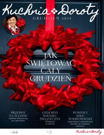 gru dzień 2 014 Jak świętować cały grudzień Przepisy na śledzie sałatka śledziowa po japońsku ozdobny Wieniec świąteczny Zrobiony w domu Pomysły idee podpowiedzi kalendzarz adwentowy buraki na wigilijny barszcz } spis treści grudzień 04 05 2014 wigilia od Doroty wspó łpracow nic y P o m y s ły 06 św iąteczny gr udzień 08 drew niane Baby Jag i 12 k alendar z adwentow y 14 w ieniec św iątec zny 1 6 fe l i e t o n 18 menu w ig ilijne 44 pomysły na prezent y Pr z e pi s y 22 buraki na barszcz 26 śledzie 34 schab ze śliwkami 38 str ucla z żuraw inami 40 ciasto piaskowe z brow nie P o d ró ż e 4 2 r a n c h o Fr o n t i e r a Odrobina formalności Zdjęcia i teksty prezentowane na tej stronie są moją własnością. Wykorzystywanie i kopiowanie ich w całości lub we fragmentach, bez mojej zgody jest zabronione (ustawa o prawie autorskim i prawach pokrewnych z dnia 04.02.1994r. Dz.U.Nr 24, poz. 83). www.grillsklep.pl Kuchnia Doroty 2 Świ ęt a B o ż ego Na r o d z en i a 2 014 Kuchnia Doroty 3 Ś w i ę t a B oż e g o Nar od z e n i a 2 014 od Dorot y } Wesołych Świąt! Współ pra cow nicy D om pachnie skórką pomarańczową, choinką i drewnem palącym się kominku. Tadzio z niecierpliwością otwiera codziennie kolejne paczuszki z kalendarza adwentowego. Ja z długą listą zakupów i wielkim koszem przemierzam sklepowe alejki. Michał stara się znaleźć czas na kupienie choinki, sprawdzenie długich sznurów choinkowych światełek. Takie są przygotowania do świąt Bożego Narodzenia w naszym domu. Lubimy je bardzo, chociaż to taki intensywny czas. W czasie świąt nie będzie wcale spokojnie, ale przecież święta są tylko raz w roku! To czas wyjątkowy po tygodniach przygotowań. Nareszcie cała nasza rodzina usiądzie przy świątecznym stole. Aż 14 osób. Będziemy się sobą cieszyć! Dorota Pawłowska autorka bloga [email protected] Kuchnia Doroty 4 Świ ęt a B o ż ego Na r o d z en i a 2 014 Bez nich nie powstałby ten numer Justyna Kadłubiska — Duthel Jest fotografką, kocha czarno-białą fotografię. Szkoła muzyczna w klasie skrzypiec nauczyła ją chodzenia do filharmonii, syn - słuchania rapu. Kocha Tatry i marzy o wyprawie w Himalaje. Zrobiła wszystkie portrety Doroty. • fifiphotography.pl Anna Luboń Agnieszka Emilia Dziennikarka, Pawłowska Piekarska — redaktor, Architekt Freudenreich producentka tv. i projektant. Artysta malarz. Na swoim blogu Projektuje domy. Specjalistka •cudkultury.pl Ma swój wkład od uszek ściga przyjemności w budowę metra wigilijnych i odkrywa cuda. warszawskiego. Lubi z grzybami W kinie, galerii, japoński minimalizm zebranymi serialu, i skandynawskie przez siebie w książkach, ciepłe klimaty. i Wojtka na czytaniu gazet, Mieszka suwalszczyźnie. piciu kawy, w najfajniejszym Rysunek w mieście, miejscu Warszawy, do felietonu w głowie, na Saskiej Kępie, strona 16 w spotkaniach z narzeczonym z ludźmi, Michałem w nowych trendach. i dwoma kotami. Uważa, że świat Kalendarz idzie zdecydownie adwentowy, w dobrym kierunku wieniec świąteczny i to każdego dnia. strona 6 i 11 Felieton strona 16 •onaarchitekci. blogspot.com Kuchnia Doroty 5 Ś w i ę t a B oż e g o Nar od z e n i a 2 014 Michał Piekarski Projektant, grafik, lubi typografię i dobre jedzenie (szczególnie pozostałości z gotowania do bloga KuchniaDoroty). Opracowanie graficzne magazynu. K a l enda r z Dorot y } 13 Świąteczny Grudzień Co można, a co trzeba Święta trwają trzy dni, ale przygotowania do nich dobrze jest zacząć wiele tygodni wcześniej. Pozwólcie, że przedstawię Wam mój grudniowy harmonogram. Lubię ten ostatni miesiąc roku, bo przygotowania to część świętowania. 1 2 3 14 sobota W centrach handlowych ostatni dobry moment na kupienie prezentów niedziela Kolejna wyprawa na zakupy. Zjedzmy obiad w ulubionej restauracji 16 17 czwartek Zamawiamy ryby w zaprzyjaźnionym sklepie niedziela Wyprawa po choinkę. Lepimy uszka (można je zamrozić) 19 piątek Zamawiamy mięsa u zaufanego rzeźnika i warzywa w ulubionym warzywniaku sobota Sprzątamy gruntownie. Pakujemy pierwsze prezenty czwartek Zamawiamy pierwsze prezenty gwiazdkowe przez internet piątek Zostawiamy mleko i ciastka dla Mikołaja. Wystawiamy buty na prezenty sobota Imieniny Św. Mikołaja Cieszymy się prezentami. poniedziałek Odbieramy warzywa. Kupujemy mięsa i marynujemy wtorek Odbieramy ryby. Pieczemy mięsa i ciasta. Nie zapomnij o manicurze 7 8 9 niedziela Układamy świąteczne menu 10 środa W sklepach internetowych zamawiamy produkty z długą datą przydatności (mąka, cukier, rodzynki, itp.) Kuchnia Doroty poniedziałek Przygotowujemy listę zakupów wtorek Sprawdzamy zapasy w naszej spiżarni 11 12 czwartek Kupujemy kolejne prezenty z listy 6 Świ ęt a B o ż ego Na r o d z en i a 2 014 piątek Odpocznijmy w piątkowy wieczór przed nami jeszcze masa pracy 22 25 /26 czwartek, piątek Wesołych i spokojnych świąt, rodzinnych spotkań i dużo radości 29 poniedziałek Zaczynamy przygotowania do Sylwestra 21 20 środa Sprawdzamy dostępność prezentów w internecie 6 18 środa Robimy wieniec świąteczny Sprawdzamy stan ozdób choinkowych wtorek Robimy listę prezentów gwiazdkowych 5 poniedziałek Kupujemy papiery, wstążki, taśmy do opakowania prezentów i na wieniec świąteczny wtorek Zapisujemy się na manicure na 23 grudnia. Na to znajdziemy chwilę czasu poniedziałek Dzieci otwierają pierwszą paczuszkę w kalendarzu adwentowym 4 15 23 24 środa Wigilia Bożego Narodzenia Ubieramy choinkę. Smażymy ryby. Nakrywamy stół do kolacji 28 27 sobota Odpoczywamy 30 wtorek Ostatnie omówienie wyjścia na huczną zabawę Kuchnia Doroty 7 niedziela Dojadamy świąteczne smakołyki 31 środa Panie zadbają o kreacje i fryzury, panowie kupują szampana Ś w i ę t a B oż e g o Nar od z e n i a 2 014 pom ysłY Dorot y Ja Są najzwyklejsze na świecie, a przecież nadzwyczaj przydatne i potrzebne. Nie sposób obejść 