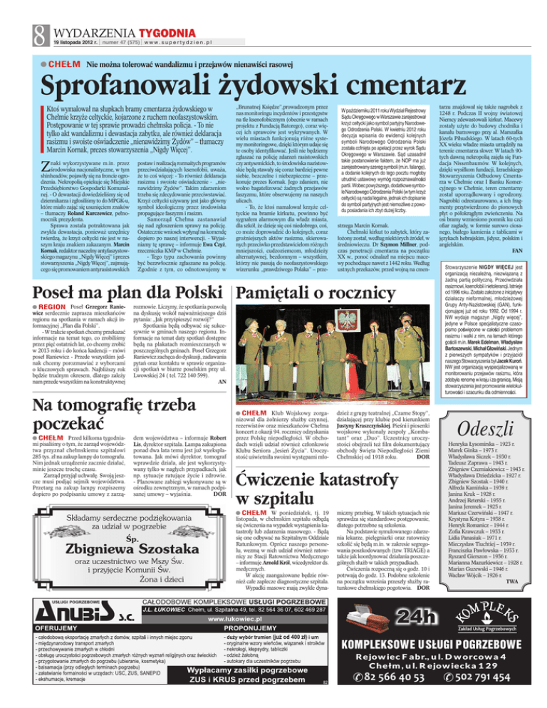 8 WYDARZENIA TYGODNIA 19 listopada 2012 r. numer 47 (575) w w w . s u p e r t y d z i e n . p l CHEŁM Nie można tolerować wandalizmu i przejawów nienawiści rasowej Sprofanowali żydowski cmentarz Ktoś wymalował na słupkach bramy cmentarza żydowskiego w Chełmie krzyże celtyckie, kojarzone z ruchem neofaszystowskim. Postępowanie w tej sprawie prowadzi chełmska policja. - To nie tylko akt wandalizmu i dewastacja zabytku, ale również deklaracja rasizmu i swoiste oświadczenie „nienawidzimy Żydów” – tłumaczy Marcin Kornak, prezes stowarzyszenia „Nigdy Więcej”. Z naki wykorzystywane m.in. przez środowiska nacjonalistyczne, w tym shinheadów, pojawiły się na froncie ogrodzenia. Nekropolią opiekuje się Miejskie Przedsiębiorstwo Gospodarki Komunalnej. - O dewastacji dowiedzieliśmy się od dziennikarza i zgłosiliśmy to do MPGK-u, które miało zająć się usunięciem znaków – tłumaczy Roland Kurczewicz, pełnomocnik prezydenta. Sprawa została potraktowana jak zwykła dewastacja, ponieważ urzędnicy twierdzą, że krzyż celtycki nie jest w naszym kraju znakiem zakazanym. Marcin Kornak, redaktor naczelny antyfaszystowskiego magazynu „Nigdy Więcej” i prezes stowarzyszenia „Nigdy Więcej”, zajmującego się promowaniem antyrasistowskich postaw i realizacją rozmaitych programów przeciwdziałających ksenofobii, uważa, że to coś więcej: - To również deklaracja rasizmu i swoiste oświadczenie - „nienawidzimy Żydów”. Takim zdarzeniom trzeba się zdecydowanie przeciwstawiać. Krzyż celtycki używany jest jako główny symbol ideologiczny przez środowiska propagujące faszyzm i rasizm. Samorząd Chełma zastanawiał się nad zgłoszeniem sprawy na policję. Ostatecznie wniosek wpłynął na komendę dopiero po naszej interwencji. - Wyjaśniamy tę sprawę – informuje Ewa Czyż, rzeczniczka KMP w Chełmie. - Tego typu zachowania powinny być bezzwłocznie zgłaszane na policję. Zgodnie z tym, co odnotowujemy w „Brunatnej Księdze”,prowadzonym przez nas monitoringu incydentów i przestępstw na tle ksenofobicznym (obecnie w ramach projektu z Fundacją Batorego), coraz więcej ich sprawców jest wykrywanych. W wielu miastach funkcjonują różne systemy monitoringowe, dzięki którym udaje się te osoby identyfikować. Jeśli nie będziemy zgłaszać na policję zdarzeń rasistowskich czy antysemickich, to środowiska nazistowskie będą stawały się coraz bardziej pewne siebie, bezczelne i niebezpieczne – przekonuje prezes Kornak. Jego zdaniem, nie wolno bagatelizować żadnych przejawów faszyzmu, które obserwujemy na naszych ulicach. - To, że ktoś namalował krzyże celtyckie na bramie kirkutu, powinno być sygnałem alarmowym dla władz miasta, dla szkół, że dzieje się coś niedobrego, coś, co może doprowadzić do kolejnych, coraz groźniejszych aktów rasizmu, skierowanych przeciwko przedstawicielom różnych mniejszości, cudzoziemcom, młodzieży alternatywnej, bezdomnym – wszystkim, którzy nie pasują do neofaszystowskiego wizerunku „prawdziwego Polaka” – prze- W październiku 2011 roku Wydział Rejestrowy Sądu Okręgowego w Warszawie zarejestrował krzyż celtycki jako symbol partyjny Narodowego Odrodzenia Polski. W kwietniu 2012 roku decyzja wpisania do ewidencji kolejnych symboli Narodowego Odrodzenia Polski została cofnięta po apelacji przez wyrok Sądu Okręgowego w Warszawie. Sąd uzasadnił takie postanowienie faktem, że NOP ma już zarejestrowany szereg symboli (m.in. falangę), a dodanie kolejnych do tego pocztu mogłoby utrudnić ustawowy wymóg rozpoznawalności partii. Wobec powyższego, dodatkowe symbole Narodowego Odrodzenia Polski (w tym krzyż celtycki) są nadal legalne, jednak ich dopisanie do symboli partyjnych jest niemożliwe z powodu posiadania ich zbyt dużej liczby. strzega Marcin Kornak. Chełmski kirkut to zabytek, który założony został, według niektórych źródeł, w średniowieczu. Dr Szymon Millner, podczas penetracji cmentarza na początku XX w., ponoć odnalazł na miejscu macewy pochodzące nawet z 1442 roku. Według ustnych przekazów, przed wojną na cmen- Poseł ma plan dla Polski Pamiętali o rocznicy REGION Poseł Grzegorz Raniewicz serdecznie zaprasza mieszkańców regionu na spotkania w ramach akcji informacyjnej „Plan dla Polski”. - W trakcie spotkań chcemy przekazać informacje na temat tego, co zrobiliśmy przez pięć ostatnich lat, co chcemy zrobić w 2013 roku i do końca kadencji – mówi poseł Raniewicz - Przede wszystkim jednak chcemy porozmawiać z wyborcami o kluczowych sprawach. Najbliższy rok będzie trudnym okresem, dlatego zależy nam przede wszystkim na konstruktywnej rozmowie. Liczymy, że spotkania pozwolą na dyskusję wokół najważniejszego dziś pytania: „Jak przyśpieszyć rozwój?” Spotkania będą odbywać się sukcesywnie w gminach naszego regionu. Informacje na temat daty spotkań dostępne będą na plakatach rozmieszczanych w poszczególnych gminach. Poseł Grzegorz Raniewicz zachęca do dyskusji, zadawania pytań oraz kontaktu w sprawie organizacji spotkań w biurze poselskim przy ul. Lwowskiej 24 ( tel. 722 140 599). AN Na tomografię trzeba poczekać CHEŁM Przed kilkoma tygodniami pisaliśmy o tym, że zarząd województwa przyznał chełmskiemu szpitalowi 285 tys. zł na zakup lampy do tomografu. Nim jednak urządzenie zacznie działać, minie jeszcze trochę czasu. Zarząd przyjął uchwałę. Swoją jeszcze musi podjąć sejmik województwa. Przetarg na zakup lampy rozpiszemy dopiero po podpisaniu umowy z zarzą- dem województwa – informuje Robert Lis, dyrektor szpitala. Lampa zakupiona ponad dwa lata temu jest już wyeksplatowana. Jak mówi dyrektor, tomograf wprawdzie działa, ale jest wykorzystywany tylko w nagłych przypadkach, jak np. sytuacje ratujące życie i zdrowie. - Planowane zabiegi wykonywane są w ośrodku zewnętrznym, w ramach podpisanej umowy – wyjaśnia. DOR Składamy serdeczne podzię