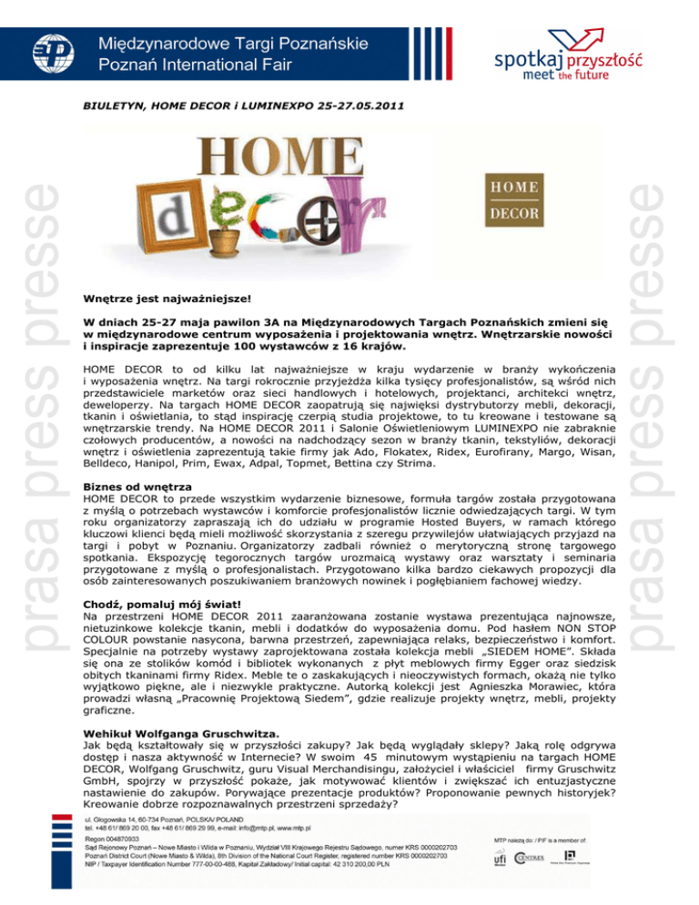 BIULETYN, HOME DECOR i LUMINEXPO 25-27.05.2011 Wnętrze jest najwaŜniejsze! W dniach 25-27 maja pawilon 3A na Międzynarodowych Targach Poznańskich zmieni się w międzynarodowe centrum wyposaŜenia i projektowania wnętrz. Wnętrzarskie nowości i inspiracje zaprezentuje 100 wystawców z 16 krajów. HOME DECOR to od kilku lat najwaŜniejsze w kraju wydarzenie w branŜy wykończenia i wyposaŜenia wnętrz. Na targi rokrocznie przyjeŜdŜa kilka tysięcy profesjonalistów, są wśród nich przedstawiciele marketów oraz sieci handlowych i hotelowych, projektanci, architekci wnętrz, deweloperzy. Na targach HOME DECOR zaopatrują się najwięksi dystrybutorzy mebli, dekoracji, tkanin i oświetlania, to stąd inspirację czerpią studia projektowe, to tu kreowane i testowane są wnętrzarskie trendy. Na HOME DECOR 2011 i Salonie Oświetleniowym LUMINEXPO nie zabraknie czołowych producentów, a nowości na nadchodzący sezon w branŜy tkanin, tekstyliów, dekoracji wnętrz i oświetlenia zaprezentują takie firmy jak Ado, Flokatex, Ridex, Eurofirany, Margo, Wisan, Belldeco, Hanipol, Prim, Ewax, Adpal, Topmet, Bettina czy Strima. Biznes od wnętrza HOME DECOR to przede wszystkim wydarzenie biznesowe, formuła targów została przygotowana z myślą o potrzebach wystawców i komforcie profesjonalistów licznie odwiedzających targi. W tym roku organizatorzy zapraszają ich do udziału w programie Hosted Buyers, w ramach którego kluczowi klienci będą mieli moŜliwość skorzystania z szeregu przywilejów ułatwiających przyjazd na targi i pobyt w Poznaniu. Organizatorzy zadbali równieŜ o merytoryczną stronę targowego spotkania. Ekspozycję tegorocznych targów urozmaicą wystawy oraz warsztaty i seminaria przygotowane z myślą o profesjonalistach. Przygotowano kilka bardzo ciekawych propozycji dla osób zainteresowanych poszukiwaniem branŜowych nowinek i pogłębianiem fachowej wiedzy. Chodź, pomaluj mój świat! Na przestrzeni HOME DECOR 2011 zaaranŜowana zostanie wystawa prezentująca najnowsze, nietuzinkowe kolekcje tkanin, mebli i dodatków do wyposaŜenia domu. Pod hasłem NON STOP COLOUR powstanie nasycona, barwna przestrzeń, zapewniająca relaks, bezpieczeństwo i komfort. Specjalnie na potrzeby wystawy zaprojektowana została kolekcja mebli „SIEDEM HOME”. Składa się ona ze stolików komód i bibliotek wykonanych z płyt meblowych firmy Egger oraz siedzisk obitych tkaninami firmy Ridex. Meble te o zaskakujących i nieoczywistych formach, okaŜą nie tylko wyjątkowo piękne, ale i niezwykle praktyczne. Autorką kolekcji jest Agnieszka Morawiec, która prowadzi własną „Pracownię Projektową Siedem”, gdzie realizuje projekty wnętrz, mebli, projekty graficzne. Wehikuł Wolfganga Gruschwitza. Jak będą kształtowały się w przyszłości zakupy? Jak będą wyglądały sklepy? Jaką rolę odgrywa dostęp i nasza aktywność w Internecie? W swoim 45 minutowym wystąpieniu na targach HOME DECOR, Wolfgang Gruschwitz, guru Visual Merchandisingu, załoŜyciel i właściciel firmy Gruschwitz GmbH, spojrzy w przyszłość pokaŜe, jak motywować klientów i zwiększać ich entuzjastyczne nastawienie do zakupów. Porywające prezentacje produktów? Proponowanie pewnych historyjek? Kreowanie dobrze rozpoznawalnych przestrzeni sprzedaŜy? Dobrze zrównowaŜone i zróŜnicowane metody marketingowe? Podczas wykładu dowiemy się, co tak naprawdę w dzisiejszych czasach jest kluczem do handlowego sukcesu. „Clicks Meet Bricks”, 26 maja, godz. 12:00-12:45, pawilon 3A e-sklep w praktyce Podczas warsztatów „skuteczna e-sprzedaŜ” będzie moŜna dowiedzieć się jak internauta postrzega stronę www i e-sklep. Przedstawione zostaną równieŜ sposoby monitorowania klienta w Internecie oraz podpowiedzi jak stworzyć skuteczną nawigację w e-sklepie, tak, aby klient kupił więcej. Udział w warsztatach to gwarancja zdobycia umiejętności i wiedzy pozwalającej stworzyć i rozwinąć swój własny e-biznes. Szkolenie poprowadzi dr Marek Borowiński, konsultant, doradca i szkoleniowiec wielu firm. „Skuteczna e-sprzedaŜ”, 25 maja, godz. 14:00-17:00, pawilon 3A Misja: sprzedaŜ Co zrobić, by zwiększyć liczbę klientów odwiedzających nasz sklep nawet w czasie, gdy większość sklepów odnotowuje spadek odwiedzin konsumentów? Jak podnieść odsetek klientów robiących u nas zakupy? Jakie narzędzia marketingowe warto zastosować, by osiągnąć efekty sprzedaŜowe przy niewielkich nakładach finansowych? Jak zwiększyć sprzedaŜ w sklepie poprzez akcje promocyjne w miejscu sprzedaŜy, podczas targów HOME DECOR, opowie Jerzy Osika, właściciel i prezes firmy Promedia. „Jak zwiększyć sprzedaŜ w sklepie poprzez akcje promocyjne w miejscu sprzedaŜy”, 26 maja, godz. 13:00-13:45, pawilon 3A Chroń swój DESIGN Design to w branŜy wnętrz sprawa szczególnie istotna, często decydująca o przewadze konkurencyjnej firmy. Dobry wzór to jednak nie wszystko, kluczową rolę dla utrzymania przewagi konkurencyjnej niejednokrotnie odgrywa umiejętność ochrony projektu przed nieuczciwymi praktykami konkurencji. Podczas targów HOME DECOR zaplanowano wykład poświęcony tej kwestii - ochronie wyglądu produktu i wzornictwa przemysłowego w Polsce i UE . Małgorzata ZielińskaŁazarowicz, rzecznik patentowy oraz Joanna Piłka, specjalista ds. wzornictwa przemysłowego podczas niespełna godzinnego wystąpienia opowiedzą jak skutecznie chronić produkt, jak dochodzić swoich praw oraz jak zapobiec wykorzystaniu swojego dorobku intelektualnego przez konkurencję. „Chroń swój Design”, 25 maja, godz. 13:00-13:45, pawilon 3A Wnętrza, Wzornictwo, Architektura! Odwiedzający targi HOME DECOR będę mieli równieŜ wyjątkową okazję uczestniczyć w prestiŜowych wydarzeniach dedykowanych wzornictwu i architekturze. W dniach 25-28 maja na terenie Międzynarodowych Targów Poznańskich, w bezpośrednim sąsiedztwie ekspozycji HOME DECOR, zlokalizowane zostały ciesz