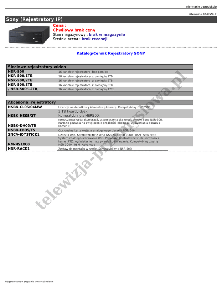 Informacje o produkcie Utworzono 03-03-2017 Sony (Rejestratory IP) Cena : Chwilowy brak ceny Stan magazynowy : brak w magazynie Średnia ocena : brak recenzji Katalog/Cennik Rejestratory SONY Sieciowe rejestratory wideo NSR-500 NSR-500/1TB NSR-500/2TB NSR-500/8TB , NSR-500/12TB, 16 kanałów rejestratora- bez pamięci pl 16 kanałów rejestratora- z pamięcią 1TB 16 kanałów rejestratora- z pamięcią 2TB ze m ys lo w 16 kanałów rejestratora- z pamięcią 12TB a. 16 kanałów rejestratora- z pamięcią 8TB Akcesoria: rejestratory NSBK-CL05/04MW Licencja na dodatkową 4 kanałową kamerę. Kompatybilny z NSR500 NSBK-HS05/2T 2 TB twardy dysk. Kompatybilny z NSR500. nowoczensa karta akceleracji, przeznaczoną dla rejestratorów Sony NSR-500. Karta ta pozwala na zwiększenie prędkości lokalnego wyświetlania obrazu z kamer IP. NSBK-DH05/TS NSBK-EB05/TS SNCA-JOYSTICK1 Opcjonalna karta wejścia analogowego dla serii NSR-500 Dżojstik USB. Kompatybilny z serią NSR-500, NSR-1000 i RSM- Advanced System zdalnego sterowania USB. Pozwalają kontrolować wiele serwerów i kamer PTZ, wyświetlanie, nagrywanie i odtwarzanie. Kompatybilny z serią NSR-1000 i RSM- Advanced RM-NS1000 NSR-RACK1 te le w iz ja -p r Zestaw do montażu w szafie. Kompatybilny z NSR-500. Wygenerowano w programie www.oscGold.com