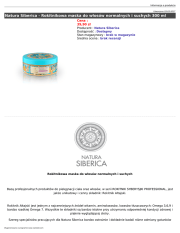 Informacje o produkcie Utworzono 03-03-2017 Natura Siberica - Rokitnikowa maska do włosów normalnych i suchych 300 ml Cena : 39,90 zł Producent : Natura Siberica Dostępność : Dostępny Stan magazynowy : brak w magazynie Średnia ocena : brak recenzji Rokitnikowa maska do włosów normalnych i suchych Bazą profesjonalnych produktów do pielęgnacji ciała oraz włosów, w serii ROKITNIK SYBERYSJKI PROFESSIONAL, jest jakże unikatowy i cenny składnik: Rokitnik Ałtajski. Rokitnik Ałtajski jest jednym z najcenniejszych źródeł witamin, aminokwasów, kwasów tłuszczowych: Omega 3,6,9 i bardzo rzadkiej Omega 7. Wszystkie te składniki są bardzo istotne przy utrzymaniu odpowiedniej kondycji zdrowej i pięknie wyglądającej skóry. Szereg specjalistów pracujących dla Natura Siberica bardzo ostrożnie i dokładnie badali różne odmiany gatunków Wygenerowano w programie www.oscGold.com rokitnika z całego świata, aż w końcu doszli do wniosku, że Rokitnik Ałtajski jest najbardziej użyteczny, posiada szerokie właściwości uzdrawiające oraz jest bardzo bogaty w substancje, które są niezwykle istotne dla prawidłowego funkcjonowania naszego całego organizmu. Ze względu na trudne warunki klimatyczne, w jakich żyje rokitnik, posiada on właściwości adaptogenne, które są wykorzystywane jako pomoc przy zachowaniu pięknego i zdrowego wyglądu. Olej z Rokitnika Ałtajskiego ma idealne zastosowanie w trosce o nasze ciało, twarz i włosy. Wszystkie produkty z serii ROKITNIK SYBERYJSKI PROFFESSIONAL zawierają najwyższe stężenie dopuszczalne na rynku organicznego wyciągu z Ałtajskiego Rokitnika, wytwarzanego przez wytłaczanie na zimno ręcznie zbieranych jagód. Dodatkowo otrzymany olej dostarcza organicznych komponentów i aktywnych składników, które znaleźć można w kosmetykach profesjonalnej linii do włosów. To między innymi one dbają o ich piękny wygląd, nadają połysk i poprawiają strukturę. Maska do włosów na bazie oleju z rokitnika ałtajskiego, marokańskiego oleju arganowego i oleju z białego lnu syberyjskiego sprzyjają wykształceniu keratyny zapewniając włosom trwałość i blask. Olej z igieł sosny karłowatej i dzikiego syberyjskiego chmielu odżywiają, zapewnia intensywne nawilżenie i regeneruje. Proteiny jedwabiu wygładzają powierzchnię włosów i zachowują wilgoć głęboko w strukturze. Maska sprawia, że włosy są bardzo miękkie i mocne, ułatwia rozczesywanie. Produkt nie zawiera: parabenów, SLS, PEG, SLES, olei mineralnych, silikonów, składników pochodzenia zwierzęcego. Stosowanie: Włosy normalne i suche. Sposób użycia: Na umyte, wilgotne włosy równomiernie nanieść niewielką ilość maski, pozostawić ją na włosach na ok 10 min, po czym dokładnie spłukać ciepłą wodą. Najlepsze efekty przy stosowaniu maski 2-3 razy w tygodniu. Zawartość: 300 ml Skład INCI: Aqua, Cetearyl Alcohol, Olea Europaea Fruit Oil, Cetrimonium Chloride, Cetyl Esters, Behentrimonium Chloride, Glyceryl Stearate, Bis-Cetearyl Amodimethicone, Cyclopentasiloxane, Hydrolyzed Wheat Protein, Panthenol, Tocopheryl Acetate, Humulus Lupulus Flower Extract, Arctium Lappa Root Extract, Urtica Dioica Leaf Extract, Aquilegia Sibirica Extract, Linum Usitatissimum Seed Oil, Hippophae Rhamnoides Fruit Oil, Simmondsia Chinensis (Jojoba) Oil, Pinus Sibirica Seed Oil, Hippophae Rhamnoidesamidopropyl Betaine, Hydrolyzed Silk, Silicone Quaternium-18, Trideceth-6, Trideceth-12, Glyceryl Linoleate, Glyceryl Oleate, Glyceryl Linolenate, Pinus Pumila Oil, Helianthus Annuus (Sunflower) Seed Oil, Hydroxyethylcellulose, Sodium Ascorbyl Phosphate, Sodium Lactate, Arginine, Aspartic Acid, Benzyl Alcohol, Benzoic Acid, Sorbic Acid, Citric Acid, Parfum, CI 16255, CI 19140. Producent: Natura Siberica, Yuzhnobutovskaya 18A, 101, Moskwa, 117042, Rosja Podmiot reprezentujący: OÜ EUROBIO LAB, Uus-Sadama tn 21, Harju maakond, 10120 Tallin EE. Certyfikat ICEA Informacje o produkcie ICEA (Istituto per la Certificazione Etica ed Ambientale włoski Instytut certyfikujący produkty wg etyki środowiskowej). Jeden z najważniejszych organów certyfikujących produkty naturalne oraz organiczne we Włoszech i Europie. Uznany przez Ministerstwo Rolnictwa i Leśnictwa kontroluje pochodzenie zastosowanych surowców roślinnych, a w szczególności proweniencję ekstraktów i olejków eterycznych pochodzących z upraw ekologicznych (zgodnie z rozporządzeniem EWG 2092/91). Instytut we współpracy z różnymi producentami, opracował standardy dla kosmetyków przyjaznych środowisku. Zajmuje się nie tylko listą certyfikowanych produktów, ale także samych składników. Kosmetyki certyfikowane przez ICEA spełniają oczekiwania klientów w odniesieniu do zdrowych, bezpiecznych produktów o bezpiecznym wpływie na środowisko. Aby kosmetyk mógł otrzymać certyfikat ICEA: - nie może zawierać substancji modyfikowanych genetycznie; - nie może zawierać komponentów zawartych na liście niedozwolonych składników; - nie może być testowany na zwierzętach; - nie może być poddany promieniowaniu jonizującemu; - musi zawierać certyfikowane, ekologiczne składniki; - jasno określone i łatwo weryfikowalne zasady korelacji między surowcami naturalnymi a produktem końcowym, czyli kosmetykiem; - produkty i procesy produkcji muszą być przyjazne dla środowiska i ludzkiego zdrowia; - musi być stworzony wg zasady zrównoważonego rozwoju środowiska; - musi być wytworzony wyłącznie z surowców pochodzących z upraw ekologicznych; - powinien mieć minimalnie negatywny wpływ na środowisko poprzez stosowanie opakowań nadających się do recyklingu (promowane są opakowania z odnawialnych surowców, materiałów nadających się do recyklingu lub otrzymane ze zwrotu pustych opakowań); - musi być przebadany dermatologicznie. Kosmetyki nie zawierają sztucznych tłuszczy, olejów, silikonów, parafiny, syntetycznych składników chemicznych, parabenów i innych subs