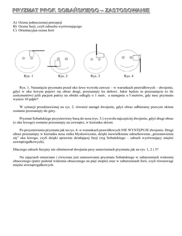 PRYZMAT PRYZMAT PROF. PROF. SOBAŃS SOBAŃSKIEGO KIEGO –– ZASTOSOWANIE ZASTOSOWANIE A) Ocena jednoczesnej percepcji B) Ocena fuzji, czyli odruchu wyrównującego C) Orientacyjna ocena forii Rys. 1 Rys. 2 Rys. 3 Rys. 4 Rys. 1. Nasunięcie pryzmatu przed oko lewe wywoła zawsze – w warunkach prawidłowych – dwojenie, gdyż w oku lewym pojawi się obraz drugi, przesunięty ku dołowi. Jakie będzie to przesunięcie (o ile centymetrów) jeśli pacjent patrzy na obiekt odległy o 1 metr, a następnie o 5 metrów, gdy moc pryzmatu wynosi 10 pdptr? W sytuacji przedstawionej na rys. 2. również nastąpi dwojenie, gdyż obraz odbieramy prawym okiem zostanie przesunięty do góry. Pryzmat Sobańskiego przystawiony bazą do nosa (rys. 3.) wywoła najczęściej dwojenie, gdyż drugi obraz (z oka lewego) zostanie przesunięty na zewnątrz, w kierunku skroni. Po przystawieniu pryzmatu jak na rys. 4. w warunkach prawidłowych NIE WYSTĘPUJE dwojenie. Drugi obraz przesunięty w kierunku nosa znika błyskawicznie, dzięki niewielkiemu odruchowemu „przestawieniu się” oka lewego, czyli dzięki sprawnie działającej fuzji (wg Sobańskiego – odruch wyrównujący mięśni zewnątrzgałkowych). Dlaczego odruch fuzyjny nie eliminował dwojenia przy ustawieniach pryzmatu jak na rys. 1, 2 i 3? Na zajęciach omawiane i ćwiczone jest zastosowanie pryzmatu Sobańskiego w zaburzeniach widzenia obuocznego (patrz podział widzenia obuocznego na pięć stopni) oraz w zaburzeniach forii, czyli równowagi mięśni zewnątrzgałkowych. OBJAŚNIENIE DLA RODZICÓW Człowiek posiada dwoje oczu, aby widzieć otaczający świat przestrzennie, trójwymiarowo, stereoskopowo. Oczy oddalone są od siebie o około 6 cm i każde oko widzi oglądany przedmiot jakby trochę z innej strony. Oba te minimalnie różne obrazy zlewają się w jeden pełny, sumaryczny obraz w „centrali widzenia”, czyli w korze mózgowej okolicy potylicznej. Tego obuocznego widzenia uczymy się w pierwszych dwóch latach życia. Ta nauka jest utrudniona w mniejszym lub większym stopniu, gdy ostrość wzroku jest w każdym oku inna (na skutek wad wzroku), lub gdy są jakieś zmiany chorobowe w siatkówkach, albo mięśniach poruszających gałkami (jedno oko poruszane jest sześcioma mięśniami, sprawne „równoległe” poruszanie obiema gałkami wymaga harmonijnej współpracy aż dwunastu mięśni). Pominiemy tu omawianie różnych rodzajów zezów i różnych głębokości upośledzenia widzenia obuocznego, pominiemy też wskazania do leczenia zachowawczego bądź operacyjnego. Omawiane tu ćwiczenia widzenia obuocznego z pryzmatem (wg Sobańskiego), mogą być, czy raczej powinny być uzupełnieniem „profesjonalnych” ćwiczeń, które zalecił leczący dziecko okulista. Ćwiczenia owe przeprowadza się w poradniach leczenia zeza i niedowidzenia z wykorzystaniem różnych skomplikowanych aparatów (synoptofor, pleoptofor, lokalizofor, centrofor). ĆWICZENIA WIDZENIA OBUOCZNEGO PRYZMATEM Ćwiczenia z pryzmatem można wykonywać z dzieckiem w domu. Starsze dzieci z łatwością ćwiczą samodzielnie. Rys 1, Rys 2 Rys 3 Rys 4 Rys 5 Nie przystawiajmy dziecku pryzmatu tak jak to pokazano na rys. 3, 4, 5, to bezcelowe. Pryzmat przystawiamy zawsze podstawą (szerszą częścią, gdzie jest przyklejona rączka) do skroni, przed jednym, potem przed drugim okiem – jak to pokazano na rysunku 1 i 2. Oczy zawsze otwarte, żadnego nie zamykamy ! Odległość pryzmatu od oka to 3-5 cm, aby nie dotknąć rogówki. Przystawienie pryzmatu w ten sposób powinno wywołać krótkotrwałe dwojenie, „rozjechanie się” obrazów w poziomie. Krótkotrwałe to znaczy trwające powiedzmy sekundę. Chodzi o to, aby w tym czasie oko patrzące przez pryzmat wykonało odruchowo i szybko pewien niewielki ruch (zwrot) umożliwiający ponowne zlanie się dwóch obrazów w jeden (tzw. fuzję). Odsunięcie pryzmatu na bok powinno także wywołać krótkotrwałe podwójne widzenie. Jeśli przystawienie pryzmatu we właściwy sposób wywoła dwojenie trwające kilka, czy kilkanaście sekund to sytuacja nie jest dobra i należy ćwiczyć, aby czas dwojenia skrócić do minimum. Jeśli dwojenie trwa i trwa – dziecko powinno „siłą woli” doprowadzić do fuzji, czyli zlania się obrazów. Gdy obrazy się zleją i dwojenie ustąpi należy po krótkiej chwili (1-2-3 sekundy) odsunąć pryzmat na bok. Po kilku sekundach przerwy znów przystawiamy pryzmat itd. Jak ćwiczyć? Jedna seria to: 10 przystawień przed oko prawe, patrząc w dal na przynajmniej kilka metrów 10 przystawień przed oko lewe, patrząc w dal na przynajmniej kilka metrów (np. TV) 10 przystawień przed oko prawe, patrząc do bliży na przedmiot odległy o 30-40 cm 10 przystawień przed oko lewe, patrząc do bliży na przedmiot odległy o 30-40 cm W ciągu dnia dziecko powinno wykonać 3-4 serie ćwiczeń. Małe dziecko powinno przeprowadzić więcej serii ćwiczeń w ciągu dnia, ale ilość „przystawień” może być mniejsza.