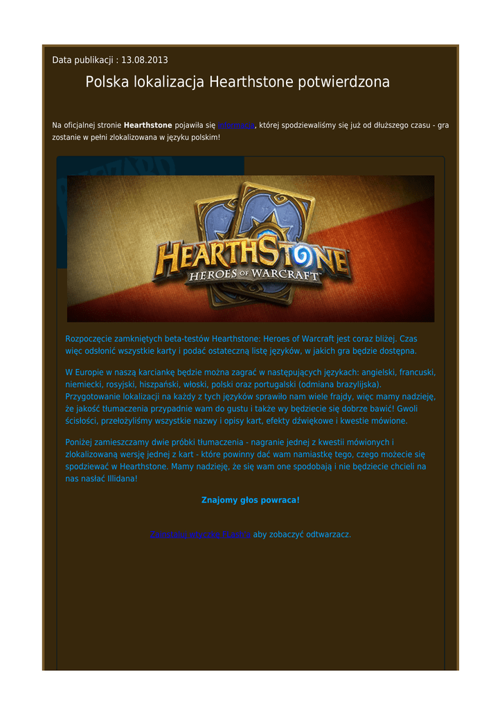 Data publikacji : 13.08.2013 Polska lokalizacja Hearthstone potwierdzona Na oficjalnej stronie Hearthstone pojawiła się informacja, której spodziewaliśmy się już od dłuższego czasu - gra zostanie w pełni zlokalizowana w języku polskim! Rozpoczęcie zamkniętych beta-testów Hearthstone: Heroes of Warcraft jest coraz bliżej. Czas więc odsłonić wszystkie karty i podać ostateczną listę języków, w jakich gra będzie dostępna. W Europie w naszą karciankę będzie można zagrać w następujących językach: angielski, francuski, niemiecki, rosyjski, hiszpański, włoski, polski oraz portugalski (odmiana brazylijska). Przygotowanie lokalizacji na każdy z tych języków sprawiło nam wiele frajdy, więc mamy nadzieję, że jakość tłumaczenia przypadnie wam do gustu i także wy będziecie się dobrze bawić! Gwoli ścisłości, przełożyliśmy wszystkie nazwy i opisy kart, efekty dźwiękowe i kwestie mówione. Poniżej zamieszczamy dwie próbki tłumaczenia - nagranie jednej z kwestii mówionych i zlokalizowaną wersję jednej z kart - które powinny dać wam namiastkę tego, czego możecie się spodziewać w Hearthstone. Mamy nadzieję, że się wam one spodobają i nie będziecie chcieli na nas nasłać Illidana! Znajomy głos powraca! Zainstaluj wtyczkę FLash'a aby zobaczyć odtwarzacz. Polska wersja Hearthstone nadchodzi! CZY JESTEŚCIE GOTOWI?! Jeżeli jeszcze nie zapisaliście się do beta-testów Hearthstone, nie narażajcie się Wyżerowi i zgłoście chęć udziału w europejskiej becie tutaj. Autor: Sigmar Liczba wyświetleń strony: 4225 Data publikacji : 13.08.2013 Tagi: lokalizacja Komentarz (4) dodaj komentarz Dzięki za zamieszczenie newsa. Nieoficjalne info stało się właśnie oficjalne ;)~Ch3rry 2013/08/13 12:57 Świetna wiadomość. Mogli by jednak dorobić te ogonki do czcionki po ludzku. Stać ich na wszystko a czcionki porządnie nie mogą poprzerabiać :) Mam na myśli czcionka, którą jest napisane Wyżer.Zdecydowanie brak polskich znaków dla wersji Bold :P czy coś. Mam nadzieję, że to poprawią do premiery.~Rayner 2013/08/13 15:40 wątpię szczerze, że to poprawią Rayner. Weźmy na przykład Diablo 2 - gdzie czcionka Polska była beznadziejna w przeciwieństwie do wersji Angielskiej. Ale to tylko moje gdybanie.~karczoh123 2013/08/13 20:28 ja pierdziele kiedy to bylo a tu jakis znow o diablo 2 smeci, za to w diablo3 wszystko jakos zrobili jak nalezy, oprocz samej gry ... wiec napewno to zrobia. cholerni malkontenci.~xenn 2013/08/16 12:35 dodaj komentarz Pozostałe nowości Nowy bohater w Hearthstone - Lady Liadrin Blizzard postanowił zaskoczyć wszystkich udostępniając nowego bohatera do Hearthstone, którego zdobyć można grając w World of Warcraft. Nie macie się jednak co martwić, wystarczy zdobyć jedynie 20 poziom w popularnym MMO, aby Lady Liadrin zajęła miejsce Uthera jako paladyn w grze.Data publikacji: 15.03.20160 Zapowiedź nowości w Hearthstone Jeśli to co dzieje się w Hearthstone zaczynało was powoli nudzić, to mamy dobre informacje. Już wkrótce do gry zostanie wprowadzonych szeerg zmian, które odświeżą rozgrywkę w karczmie.Data publikacji: 02.02.20160 Nadchodzi Zimowa Uczta W zapowiedzi najnowszej aktualizacji pojawiła się wzmianka na temat Zimowej Uczty, która wkrótce ma rozpocząć się w Hearthstone. Dziś Blizzard ujawnia pierwsze niespodzianki związane z tym wydarzeniem.Data publikacji: 09.12.20150 Liga Odkrywców dostępna w aktualizacji 4.0 Najnowsza aktualizacja do Hearthstone wprowadza przygodę Liga Odkrywców, kilka nowych rewersów do kart oraz naprawia niewielką ilość błędów w grze. Więcej informacji znajdziecie w rozwinięciu newsa.Data publikacji: 12.11.20150 BlizzCon 2015 - karty z Ligi Odkrywców Na łamach serwisu HearthPwn pojawiły się wszystkie karty, które będą dostępne w przygodzie Liga Odkrywców - wygląda na to, że będą mogły sporo namieszać w karczmie Hearthstone.Data publikacji: 07.11.20150 Wszystkie nowości