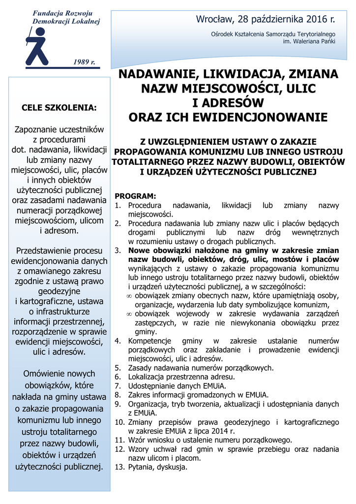 Wrocław, 28 października 2016 r. Rozwiązania informatyczne Ośrodek Kształcenia Samorządu Terytorialnego im. Waleriana Pańki CELE SZKOLENIA: Zapoznanie uczestników z procedurami dot. nadawania, likwidacji lub zmiany nazwy miejscowości, ulic, placów i innych obiektów użyteczności publicznej oraz zasadami nadawania numeracji porządkowej miejscowościom, ulicom i adresom. NADAWANIE, LIKWIDACJA, ZMIANA NAZW MIEJSCOWOŚCI, ULIC I ADRESÓW ORAZ ICH EWIDENCJONOWANIE Z UWZGLĘDNIENIEM USTAWY O ZAKAZIE PROPAGOWANIA KOMUNIZMU LUB INNEGO USTROJU TOTALITARNEGO PRZEZ NAZWY BUDOWLI, OBIEKTÓW I URZĄDZEŃ UŻYTECZNOŚCI PUBLICZNEJ PROGRAM: nadawania, likwidacji lub zmiany nazwy 1. Procedura miejscowości. 2. Procedura nadawania lub zmiany nazw ulic i placów będących drogami publicznymi lub nazw dróg wewnętrznych w rozumieniu ustawy o drogach publicznych. 3. Nowe obowiązki nałożone na gminy w zakresie zmian Przedstawienie procesu nazw budowli, obiektów, dróg, ulic, mostów i placów ewidencjonowania danych wynikających z ustawy o zakazie propagowania komunizmu z omawianego zakresu lub innego ustroju totalitarnego przez nazwy budowli, obiektów zgodnie z ustawą prawo i urządzeń użyteczności publicznej, a w szczególności: geodezyjne • obowiązek zmiany obecnych nazw, które upamiętniają osoby, i kartograficzne, ustawa organizacje, wydarzenia lub daty symbolizujące komunizm, o infrastrukturze • obowiązek wojewody w zakresie wydawania zarządzeń informacji przestrzennej, zastępczych, w razie nie niewykonania obowiązku przez gminy. rozporządzenie w sprawie ewidencji miejscowości, 4. Kompetencje gminy w zakresie ustalanie numerów porządkowych oraz zakładanie i prowadzenie ewidencji ulic i adresów. miejscowości, ulic i adresów. 5. Zasady nadawania numerów porządkowych. Omówienie nowych 6. Lokalizacja przestrzenna adresu. obowiązków, które 7. Udostępnianie danych EMUiA. nakłada na gminy ustawa 8. Zakres informacji gromadzonych w EMUiA. 9. Organizacja, tryb tworzenia, aktualizacji i udostępniania danych o zakazie propagowania z EMUiA. komunizmu lub innego 10. Zmiany przepisów prawa geodezyjnego i kartograficznego w zakresie EMUiA z lipca 2014 r. ustroju totalitarnego 11. Wzór wniosku o ustalenie numeru porządkowego. przez nazwy budowli, 12. Wzory uchwał rad gmin w sprawie przebiegu oraz nadania obiektów i urządzeń nazw ulicom i placom. użyteczności publicznej. 13. Pytania, dyskusja. ADRESACI SZKOLENIA: pracownicy urzędów gmin zajmujący się nadawaniem numeracji i ewidencjonowaniem miejscowości, ulic i adresów MIEJSCE SZKOLENIA: Wrocław, siedziba Ośrodka, ul. Piłsudskiego 49 – 57, III piętro Mapkę dojazdu do miejsca szkolenia znajdą Państwo na www.okst.pl/dojazd DANE DO KONTAKTU: Ośrodek Kształcenia Samorządu Terytorialnego im. Waleriana Pańki 40-014 Katowice ul. Mariacka 1 NIP: 522-000-18-95 TERMIN SZKOLENIA: 28 października 2016 r., godz. 10.00 – 15.00 Tel 32 259 86 73, 32 253 84 09 Fax. 32 259 86 73 w. 22, 26 e-mail: [email protected] www.okst.pl OSOBA DO KONTAKTU: Barbara Tekień tel. 32 206 80 39, 32 206 98 43 w. 25 [email protected] KOD SZKOLENIA CENA: 339 zł netto/os. Udział w szkoleniu zwolniony z VAT w przypadku finansowania szkolenia ze środków publicznych. Cena zawiera materiały szkoleniowe, zaświadczenie o ukończeniu szkolenia, poczęstunek i serwis kawowy. RABAT 10% za każdą następną osobę zgłoszoną z tej samej instytucji. ZGŁOSZENIA: Wypełnioną kartę zgłoszenia należy przesłać mailem lub faksem lub poprzez formularz na www.okst.pl do 25 października 2016 r. Wrocław 10118/16D/T Nazwa nabywcy (dane do faktury) Adres nabywcy (ulica, nr domu, kod pocztowy, miejscowość) NIP Telefon Email 1. Imię i nazwisko uczestnika, stanowisko 2. Imię i nazwisko uczestnika, stanowisko 3. Imię i nazwisko uczestnika, stanowisko Oświadczam, że szkolenie dla ww. pracowników jest kształceniem zawodowym finansowanym w całości lub co najmniej 70% ze środków publicznych (proszę zaznaczyć właściwe) Członek FORUM (proszę zaznaczyć właściwe) UWAGA Ilość miejsc ograniczona. O udziale w szkoleniu decyduje kolejność zgłoszeń. Zgłoszenie na szkolenie musi zostać potwierdzone przesłaniem do Ośrodka karty zgłoszenia (mail, fax lub formularz na www.okst.pl). Brak pisemnej rezygnacji ze szkolenia najpóźniej na trzy dni robocze przed terminem będzie równoznaczny z obciążeniem Państwa należnością za to szkolenie niezależnie od przyczyn rezygnacji. Płatność należy uregulować przelewem przed lub po szkoleniu (na przelewie prosimy podać nazwę szkolenia lub jego kod). NR RACHUNKU: BPH: 68-10600076-0000321000197618 TAK ☐ NIE ☐ TAK ☐ NIE ☐ PODPIS