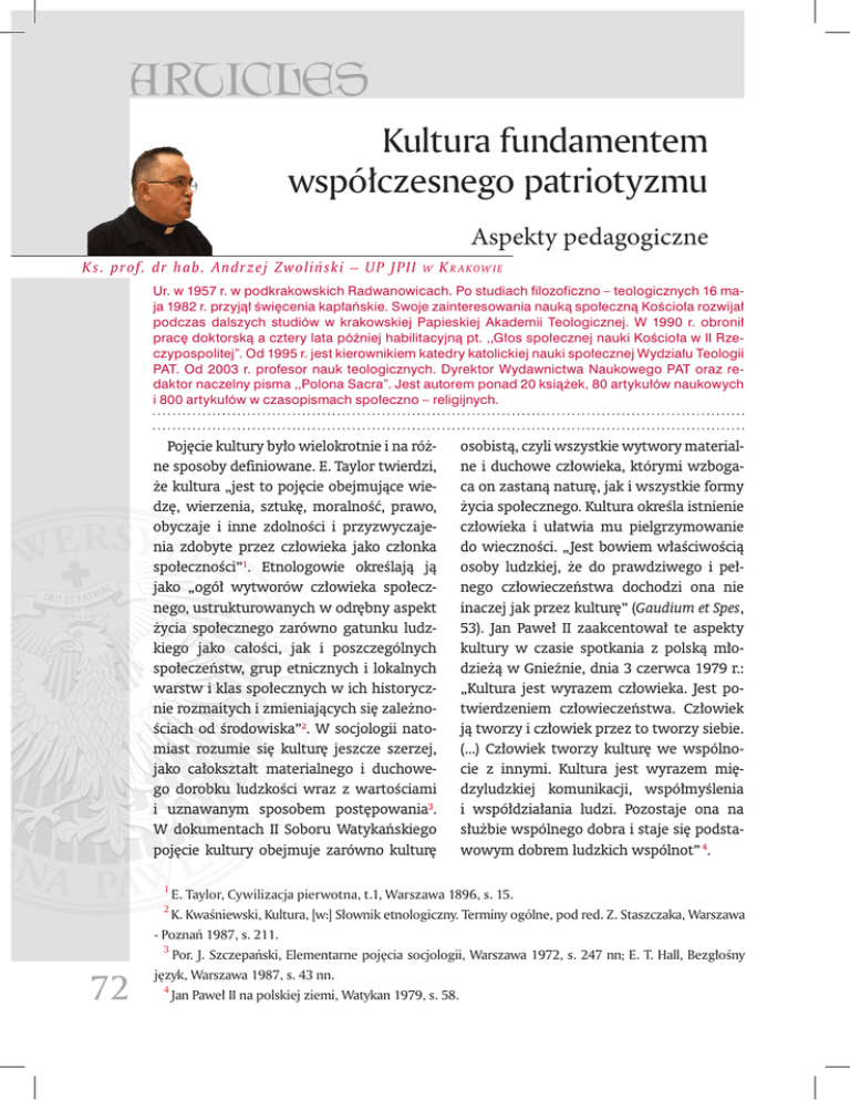 ARTICLES Kultura fundamentem współczesnego patriotyzmu Aspekty pedagogiczne K s . prof. dr hab. A ndrzej Zwoliń ski – UP JPII w K r a kow ie Ur. w 1957 r. w podkrakowskich Radwanowicach. Po studiach filozoficzno – teologicznych 16 maja 1982 r. przyjął święcenia kapłańskie. Swoje zainteresowania nauką społeczną Kościoła rozwijał podczas dalszych studiów w krakowskiej Papieskiej Akademii Teologicznej. W 1990 r. obronił pracę doktorską a cztery lata później habilitacyjną pt. ,,Głos społecznej nauki Kościoła w II Rzeczypospolitej”. Od 1995 r. jest kierownikiem katedry katolickiej nauki społecznej Wydziału Teologii PAT. Od 2003 r. profesor nauk teologicznych. Dyrektor Wydawnictwa Naukowego PAT oraz redaktor naczelny pisma ,,Polona Sacra”. Jest autorem ponad 20 książek, 80 artykułów naukowych i 800 artykułów w czasopismach społeczno – religijnych. Pojęcie kultury było wielokrotnie i na różne sposoby definiowane. E. Taylor twierdzi, że kultura „jest to pojęcie obejmujące wiedzę, wierzenia, sztukę, moralność, prawo, obyczaje i inne zdolności i przyzwyczajenia zdobyte przez człowieka jako członka społeczności”1. Etnologowie określają ją jako „ogół wytworów człowieka społecznego, ustrukturowanych w odrębny aspekt życia społecznego zarówno gatunku ludzkiego jako całości, jak i poszczególnych społeczeństw, grup etnicznych i lokalnych warstw i klas społecznych w ich historycznie rozmaitych i zmieniających się zależnościach od środowiska”2. W socjologii natomiast rozumie się kulturę jeszcze szerzej, jako całokształt materialnego i duchowego dorobku ludzkości wraz z wartościami i uznawanym sposobem postępowania3. W dokumentach II Soboru Watykańskiego pojęcie kultury obejmuje zarówno kulturę osobistą, czyli wszystkie wytwory materialne i duchowe człowieka, którymi wzbogaca on zastaną naturę, jak i wszystkie formy życia społecznego. Kultura określa istnienie człowieka i ułatwia mu pielgrzymowanie do wieczności. „Jest bowiem właściwością osoby ludzkiej, że do prawdziwego i pełnego człowieczeństwa dochodzi ona nie inaczej jak przez kulturę” (Gaudium et Spes, 53). Jan Paweł II zaakcentował te aspekty kultury w czasie spotkania z polską młodzieżą w Gnieźnie, dnia 3 czerwca 1979 r.: „Kultura jest wyrazem człowieka. Jest potwierdzeniem człowieczeństwa. Człowiek ją tworzy i człowiek przez to tworzy siebie. (...) Człowiek tworzy kulturę we wspólnocie z innymi. Kultura jest wyrazem międzyludzkiej komunikacji, współmyślenia i współdziałania ludzi. Pozostaje ona na służbie wspólnego dobra i staje się podstawowym dobrem ludzkich wspólnot” 4. 1 E. Taylor, Cywilizacja pierwotna, t.1, Warszawa 1896, s. 15. 2 K. Kwaśniewski, Kultura, [w:] Słownik etnologiczny. Terminy ogólne, pod red. Z. Staszczaka, Warszawa - Poznań 1987, s. 211. 3 72 Por. J. Szczepański, Elementarne pojęcia socjologii, Warszawa 1972, s. 247 nn; E. T. Hall, Bezgłośny język, Warszawa 1987, s. 43 nn. 4 Jan Paweł II na polskiej ziemi, Watykan 1979, s. 58. ARTYKUŁY 1. Pojęcie kultury narodowej Kultura narodowa jest jednym z aspektów kultury, ściśle związanym z narodową formacją społeczną jednostek, które ją budują. Znawcy problematyki wymieniają szereg jej elementów, jak: język, tradycję, literaturę, obyczaje, stroje, obrzędy, duchowość, religijność, dzieje5. Można więc przyjąć następującą jej definicję: „Kultura narodowa stanowi szeroki i złożony układ (syndrom) sposobów działania, norm, wartości i symboli, wierzeń, wiedzy i dzieł symbolicznych, który jest przez jakąś zbiorowość społeczną uważany za jej własny, jej w szczególności przysługujący, wyrosły z jej tradycji i historycznych doświadczeń oraz obowiązujący w jej obrębie”6. Bardziej poetyckie określenia kultury narodowej wskazują na nią jako jego duszę. Tadeusz Miciński, poeta i dramaturg okresu Młodej Polski, wołał: „Ojczyzna w was jest! Ile podniesiecie ją w sercu waszym, tyle przysporzycie jej praw i jej granic!”7. Podkreślał tym samym wewnętrzną, ukrytą naturę istoty polskości i związanej z nią kultury. Kultura narodowa jest czynnikiem „indywidualizacji zbiorowości”, czyli gwa5 rantuje tożsamość kulturową określonej grupie narodowej, która wypracowywała ową „autonomię ducha” przez całe swe dzieje. Wytworzyła w ten sposób specyficzny rodzaj obecności społecznej, współżycia, mentalności, zachowań i idei8. Trwanie w kulturze danego narodu, przestrzeganie jej reguł i współuczestniczenie w dziejowym jej ubogacaniu, kształtuje u jednostek specyficzny styl myślenia, poczucia piękna, dobra. W ten sposób kultura narodowa tworzy „jaźń narodową”, czyli podobne dla przedstawicieli danego narodu przymioty duchowe określające postrzeganie siebie i świata9. Kultura jest czynnikiem narodowotwórczym. Przypominali o tym znani polscy socjolodzy: F. Znaniecki, B. Malinowski i J. Chałasiński. Narody stają się poprzez kulturę. „Rzeczywistymi nosicielami kultury - pisał B. Malinowski - od początku ewolucji aż do naszych czasów są narody, czyli kulturowo zjednoczone ludy świata”10. Kultura jest rdzeniem tożsamości narodu. Dla pokazania jej roli posługiwano się analogią: jeśli naród jest ciałem, to kultura duszą, a Kościół duchem11. Por. H. Skorowski, Wolność, integracja, solidarność w nauczaniu społecznym Jana Pawła II, Wydawnic- two Diecezjalne w Sandomierzu, Warszawa 2002, s. 83 - 90. 6 A. Kłoskowska, Kutura narodowa, [w:] Pojęcia i problemy wiedzy o kulturze, pod red. A. Kłoskowskiej, seria: Encyklopedia kultury polskiej XX wieku, t. 1, Wrocław 1991, s. 51. 7 T. Miciński, Do źródeł duszy polskiej, Lwów 1906, s. 13. 8 Por. M. Pawlikowski, Dwa światy, Veritas, Londyn 1952, s. 301 - 303; E. Jaworski, W. Kosowska, „A to Polska właśnie”. W kręgu wartości kultury narodowej, [w:]