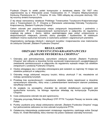 Fryderyk Chopin to wielki polski kompozytor o światowej sławie. Od 1927 roku organizowane są w Warszawie przez Towarzystwo im. F. Chopina Międzynarodowe Konkursy Pianistyczne im. F. Chopina. W roku 1999 odbędą się uroczyste obchody 150tej rocznicy śmierci kompozytora. Z tej okazji warszawscy działacze Polskiego Towarzystwa Turystyczno-Krajoznawczego wraz z Towarzystwem im. F. Chopina w Warszawie ustanawiają Odznakę TurystycznoKrajoznawczą „Śladami Fryderyka Chopina”. Celem odznaki jest popularyzacja miejsc związanych bezpośrednio i pośrednio z kompozytorem. W wielu miejscowościach wymienionych w załączniku do regulaminu znajdują się pałace i dwory, tablice upamiętniające jego pobyt umieszczone w eksponowanych miejscach, pomniki, zbiory pamiątek i wydawnictw. W niektórych obiektach można wysłuchać koncertu w wykonaniu polskich i zagranicznych pianistów. Organizatorzy zachęcają młodych i starszych turystów i krajoznawców oraz melomanów do zdobycia Odznaki „Śladami Fryderyka Chopina”. REGULAMIN ODZNAKI TURYSTYCZNO-KRAJOZNAWCZEJ „ŚLADAMI FRYDERYKA CHOPINA” 1. Odznaka jest jednostopniowa, warunkiem zdobycia odznaki „Śladami Fryderyka Chopina” jest odbycie w dowolnej formie wycieczek krajoznawczych uwzględniających zwiedzenie zamieszczonych w załączniku do regulaminu wykazie miejsc lub obiektów związanych z postacią Fryderyka Chopina. 2. Osoba ubiegająca się o odznakę zobowiązana jest zwiedzić co najmniej 10 miejsc lub obiektów podanych w załączniku. 3. Odznakę mogą zdobywać wszyscy turyści, którzy ukończyli 7 lat, niezależnie od rodzaju uprawianej turystyki. 4. Przebieg tras wycieczkowych i zwiedzanie obiektów należy rejestrować w dowolnie opracowanym dzienniku, który wraz z potwierdzeniami terenowymi stanowi podstawę weryfikacji odznaki. 5. Ze względu na szczególny charakter tej odznaki dodatkowym wymogiem jest wysłuchanie koncertu, na którego repertuar składają się kompozycje Fryderyka Chopina. 6. Czas zdobywania odznaki nie jest ograniczony. 7. Odznakę przyznają Referaty Weryfikacji OTP PTTK Turystyki Pieszej na terenie całej Polski. 8. Punkty uzyskane przy okazji zdobywania odznaki „Śladami Fryderyka Chopina” mogą być jednocześnie zaliczane na inne odznaki turystyczne PTTK. 9. Ostateczną interpretację postanowień niniejszego regulaminu zastrzega sobie Zarząd Klubu im. Anieli Michalskiej, który również ma prawo nadawać odznakę honorowo. WYKAZ MIEJSC I OBIEKTÓW ZWIĄZANYCH Z POSTACIĄ FRYDERYKA CHOPINA 1. Antonin (na pn. od Ostrzeszowa) – w 1829 r. F. Chopin odwiedził Antoniego X. Radziwiłła. W pałacu myśliwskim dawał lekcje muzyki córce księcia, Wandzie i wielokrotnie grywał. Co roku we wrześniu organizowana jest impreza kulturalnoturystyczna „Jesień Chopinowska”. 2. Białkowo (nad Drwęcą) – Chopin bywał tu u Antoniego Wybranieckiego, ojczyma kolegi Jasia Białobłockiego. 3. Brochów (k. Sochaczewa) – w kościele w Brochowie rodzice F. Chopina brali ślub, tu również był chrzczony przyszły kompozytor. W kościele w Brochowie brała także ślub najstarsza siostra Chopina, Ludwika, która wyszła za mąż za Józefa Kalasantego Jędrzejewicza. 4. Długie (k. Izbicy Kujawskiej) – miejsce urodzin matki F. Chopina Justyny z Krzyżanowskich. 5. Dulsk (k. Golubia-Dobrzynia) – Chopin odwiedzał kilkakrotnie Józefa Wysockiego podczas bytności w Sokołowie. 6. Duszniki-Zdrój (woj. jeleniogórskie) – w czasie pobytu w Dusznikach-Zdrój F. Chopin koncertował na cele dobroczynne. Obecnie co roku organizowane są tu festiwale chopinowskie. 7. Gulbiny (k. Rypina) – Chopin bywał we wsi u pp. Piwnickich. W 1959 roku ich dwór został rozebrany, a w miejscowej szkole pielęgnuje się na lekcjach pamięć o pobycie kompozytora w Gulbinach. 8. Gdańsk – Chopin zwiedzał miasto. 9. Kalisz – ostatni raz przejechał Chopin przez Kalisz 5.11.1830 roku. Tam spotkał się z Tytusem Woyciechowskim, serdecznym przyjacielem, z którym odbywał dalszą drogę do Wiednia przez Wrocław, Drezno i Pragę. 10. Kawęczyn (woj. toruńskie) – mieszkał tu jeden z pensjonariuszy Chopinów Piotr Dziewanowski. 11. Kikół (między Lipnem a Toruniem) – podczas wakacji na Ziemi Dobrzyńskiej, F. Chopin odwiedził hrabiego Karola Zboińskiego, dziedzica Kikoła, gdzie koncertował w klasycystycznym pałacu. 12. Kłóbka (na pn. od Lubienia Kujawskiego) – wieś należała do Orpiszewskich, którzy kupili ją od Skarbków. W miejscowym kościele znajduje się obraz namalowany przez Marię z Wodzińskich Orpiszewską. 13. Kozłowo (k. Świecia) – odwiedzał je Chopin w drodze do Gdańska. Wyznakowano „Szlak Chopina” koloru żółtego o długości 9 km wiodący z miejscowości Kozłowo przez Świecie do wsi Terespol. 14. Kowalewo (k. Drobina woj. płockie) – Chopin spędzał wakacje u pp. Zboińskich w 1827 roku. 15. Obrowo (między Lipnem a Toruniem) – F. Chopin bywał we wsi grając na skrzypcach i basetli ludowe melodie. 16. Kraków – zwiedzał miasto oraz okolice Wieliczkę, Ojców, Pieskową Skałę. 17. Poznań – F. Chopin przebywał dwa dni. Uczestniczył w przyjęciach u arcybiskupa Wolickiego, u którego koncertował grając utwory Haydna i Beethovena. Upamiętniono jego pobyt w następujących miejscach: Tablicą pamiątkową na ścianie Urzędu Miejskiego, popiersiem Chopina w parku, tablicą z medalionem na ścianie Poznańskiego Towarzystwa Przyjaźni Nauk. 18. Poturzyn (k. Dołhobycza na Lubelszczyźnie) – w 1829 r. przebywał u Tytusa Woyciechowskiego. 2 19. Sanniki (k. Gąbina) – w 1828 roku spędzał wakacje i koncertował. Na terenie parku w pobliżu dworu znajduje się pomnik Chopina dłuta Ludwiki Nitschowej. 20. Sochaczew (k. Warszawy) – na skwerze Kościuszki znajduje się obelisk upamiętniający koncert F. Chopina w obozie wojskowym gen. Szembeka. 21. Sokołowo (k. Szafarni) – w tej wsi należącej do Antoniego Wybranieckiego, F. 