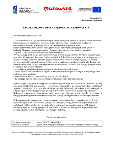 Załącznik Nr 1 do zapytania ofertowego SZCZEGÓŁOWY OPIS PRZEDMIOTU ZAMÓWIENIA Przedmiotem zamówienia jest: I. I. Stworzenie dwóch wystaw internetowych prezentujących wybrane eksponaty zbioru Muzeum Historycznego w Legionowie (archeologiczne i historyczne) - mechanizm wystawy i opracowanie warstwy graficznej strony, w której obiekty są prezentowane. Obie wystawy mają nawiązywać szatą graficzną do szaty funkcjonujących już wystaw w budynku Muzeum – czasowej wystawy Sportowe Legionowo oraz wystawy stałej De Profundis... Archeologia ziem powiatu legionowskiego. Wystawy mają mieć postać galerii internetowej, prezentującej od 20 do 30 zdjęć, podzielonych na działy. W wystawie Sportowe Legionowo będzie 7 działów, a w wystawie archeologicznej – 5 działów. Należy zapewnić obróbkę zdjęć i dopasowanie ich do wymogów galerii – kontrast, czyszczenie, kadrowanie. Muzeum Historyczne w Legionowie dostarczy materiały ilustracyjne i tekstowe niezbędne do wykonania przedmiotu zamówienia. Materiał ilustracyjny przygotowany zostanie w następujący sposób: - wszystkie zdjęcia udostępnione zostaną w takiej samej rozdzielczości, - każde zdjęcie opatrzone będzie logiem Muzeum umieszczonym w prawym dolnym rogu oraz podpisem autora zdjęcia, - logo Muzeum będzie zajmować nie więcej, niż 1/8 zdjęcia, - do każdego zdjęcia załączony zostanie zestandaryzowany plik metadanych Oprócz zdjęć w galeriach mogą być stosowane prezentacje 360 0wybranych obiektów. Należy zapewnić możliwość ich dodania – stworzenia odnośników do prezentacji. Przy niektórych zdjęciach zaistnieje także potrzeba dodania osobnej informacji lub tekstu audiodeskrypcji w formacie pdf. Należy przygotować grafikę plików pdf z możliwością domowego wydruku. Kolejnym elementem zamówienia jest stworzenie drugiej wersji każdej z galerii z uwzględnieniem potrzeb osób słabowidzących. Należy udostępnić opcję wysokiego kontrastu. II. Przygotowanie 10 pojedynczych stron responsywnych (bez dalszych podstron) graficznie ujednoliconych z ww. wystawami (po pięć do każdej wystawy), które na różnych nośnikach mobilnych (tablet, telefon itp.) wyświetlałyby informacje po przekierowaniu z QR kodów umieszczonych na realnej wystawie w pawilonie Muzeum. Na każdej stronie przedstawione zostało zdjęcie obiektu oraz tekst – informacja o zabytku. Parametry techniczne Zgodność technologii wykonania strony z serwer WWW: APACHE 2 język: PHP(wszystkie aktualnie wspierane przez producenta wersje Projekt współfinansowany przez Unię Europejską ze środków Europejskiego Funduszu Rozwoju Regionalnego Programu Operacyjnego Województwa Mazowieckiego 2007-2013 konfiguracją platformy posiadanej przez Zamawiającego oraz wersja 5.2.6), HTML 4 i 5, AJAX, JAVA SCRIPT baza danych: MySql Strona www musi umożliwiać prawidłowe wyświetlanie treści oraz obsługę stron dla użytkowników następujących przeglądarek internetowych: • Microsoft Internet Explorer (od wersji 8 i wyżej), • Mozilla Firefox (od wersji 38.0 i wyżej), • Opera, Google Chrome, Safari (najnowsze wersje stabilne wydane przez producenta zgodnie ze stanem na dzień ogłoszenia Zamówienia Publicznego). • W przypadku wykorzystania kodu JavaScript on także musi działać prawidłowo w wyżej wymienionych przeglądarkach. • W przypadku korzystania ze starszych lub nieobsługiwanych poprawnie przeglądarek na stronie powinien wyświetlić się komunikat o sposobie poprawnego wyświetlania portalu oraz wersji przeglądarek, do których strona www jest zoptymalizowana. Wymagane jest zastosowanie technologii takich jak: HTML, XHTML, CSS Level 1 lub 2.1, PHP lub JAVA, AJAX, bądź technologii o porównywalnych możliwościach. Dopuszczane jest wykorzystanie technologii Open Source oraz FLASH (wymagane poprawne działanie od wersji 11). • Optymalną rozdzielczością wymaganą do prawidłowego wyświetlania strony będzie 1024x768 pikseli. Podstrony muszą być automatycznie skalowane do rozdzielczości mniejszych i większych niż optymalna. Niedopuszczalne jest nakładanie się tekstu lub jego obcinanie itp. • Strona www musi być dostosowany do prawidłowego wyświetlania na urządzeniach mobilnych (telefon komórkowy, smartfon, palmtop, pocket PC) i jednocześnie być zgodny z rekomendacjami stawianymi przez W3C dla tych urządzeń: Mobile Web Best Practices 1.0, napisany w języku XHTML – Basic Profile, z zachowaniem kodowania UTF-8. Obsługa arkuszy styli: CSS Level 1 lub 2.1. Powyższy wymóg może być osiągnięty przez stworzenie wersji strony osobnej dla urządzeń mobilnych. • Strona w całości musi wykorzystywać wyłącznie: ◦ technologie umożliwiające dalsze wykorzystywanie i rozwój portalu bez konieczności zakupu jakiejkolwiek licencji bądź oprogramowania; ◦ pozostałe technologie, z tym, że Wykonawca jest zobowiązany pokryć wszystkie koszty licencji niezbędne do uruchomienia systemu. System musi uniemożliwiać dostęp do funkcji i zgromadzonych w nim danych z pominięciem mechanizmów bezpieczeństwa. W przypadku pojawienia się nowych nie znanych wcześniej technik włamań, Wykonawca jest zobowiązany do ich analizy oraz dostarczenia niezbędnych poprawek i uaktualnień eliminujących Projekt współfinansowany przez Unię Europejską ze środków Europejskiego Funduszu Rozwoju Regionalnego Programu Operacyjnego Województwa Mazowieckiego 2007-2013 podatności dostarczonej strony www w ramach świadczonej pomocy technicznej. Czas reakcji i czas usunięcia usterki zostanie określony w umowie. Serwis www powinien zostać wykonany z zastosowaniem najlepszych praktyk w dziedzinie budowania witryn WWW i w zgodności z najnowszymi standardami, które wyznacza W3C (World Wide Web Consortium) i spełniać wymagania WCAG 2.0. Na etapie realizacji zamówienia Wykonawca będzie konsultował się z Muzeum Historycznym w Legionowie, które ostatecznie zatwierdzi przygot