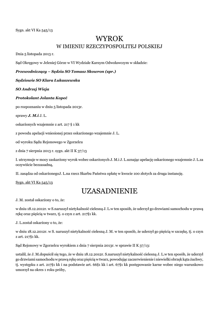 Sygn. akt VI Ka 545/13 WYROK W IMIENIU RZECZYPOSPOLITEJ POLSKIEJ Dnia 5 listopada 2013 r. Sąd Okręgowy w Jeleniej Górze w VI Wydziale Karnym Odwoławczym w składzie: Przewodniczący – Sędzia SO Tomasz Skowron (spr.) Sędziowie SO Klara Łukaszewska SO Andrzej Wieja Protokolant Jolanta Kopeć po rozpoznaniu w dniu 5 listopada 2013r. sprawy J. M.i J. L. oskarżonych wzajemnie z art. 217 § 1 kk z powodu apelacji wniesionej przez oskarżonego wzajemnie J. L. od wyroku Sądu Rejonowego w Zgorzelcu z dnia 7 sierpnia 2013 r. sygn. akt II K 37/13 I. utrzymuje w mocy zaskarżony wyrok wobec oskarżonych J. M.i J. L.uznając apelację oskarżonego wzajemnie J. L.za oczywiście bezzasadną, II. zasądza od oskarżonegoJ. L.na rzecz Skarbu Państwa opłatę w kwocie 100 złotych za druga instancję. Sygn. akt VI Ka 545/13 UZASADNIENIE J. M. został oskarżony o to, że: w dniu 18.12.2012r. w S.naruszył nietykalność cielesną J. L.w ten sposób, że uderzył go drzwiami samochodu w prawą rękę oraz pięścią w twarz, tj. o czyn z art. 217§1 kk. J. L.został oskarżony o to, że: w dniu 18.12.2012r. w S. naruszył nietykalność cielesną J. M. w ten sposób, że uderzył go pięścią w szczękę, tj. o czyn z art. 217§1 kk. Sąd Rejonowy w Zgorzelcu wyrokiem z dnia 7 sierpnia 2013r. w sprawie II K 37/13: ustalił, że J. M.dopuścił się tego, że w dniu 18.12.2012r. S.naruszył nietykalność cielesną J. L.w ten sposób, że uderzył go drzwiami samochodu w prawą rękę oraz pięścią w twarz, powodując zaczerwienienie i niewielki obrzęk kąta żuchwy, tj. występku z art. 217§1 kk i na podstawie art. 66§1 kk i art. 67§1 kk postępowanie karne wobec niego warunkowo umorzył na okres 1 roku próby, uznał oskarżonego J. L.winnym tego, że w dniu 18.12.2012r. S.naruszył nietykalność cielesną J. M.w ten sposób, że uderzył go pięścią w twarz powodując stłuczenie powierzchni twarzy okolicy kąta żuchwy, tj. występku z art. 217§1 kk i za to przy przyjęciu art. 217§2 kk odstąpił od wymierzenia mu kary; na podstawie art. 628 pkt 1 kpk zasądził od J. M.na rzecz J. L.kwotę 300 zł tytułem zwrotu kosztów postępowania; na podstawie art. 628 pkt 1 kpk zasądził od J. L.na rzecz J. M.kwotę 300 zł tytułem zwrotu kosztów postępowania. Z powyższym orzeczeniem nie zgodził się J. L., zarzucając: naruszenie przepisów postępowania, które mogło mieć wpływ na treść orzeczenia, w szczególności: 1. art. 7 KPK poprzez przekroczenie zasady swobodnej oceny dowodów, nie uwzględnienie przy ocenie dowodów zasad prawidłowego rozumowania oraz wskazań wiedzy i doświadczenia życiowego a poprzez zastosowanie dowolności w ocenie dowodów. 2. art. 5 KPK poprzez nie zastosowanie zasady domniemania niewinności i oparcie uznania J. L.winnym wyłącznie na podstawie zeznań oskarżonego wzajemnego, przy istnieniu nie dających się usunąć wątpliwości co do zaistnienia czynu. 3. art. 172 KPK poprzez nie przeprowadzenie konfrontacji świadków powołanych przez J. M.ze świadkami powołanymi przez J. L., w sytuacji gdy ich zeznania były częściowo sprzeczne. błąd w ustaleniach faktycznych przyjętych za podstawę orzeczenia, który miał wpływ na treść orzeczenia, to jest poprzez nieuzasadnione przyjęcie, że oskarżyciel prywatny J. L.zachowywał się w dniu zdarzenia w sposób wywołujący poczucie niebezpieczeństwa, że zaczął odkręcać wentyl opony pojazdu, w którym przebywał oskarżony J. M.oraz że J. L.po otrzymanym uderzeniu drzwiami samochodu a następnie pięścią uderzył z zaskoczenia J. M. naruszenie przepisów prawa karnego materialnego poprzez nieuzasadnione przyjęcie, że obrażenia zadane J. L.przez J. M.wypełniają znamiona wyłącznie naruszenia nietykalności cielesnej i nieuzasadnione oparcie wyroku o art. 217 § l KK i poprzez nie przyjęcie, że czyn J. M.wypełnia znamiona czynu zabronionego z art. 157 § 2 KK, to jest lekkiego uszczerbku na zdrowiu. naruszenie art. 67 § 3 zd. 1 KK, poprzez nie uwzględnienie w wyroku obligatoryjnego zobowiązania sprawcy do naprawienia szkody w całości lub w części. W razie przyjęcia, że ustalony przez Sąd I Instancji stan faktyczny został prawidłowo ustalony, wyłącznie z ostrożności procesowej - naruszenie przepisów prawa materialnego poprzez nie zastosowanie w sprawie art. 25 § l KK, to jest poprzez nie uznanie, że rzekome zachowanie J. L.miało charakter obrony koniecznej przed bezpośrednim i bezprawnym zamachem na swoje zdrowie i nietykalność osobistą. Wobec tego przy takim przyjęciu sprawy J. L.powinien zostać uniewinniony wyrokiem od zarzucanego mu czynu na podstawie art. 414 § l zd. 2 KPK w zw. z art. 17 § l pkt 2 in fine KPK. Mając powyższe zarzuty na uwadze, autor apelacji wniósł o uchylenie zaskarżonego orzeczenia co do kary w zakresie punktu I wyroku oraz przekazanie sprawy do ponownego rozpoznania Sądowi I Instancji, pozostawiając temu sądowi rozstrzygnięcie (zgodnie z art. 626 § l KPK, w orzeczeniu kończącym postępowanie) o kosztach procesu. Odnośnie punktu II i IV wyroku, na podstawie art. 427 §1, 437 § l i 2 KPK, wniósł o zmianę zaskarżonego wyroku poprzez uniewinnienie oskarżonego i uchylenie punktu IV wyroku. Sąd Okręgowy zważył co następuje: Apelacja oskarżonego wzajemnie J. L.jest niezasadna i to w stopniu oczywistym. Na wstępie stwierdzić należy, że zarzut obrazy prawa materialnego poprzez naruszenie poprzez „nieuzasadnione przyjęcie, że obrażenia zadane J. L.przez J. M.wypełniają znamiona wyłącznie naruszenia nietykalności cielesnej i nieuzasadnione oparcie wyroku o art.217§1 k.k.” jest zarzutem nieprawidłowym. Powszechnie bowiem przyjmuje się, iż zarzut obrazy prawa materialnego może być postawiony skutecznie wtedy, gdy skarżący nie kwestionuje ustaleń faktycznych poczynionych przez sąd I instancji. Wbrew zarzutom apelacji sąd rejonowy przeprowadził postępowanie w sposób wolny od wa