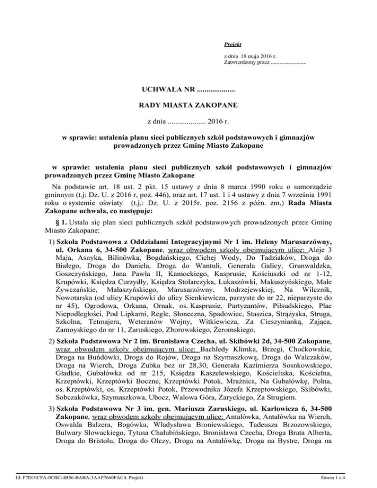 Projekt z dnia 18 maja 2016 r. Zatwierdzony przez ......................... UCHWAŁA NR .................... RADY MIASTA ZAKOPANE z dnia .................... 2016 r. w sprawie: ustalenia planu sieci publicznych szkół podstawowych i gimnazjów prowadzonych przez Gminę Miasto Zakopane w sprawie: ustalenia planu sieci publicznych szkół podstawowych i gimnazjów prowadzonych przez Gminę Miasto Zakopane Na podstawie art. 18 ust. 2 pkt. 15 ustawy z dnia 8 marca 1990 roku o samorządzie gminnym (t.j: Dz. U. z 2016 r, poz. 446), oraz art. 17 ust. 1 i 4 ustawy z dnia 7 września 1991 roku o systemie oświaty (t.j.: Dz. U. z 2015r. poz. 2156 z późn. zm.) Rada Miasta Zakopane uchwala, co następuje: § 1. Ustala się plan sieci publicznych szkół podstawowych prowadzonych przez Gminę Miasto Zakopane: 1) Szkoła Podstawowa z Oddziałami Integracyjnymi Nr 1 im. Heleny Marusarzówny, ul. Orkana 6, 34-500 Zakopane, wraz obwodem szkoły obejmującym ulice: Aleje 3 Maja, Asnyka, Bilinówka, Bogdańskiego, Cichej Wody, Do Tadziaków, Droga do Białego, Droga do Daniela, Droga do Wantuli, Generała Galicy, Grunwaldzka, Goszczyńskiego, Jana Pawła II, Kamockiego, Kasprusie, Kościuszki od nr 1-12, Krupówki, Księdza Curzydły, Księdza Stolarczyka, Łukaszówki, Makuszyńskiego, Małe Żywczańskie, Małaszyńskiego, Marusarzówny, Modrzejewskiej, Na Wilcznik, Nowotarska (od ulicy Krupówki do ulicy Sienkiewicza, parzyste do nr 22, nieparzyste do nr 45), Ogrodowa, Orkana, Ornak, os. Kasprusie, Partyzantów, Piłsudskiego, Plac Niepodległości, Pod Lipkami, Regle, Słoneczna, Spadowiec, Staszica, Strążyska, Struga, Szkolna, Tetmajera, Weteranów Wojny, Witkiewicza, Za Cieszynianką, Zająca, Zamoyskiego do nr 11, Zaruskiego, Zborowskiego, Żeromskiego. 2) Szkoła Podstawowa Nr 2 im. Bronisława Czecha, ul. Skibówki 2d, 34-500 Zakopane, wraz obwodem szkoły obejmującym ulice: Bachledy Klimka, Brzegi, Choćkowskie, Droga na Buńdówki, Droga do Rojów, Droga na Szymaszkową, Droga do Walczaków, Droga na Wierch, Droga Zubka bez nr 28,30, Generała Kazimierza Sosnkowskiego, Gładkie, Gubałówka od nr 215, Księdza Kaszelewskiego, Kościeliska, Kościelna, Krzeptówki, Krzeptówki Boczne, Krzeptówki Potok, Mraźnica, Na Gubałówkę, Polna, os. Krzeptówki, os. Krzeptówki Potok, Przewodnika Józefa Krzeptowskiego, Skibówki, Sobczakówka, Szymaszkowa, Ubocz, Walowa Góra, Zaryckiego, Za Strugiem. 3) Szkoła Podstawowa Nr 3 im. gen. Mariusza Zaruskiego, ul. Karłowicza 6, 34-500 Zakopane, wraz obwodem szkoły obejmującym ulice: Antałówka, Antałówka na Wierch, Oswalda Balzera, Bogówka, Władysława Broniewskiego, Tadeusza Brzozowskiego, Bulwary Słowackiego, Tytusa Chałubińskiego, Bronisława Czecha, Droga Brata Alberta, Droga do Bristolu, Droga do Olczy, Droga na Antałówkę, Droga na Bystre, Droga na Id: F7D19CFA-0CBC-4B56-BABA-3AAF7660FAC4. Projekt Strona 1 z 4 Koziniec, Hala Gąsienicowa, Generała Boruty-Spiechowicza, Jaszczurówka, Jaszczurówka-Bory, Kalatówki, Kasprowy Wierch, Mieczysława Karłowicza, Józefa Ignacego Kraszewskiego, Kurierów Tatrzańskich, Kuźnice, Myślenickie Turnie, Oberconiówka, Pardałówka, os. Pardałówka, Stara Pardałówka, Paryskich, Podhalańska, Pocztowców, Pod Skocznią, Wincentego Pola, Przewodników Tatrzańskich, Jana Sabały, Salwatoriańska, Karola Szymanowskiego, Juliana Tuwima, Władysława Zamoyskiego od nr 13, Zwierzyniecka. 4) Szkoła Podstawowa Nr 4 im. Marszałka Józefa Piłsudskiego, ul. Janosówka 15, 34-500 Zakopane, wraz obwodem szkoły obejmującym ulice: Gawlaki, Galicówka, Huty, Janosówka, Klusie, Mrowce, Piszczory, Rybkówka, Stachonie, Stary Młyn, Walkosze, Wojdyły, Topory. 5) Szkoła Podstawowa Nr 5 im. Janusza Korczaka, ul. Chramcówki 27, 34-500 Zakopane, wraz obwodem szkoły obejmującym ulice: Bachledzki Wierch, Brzozowa, Chramcówki, Chyców Potok, Ciągłówka, Do Samków, Gimnazjalna, Gubałówka do nr 214, Jagiellońska, Kasprowicza od nr 2 do nr 36 i od nr 1 do nr 35, Kamieniec, Kościuszki od nr 13, Kotelnica, Nowotarska (od Ronda Solidarności do ul. Sienkiewicza, parzyste od nr 22, nieparzyste od nr 45), os. Szymony, Piaseckiego, Sienkiewicza, Smrekowa, Stary Kamieniec, Stroma, Szpitalna, Szymony, Tatary, Wierchowa. 6) Szkoła Podstawowa Nr 7 im. Kornela Makuszyńskiego, ul. Cyrhla 57, 34-500 Zakopane, wraz obwodem szkoły obejmującym ulice: Brzeziny, Chłabówka, Cyrhla, Hrube Niżne, Hrube Wyżne, Wyskówki, Zoniówka. 7) Szkoła Podstawowa Nr 9 im. Jana Kasprowicza, ul. Harenda 21, 34-500 Zakopane, wraz obwodem szkoły obejmującym ulice: Bachledy, Guty, Harenda, Kasprowicza od nr 37, Króle, Łosiówki, Spyrkówka, Ustup, Zwijacze. § 2. Ustala się plan sieci publicznych gimnazjów prowadzonych przez Gminę Miasto Zakopane: 1) Gimnazjum Nr 1 im. Olgi i Andrzeja Małkowskich, ul. Nowotarska 42, 34-500 Zakopane, wraz obwodem szkoły obejmującym ulice: Aleje 3 Maja (od ulicy Kościuszki w dół), Bachledy, Bachledy Klimka, Bachledzki Wierch, Bilinówka, Brzegi, Brzozowa, Ciągłówka, Cichej Wody, Choćkowskie, Chramcówki, Chyców Potok, Do Samków, Droga na Buńdówki, Droga do Rojów, Droga na Szymaszkową, Droga do Walczaków, Droga na Wierch, Droga Zubka bez nr 28,30, Generała Kazimierza Sosnkowskiego, Gimnazjalna, Gładkie, Gubałówka, Guty, Harenda, Jagiellońska, Jana Pawła II, Kamieniec, Kamockiego, Kasprowicza, Kasprusie, Księdza Kaszelewskiego, Księdza Stolarczyka, Kościeliska, Kościelna, Kościuszki, Kotelnica, Króle, Krupówki (od Poczty Głównej w dół), Krzeptówki, Krzeptówki Boczne, Krzeptówki Potok, Łosiówki, Łukaszówki, Małaszyńskiego, Mraźnica, Na Gubałówkę, Nowotarska, os. Kasprusie, os. Krzeptówki, os. Krzeptówki Potok, os. Szymony, Piaseckiego, Polna, Przewodnika Józefa Krzeptowskiego, Sienkiewicza (do ulicy Kościuszki), Skibówki, Słoneczna, Smrekowa, Sobczakówka, Spyrkówka, Stary Kamieniec, Stroma, Szkolna, Szpitalna, Szymony, Szymaszkowa, Tatary