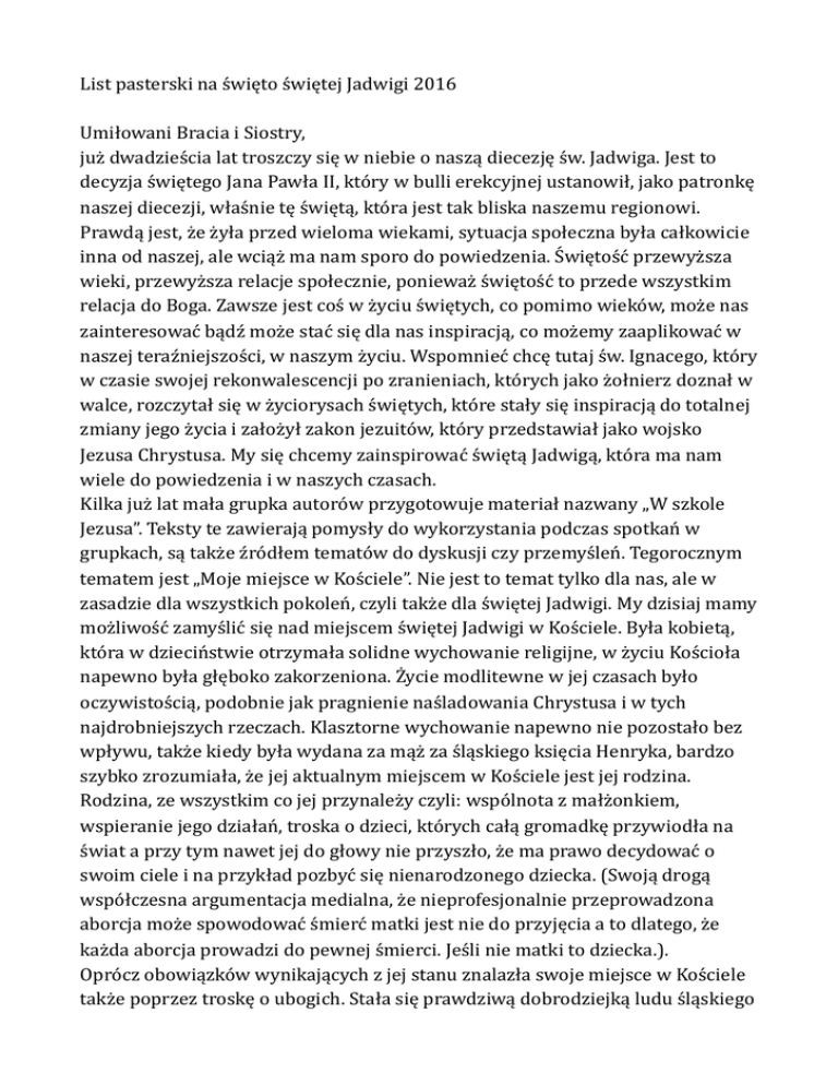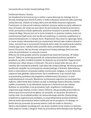 ListpasterskinaświętoświętejJadwigi2016 UmiłowaniBraciaiSiostry, jużdwadzieścialattroszczysięwniebieonasządiecezjęśw.Jadwiga.Jestto decyzjaświętegoJanaPawłaII,którywbullierekcyjnejustanowił,jakopatronkę naszejdiecezji,właśnietęświętą,którajesttakbliskanaszemuregionowi. Prawdąjest,żeżyłaprzedwielomawiekami,sytuacjaspołecznabyłacałkowicie innaodnaszej,alewciążmanamsporodopowiedzenia.Świętośćprzewyższa wieki,przewyższarelacjespołecznie,ponieważświętośćtoprzedewszystkim relacjadoBoga.Zawszejestcośwżyciuświętych,copomimowieków,możenas zainteresowaćbądźmożestaćsiędlanasinspiracją,comożemyzaaplikowaćw naszejteraźniejszości,wnaszymżyciu.Wspomniećchcętutajśw.Ignacego,który wczasieswojejrekonwalescencjipozranieniach,którychjakożołnierzdoznałw walce,rozczytałsięwżyciorysachświętych,którestałysięinspiracjądototalnej zmianyjegożyciaizałożyłzakonjezuitów,któryprzedstawiałjakowojsko JezusaChrystusa.MysięchcemyzainspirowaćświętąJadwigą,któramanam wieledopowiedzeniaiwnaszychczasach. Kilkajużlatmałagrupkaautorówprzygotowujemateriałnazwany„Wszkole Jezusa”.Tekstytezawierająpomysłydowykorzystaniapodczasspotkańw grupkach,sątakżeźródłemtematówdodyskusjiczyprzemyśleń.Tegorocznym tematemjest„MojemiejscewKościele”.Niejesttotemattylkodlanas,alew zasadziedlawszystkichpokoleń,czylitakżedlaświętejJadwigi.Mydzisiajmamy możliwośćzamyślićsięnadmiejscemświętejJadwigiwKościele.Byłakobietą, którawdzieciństwieotrzymałasolidnewychowaniereligijne,wżyciuKościoła napewnobyłagłębokozakorzeniona.Życiemodlitewnewjejczasachbyło oczywistością,podobniejakpragnienienaśladowaniaChrystusaiwtych najdrobniejszychrzeczach.Klasztornewychowanienapewnoniepozostałobez wpływu,takżekiedybyławydanazamążzaśląskiegoksięciaHenryka,bardzo szybkozrozumiała,żejejaktualnymmiejscemwKościelejestjejrodzina. Rodzina,zewszystkimcojejprzynależyczyli:wspólnotazmałżonkiem, wspieraniejegodziałań,troskaodzieci,którychcałągromadkęprzywiodłana świataprzytymnawetjejdogłowynieprzyszło,żemaprawodecydowaćo swoimcieleinaprzykładpozbyćsięnienarodzonegodziecka.(Swojądrogą współczesnaargumentacjamedialna,żenieprofesjonalnieprzeprowadzona aborcjamożespowodowaćśmierćmatkijestniedoprzyjęciaatodlatego,że każdaaborcjaprowadzidopewnejśmierci.Jeśliniematkitodziecka.). OpróczobowiązkówwynikającychzjejstanuznalazłaswojemiejscewKościele takżepoprzeztroskęoubogich.Stałasięprawdziwądobrodziejkąluduśląskiego astarającsięgozrozumieć,intensywniesięuczyłajegojęzyka.Choćpochodziła zszacownegoroduniechciałasięwyróżniaćspośródswych„poddanych”nawet strojem.KiedyowdowiałaapóźniejprzeżywszyśmierćswegosynaHenrykaII, odeszładoklasztoru,byłatamposłusznaprzełożonej,którąbyłajejcórka Gertruda.Tanowasytuacjażyciowatymbardziejpomagałajejmiećoczyotwarte idostrzegaćwszystkichpotrzebujących,bywedługswychmożliwościim pomagać.TojestjejmiejscewKościele:byćtutajdlainnych.Niezależnieodtego czybyłtomałżonek,dzieci,biedniczypotrzebujący.Izmiłościąrozdawaćsiebie. BraciaiSiostry,potychwiekachniejestjejżyciewyzwaniemtaktrochęidla nas? SwojemiejscewKościelenapewnoznajdziemypoprzezudziałw nabożeństwach,przyjmowaniesakramentów,lekturzePismaŚwiętego,ciągłą edukacjęipoznawanieprawdBożych.Przedewszystkimjednakpoprzezoczy otwarte,kiedywidzimynędzęobecnąwokółnas.Niemamtunamyślitylko nędzymaterialnej,aleprzedewszystkimbiedęinędzęduchową,wobliczu której,jakochrześcijanin,chcępamiętaćoobowiązkuwsparciaipocieszenia zasmuconegobrataalbosiostry. Źlebybyło,gdybymnieprzypomniał,żenajlepszymmiejscem,któremogęw Kościeleznaleźć,jestrelacjamiłosierdziawstosunkudowszystkich,których spotykam.Nieumiemsobiewyobrazićsytuacji,kiedybyświętaJadwigakomuś pomagałazpochmurnątwarzą,ewentualniewypominałamuto,żejestbiedny. DziękiprzykładowiświętejJadwigichciejmysięzatroszczyćoatmosferę wnaszychrodzinach,zktórychpóźniejwyrastająnowepokoleniachrześcijan. Troszczmysięorelacjemiędzyludzkiewnaszychparadiach,umiejmypomagać tam,gdziejesttakapotrzeba.Niebądźmyobojętninacierpieniedrugich.Przede wszystkimzaśmiejmywsobiemiłośćdoChrystusa,któryjestwięzią doskonałościaktórynasswoimKrzyżemjednoczywrodzinędzieciBożych. ŚwiętaJadwiganiechsięwstawiazanami. ZsercaWamwszystkimbłogosławi +FrantišekVáclavLobkowicz biskupostrawsko-opawski