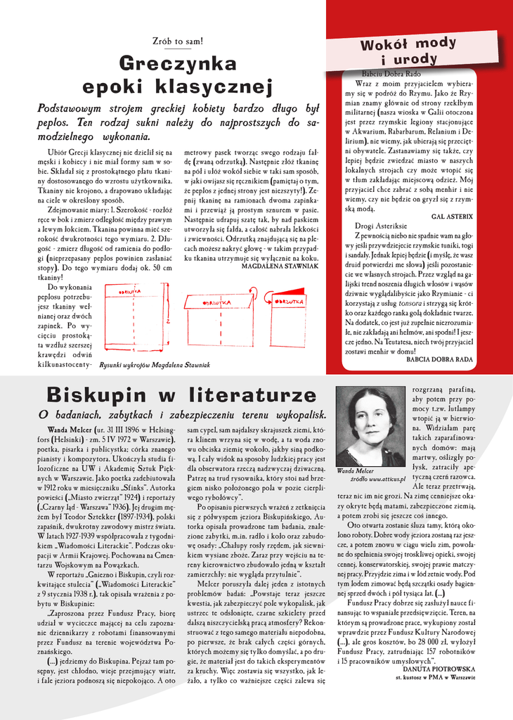 Zrób to sam! Greczynka epoki klasycznej Podstawowym strojem greckiej kobiety bardzo długo był peplos. Ten rodzaj sukni należy do najprostszych do samodzielnego wykonania. Ubiór Grecji klasycznej nie dzielił się na metrowy pasek tworząc swego rodzaju fałmęski i kobiecy i nie miał formy sam w so- dę (zwaną odrzutką). Następnie złóż tkaninę bie. Składał się z prostokątnego płatu tkani- na pół i ułóż wokół siebie w taki sam sposób, ny dostosowanego do wzrostu użytkownika. w jaki owijasz się ręcznikiem (pamiętaj o tym, Tkaniny nie krojono, a drapowano układając że peplos z jednej strony jest niezszyty!). Zena ciele w określony sposób. pnij tkaninę na ramionach dwoma zapinkaZdejmowanie miary: 1. Szerokość - rozłóż mi i przewiąż ją prostym sznurem w pasie. ręce w bok i zmierz odległość między prawym Następnie udrapuj szatę tak, by nad paskiem a lewym łokciem. Tkanina powinna mieć sze- utworzyła się fałda, a całość nabrała lekkości rokość dwukrotności tego wymiaru. 2. Dłu- i zwiewności. Odrzutką znajdującą się na plegość - zmierz długość od ramienia do podło- cach możesz nakryć głowę - w takim przypadgi (nieprzepasany peplos powinien zasłaniać ku tkanina utrzymuje się wyłącznie na koku. MAGDALENA STAWNIAK stopy). Do tego wymiaru dodaj ok. 50 cm tkaniny! Do wykonania peplosu potrzebujesz tkaniny wełnianej oraz dwóch zapinek. Po wycięciu prostokąta wzdłuż szerszej krawędzi odwiń kilkunastocenty- Rysunki wykrojów Magdalena Stawniak Biskupin w literaturze O badaniach, zabytkach i zabezpieczeniu terenu wykopalisk. Wanda Melcer (ur. 31 III 1896 w Helsingfors (Helsinki) - zm. 5 IV 1972 w Warszawie), poetka, pisarka i publicystka; córka znanego pianisty i kompozytora. Ukończyła studia filozoficzne na UW i Akademię Sztuk Pięknych w Warszawie. Jako poetka zadebiutowała w 1912 roku w miesięczniku „Sfinks”. Autorka powieści („Miasto zwierząt” 1924) i reportaży („Czarny ląd - Warszawa” 1936). Jej drugim mężem był Teodor Sztekker (1897-1934), polski zapaśnik, dwukrotny zawodowy mistrz świata. W latach 1927-1939 współpracowała z tygodnikiem „Wiadomości Literackie”. Podczas okupacji w Armii Krajowej. Pochowana na Cmentarzu Wojskowym na Powązkach. W reportażu „Gniezno i Biskupin, czyli rozkwitające stulecia” („Wiadomości Literackie” z 9 stycznia 1938 r.), tak opisała wrażenia z pobytu w Biskupinie: „Zaproszona przez Fundusz Pracy, biorę udział w wycieczce mającej na celu zapoznanie dziennikarzy z robotami finansowanymi przez Fundusz na terenie województwa Poznańskiego. (...) jedziemy do Biskupina. Pejzaż tam posępny, jest chłodno, wieje przejmujący wiatr, i fale jeziora podnoszą się niepokojąco. A oto sam cypel, sam najdalszy skrajuszek ziemi, która klinem wrzyna się w wodę, a ta woda znowu obciska ziemię wokoło, jakby siną podkową. I cały widok na sposoby ludzkiej pracy jest dla obserwatora rzeczą nadzwyczaj dziwaczną. Patrzę na trud rysownika, który stoi nad brzegiem nisko położonego pola w pozie cierpliwego rybołówcy”. Po opisaniu pierwszych wrażeń z zetknięcia się z półwyspem jeziora Biskupińskiego, Autorka opisała prowadzone tam badania, znalezione zabytki, m.in. radło i koło oraz zabudowę osady: „Chałupy rosły rzędem, jak siewnikiem wysiane zboże. Zaraz przy wejściu na tereny kierownictwo zbudowało jedną w kształt zamierzchły: nie wygląda przytulnie”. Melcer poruszyła dalej jeden z istotnych problemów badań: „Powstaje teraz jeszcze kwestia, jak zabezpieczyć pole wykopalisk, jak ustrzec te odsłonięte, czarne szkielety przed dalszą niszczycielską pracą atmosfery? Rekonstruować z tego samego materiału niepodobna, po pierwsze, że brak całych części górnych, których możemy się tylko domyślać, a po drugie, że materiał jest do takich eksperymentów za kruchy. Więc zostawia się wszystko, jak leżało, a tylko co ważniejsze części zalewa się Wo k ó ł m o d y i u ro d y Babciu Dobra Rado Wraz z moim przyjacielem wybieramy się w podróż do Rzymu. Jako że Rzymian znamy głównie od strony rzekłbym militarnej (nasza wioska w Galii otoczona jest przez rzymskie legiony stacjonujące w Akwarium, Rabarbarum, Relanium i Delirium), nie wiemy, jak ubierają się przeciętni obywatele. Zastanawiamy się także, czy lepiej będzie zwiedzać miasto w naszych lokalnych strojach czy może wtopić się w tłum zakładając miejscową odzież. Mój przyjaciel chce zabrać z sobą menhir i nie wiemy, czy nie będzie on gryzł się z rzymską modą. GAL ASTERIX Drogi Asteriksie Z pewnością niebo nie spadnie wam na głowy jeśli przywdziejecie rzymskie tuniki, togi i sandały. Jednak lepiej będzie (i myślę, że wasz druid potwierdzi me słowa) jeśli pozostaniecie we własnych strojach. Przez wzgląd na galijski trend noszenia długich włosów i wąsów dziwnie wyglądalibyście jako Rzymianie - ci korzystają z usług tonsora i strzygą się krótko oraz każdego ranka golą dokładnie twarze. Na dodatek, co jest już zupełnie niezrozumiałe, nie zakładają ani hełmów, ani spodni! I jeszcze jedno. Na Teutatesa, niech twój przyjaciel zostawi menhir w domu! BABCIA DOBRA RADA rozgrzaną parafiną, aby potem przy pomocy t.zw. lutlampy wtopić ją w bierwiona. Widziałam parę takich zaparafinowanych domów: mają martwy, oślizgły połysk, zatraciły apeWanda Melcer źródło www.atticus.pl tyczną czerń razowca. Ale teraz przetrwają, teraz nic im nie grozi. Na zimę cenniejsze okazy okryte będą matami, zabezpieczone ziemią, a potem zrobi się jeszcze coś innego. Oto otwarta zostanie śluza tamy, którą okolono roboty. Dobre wody jeziora zostaną raz jeszcze, a potem znowu w ciągu wielu zim, powołane do spełnienia swojej troskliwej opieki, swojej cennej, konserwatorskiej, swojej prawie matczynej pracy. Przyjdzie zima i w lód zetnie wody. Pod tym lodem zimować będą szczątki