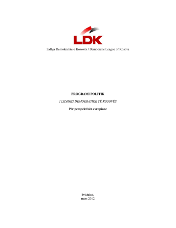Lidhja Demokratike e Kosovës / Democratic League of Kosova PROGRAMI POLITIK I LIDHJES DEMOKRATIKE TË KOSOVËS Për perspektivën evropiane Prishtinë, mars 2012 Ky program përmban parimet mbi të cilat mbështetet filozofia e veprimit politik të Lidhjes Demokratike të Kosovës. Këto parime janë frymëzuar nga vlerat dhe përvoja e Lidhjes Demokratike të Kosovës, nga nevojat dhe prioritetet nacionale të Kosovës, si dhe nga parimet e Partive Popullore Evropiane. Ky Program, i aprovuar në Konevntën e Parë të Lidhjes Demokratike të Kosovës të mbajtur në Prishtinë më 3 mars 2012, shërben si bazë për zhvillimin e Programit Qeverisës të Lidhjes Demokratike të Kosovës. 2 Përmbajtja I. II. LIDHJA DEMOKRATIKE E KOSOVËS ............................................................. 4 Preambula ................................................................................................................. 4 Vlerat e lirisë dhe të pavarësisë ................................................................................. 5 Kultivimi i vlerave demokratike ................................................................................ 5 Vizioni dhe misioni për të ardhmen........................................................................... 6 Objektivat e LDK-së: Kosova evropiane ................................................................... 7 Vizioni human mbi shoqërinë.................................................................................... 7 REFORMAT DHE MODERNIZIMI I PARTISË.................................................. 9 III. QEVERISJE NË SHËRBIM TË QYTETARËVE ............................................... 10 IV. SHTETI LIGJOR ................................................................................................ 12 V. ZHVILLIMI EKONOMIK .................................................................................. 13 Filozofia e LDK-së për zhvillim ekonomik ............................................................. 13 Zhvillimi i sektorit privat ........................................................................................ 14 Përmirësimi i kornizës ligjore dhe zvogëlimi i burokracisë në raport me bizneset .... 14 Mbështetja e ndërmarrjeve të vogla dhe të mesme................................................... 15 Investimi në kapitalin njerëzor dhe nxitja e inovacioneve ........................................ 15 Bujqësia, zhvillimi rural dhe turizmi ....................................................................... 15 Mbështetja e biznesit për të zvogëluar kostot........................................................... 15 Politikat tatimore..................................................................................................... 16 Shpenzimet publike................................................................................................. 16 Ndërmarrjet publike ................................................................................................ 16 Anëtarësimi në organizatat ekonomike ndërkombëtare............................................ 16 Energjetika, minierat dhe ruajtja e ambientit ........................................................... 17 Sistem financiar i qëndrueshëm dhe në funksion të zhvillimit ekonomik ................. 17 VI. ARSIMI DHE SHKENCA .................................................................................. 18 VII. POLITIKA E JASHTME .................................................................................... 19 VIII. PROCESET INTEGRUESE................................................................................ 20 Integrimet evropiane dhe euroatlantike.................................................................... 20 Integrimet shqiptare ................................................................................................ 20 IX. SHËNDETËSIA.................................................................................................. 21 X. POLITIKAT SOCIALE DHE SOLIDARITETI NDËRSHOQËROR .................. 21 XI. VLERAT KULTURORE DHE SPORTET.......................................................... 22 3 I. LIDHJA DEMOKRATIKE E KOSOVËS Preambula Lidhja Demokratike e Kosovës, LDK, është themeluar (më 23 dhjetor 1989) nga intelektualët shqiptarë të Kosovës, në krye me dr. Ibrahim Rugovën, i cili ka qenë kryetar i saj për të gjallë të tij. Kjo lëvizje shqiptare, me program kombëtar e demokratik, duke e bërë program fundamental politik Lirinë, Pavarësinë e Demokracinë e Kosovës, fitoi përkrahjen dhe mbështetjen e popullit të Kosovës. Në kohën e represionit më të egër serb e jugosllav kundër popullit të Kosovës, LDK-ja organizoi rezistencën politike e qytetare, organizoi jetën sociale, politike e publike, duke promovuar lirinë e fjalës, lirinë e shprehjes, tolerancën e humanitetin, duke promovuar vlerat autentike e universale. Me këto karakteristika të veprimit, LDK-ja fitoi respektin e përgjithshëm në botën shqiptare dhe në botën demokratike perëndimore. Kreu i saj historik, dr. Ibrahim Rugova, me politikën e urtë e vizionare, e bëri LDK-në forcën më të madhe të integrimeve shqiptare, çështjen e Kosovës e bëri çështje me interes evropian e amerikan dhe krijoi miq e aleatë kudo në botën demokratike. Si lëvizje politike kundër dhunës e diktaturës komuniste dhe qeverisjes arbitrare, LDKja e promovoi Republikën e Kosovës si shoqëri e shtet të vlerave, me filozofi të integrimeve rajonale e euroatlantike, duke e rikthyer vendin në shtratin kulturor e politik të Perëndimit, si vend evropian. LDK-ja krijoi normën e rregullimit të brendshëm demokratik, ku askush nuk mund të jetë përfaqësues pa qenë i votuar, ku funksionon konkurrenca e lirë e ofertës së vlerave e të programeve, ku bashkohet vullneti dhe jepet përgjegjësia. LDK-ja, që nga fillimi u shfaq si forcë politike instituciona