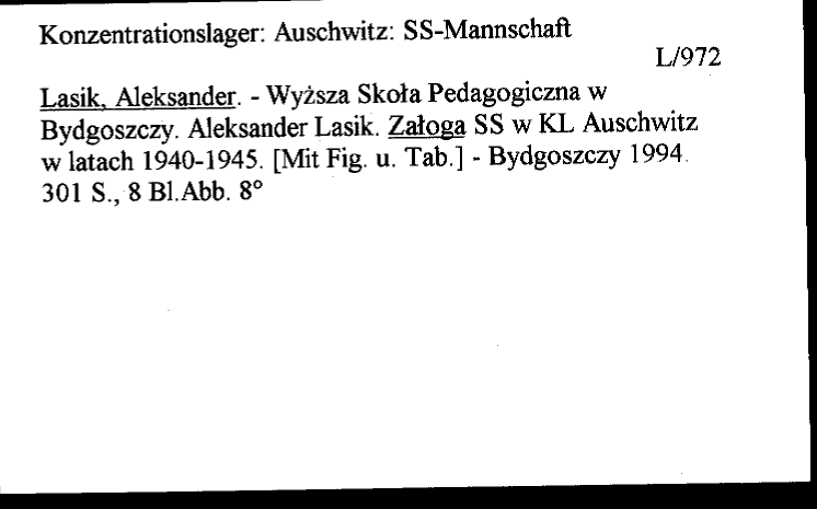 Konzentrationslager: Auschwitz: SS-Mannschaft L/972 Lasik, Aleksander. - Wyzsza Skola Pedagogiczna w Bydgoszczy. Aleksander Lasik. Zaloga SS w KL Auschwitz w latach 1940-1945. [Mit Fig. u. Tab.] - Bydgoszczy 1994 301 S., 8 Bl.Abb. 8°