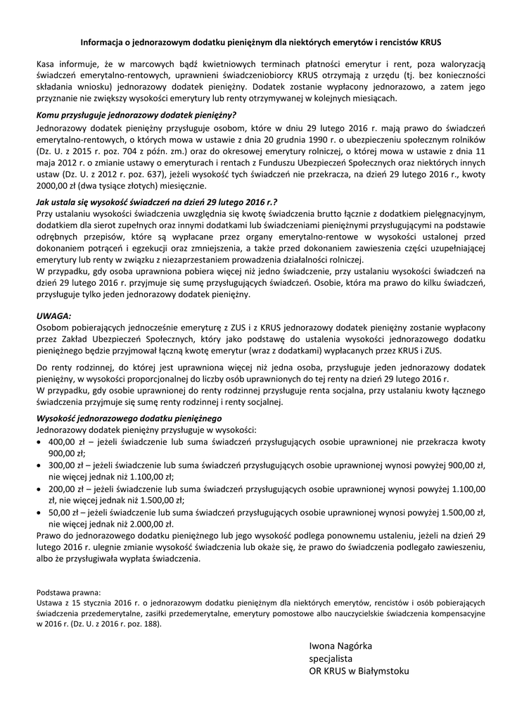 Informacja o jednorazowym dodatku pieniężnym dla niektórych emerytów i rencistów KRUS Kasa informuje, że w marcowych bądź kwietniowych terminach płatności emerytur i rent, poza waloryzacją świadczeń emerytalno-rentowych, uprawnieni świadczeniobiorcy KRUS otrzymają z urzędu (tj. bez konieczności składania wniosku) jednorazowy dodatek pieniężny. Dodatek zostanie wypłacony jednorazowo, a zatem jego przyznanie nie zwiększy wysokości emerytury lub renty otrzymywanej w kolejnych miesiącach. Komu przysługuje jednorazowy dodatek pieniężny? Jednorazowy dodatek pieniężny przysługuje osobom, które w dniu 29 lutego 2016 r. mają prawo do świadczeń emerytalno-rentowych, o których mowa w ustawie z dnia 20 grudnia 1990 r. o ubezpieczeniu społecznym rolników (Dz. U. z 2015 r. poz. 704 z późn. zm.) oraz do okresowej emerytury rolniczej, o której mowa w ustawie z dnia 11 maja 2012 r. o zmianie ustawy o emeryturach i rentach z Funduszu Ubezpieczeń Społecznych oraz niektórych innych ustaw (Dz. U. z 2012 r. poz. 637), jeżeli wysokość tych świadczeń nie przekracza, na dzień 29 lutego 2016 r., kwoty 2000,00 zł (dwa tysiące złotych) miesięcznie. Jak ustala się wysokość świadczeń na dzień 29 lutego 2016 r.? Przy ustalaniu wysokości świadczenia uwzględnia się kwotę świadczenia brutto łącznie z dodatkiem pielęgnacyjnym, dodatkiem dla sierot zupełnych oraz innymi dodatkami lub świadczeniami pieniężnymi przysługującymi na podstawie odrębnych przepisów, które są wypłacane przez organy emerytalno-rentowe w wysokości ustalonej przed dokonaniem potrąceń i egzekucji oraz zmniejszenia, a także przed dokonaniem zawieszenia części uzupełniającej emerytury lub renty w związku z niezaprzestaniem prowadzenia działalności rolniczej. W przypadku, gdy osoba uprawniona pobiera więcej niż jedno świadczenie, przy ustalaniu wysokości świadczeń na dzień 29 lutego 2016 r. przyjmuje się sumę przysługujących świadczeń. Osobie, która ma prawo do kilku świadczeń, przysługuje tylko jeden jednorazowy dodatek pieniężny. UWAGA: Osobom pobierających jednocześnie emeryturę z ZUS i z KRUS jednorazowy dodatek pieniężny zostanie wypłacony przez Zakład Ubezpieczeń Społecznych, który jako podstawę do ustalenia wysokości jednorazowego dodatku pieniężnego będzie przyjmował łączną kwotę emerytur (wraz z dodatkami) wypłacanych przez KRUS i ZUS. Do renty rodzinnej, do której jest uprawniona więcej niż jedna osoba, przysługuje jeden jednorazowy dodatek pieniężny, w wysokości proporcjonalnej do liczby osób uprawnionych do tej renty na dzień 29 lutego 2016 r. W przypadku, gdy osobie uprawnionej do renty rodzinnej przysługuje renta socjalna, przy ustalaniu kwoty łącznego świadczenia przyjmuje się sumę renty rodzinnej i renty socjalnej. Wysokość jednorazowego dodatku pieniężnego Jednorazowy dodatek pieniężny przysługuje w wysokości: • 400,00 zł – jeżeli świadczenie lub suma świadczeń przysługujących osobie uprawnionej nie przekracza kwoty 900,00 zł; • 300,00 zł – jeżeli świadczenie lub suma świadczeń przysługujących osobie uprawnionej wynosi powyżej 900,00 zł, nie więcej jednak niż 1.100,00 zł; • 200,00 zł – jeżeli świadczenie lub suma świadczeń przysługujących osobie uprawnionej wynosi powyżej 1.100,00 zł, nie więcej jednak niż 1.500,00 zł; • 50,00 zł – jeżeli świadczenie lub suma świadczeń przysługujących osobie uprawnionej wynosi powyżej 1.500,00 zł, nie więcej jednak niż 2.000,00 zł. Prawo do jednorazowego dodatku pieniężnego lub jego wysokość podlega ponownemu ustaleniu, jeżeli na dzień 29 lutego 2016 r. ulegnie zmianie wysokość świadczenia lub okaże się, że prawo do świadczenia podlegało zawieszeniu, albo że przysługiwała wypłata świadczenia. Podstawa prawna: Ustawa z 15 stycznia 2016 r. o jednorazowym dodatku pieniężnym dla niektórych emerytów, rencistów i osób pobierających świadczenia przedemerytalne, zasiłki przedemerytalne, emerytury pomostowe albo nauczycielskie świadczenia kompensacyjne w 2016 r. (Dz. U. z 2016 r. poz. 188). Iwona Nagórka specjalista OR KRUS w Białymstoku Kasa Rolniczego Ubezpieczenia Społecznego Oddział Regionalny w Białymstoku u l. L e gi o no wa 1 8, 1 5- 09 9 B i a ł ys t ok t e l. : 85 74 9 7 3 0 0; f ak s 8 5 7 4 9 7 3 10 ww w.k r us . g o v. p l, e- m a i l: b i a l ys t ok @k r us . go v . p l Waloryzacja emerytur i rent rolniczych od 1 marca 2016 r. Jednostki organizacyjne Kasy Rolniczego Ubezpieczenia Społecznego, na podstawie art. 48 ustawy z dnia 20 grudnia 1990 r. o ubezpieczeniu społecznym rolników, w związku z art. 94 ustawy z dnia 17 grudnia 1998 r. o emeryturach i rentach z Funduszu Ubezpieczeń Społecznych, od 1 marca 2016 r., przeprowadza akcję waloryzacji emerytur i rent rolniczych. Od dnia 1 marca 2016 r. kwoty świadczeń emerytalno-rentowych przysługujących do dnia 29 lutego 2016 r. podlegają podwyższeniu wskaźnikiem waloryzacyjnym (wynikającym z ustawy o emeryturach i rentach z FUS) wynoszącym 100,24 %. Oznacza to, że kwoty najniższych świadczeń oraz kwoty dodatków wypłacanych do emerytur i rent zostaną podwyższone o 0,24%. Kwota najniższej emerytury pracowniczej (tzw. emerytury podstawowej) od 1 marca 2016 r. wyniesie 882 zł 56 gr miesięcznie (brutto). W konsekwencji od tej daty zostaną podwyższone wszystkie emerytury i renty rolnicze, renty socjalne – wypłacane na dzień 29 lutego 2016 r. Waloryzacja emerytur i rent rolniczych polega na przemnożeniu kwoty emerytury podstawowej przez wskaźnik wymiaru ustalony indywidualnie dla każdego świadczenia. W skali kraju waloryzacja obejmie około 1,20 mln świadczeń i zostanie przeprowadzona w marcu 2016 r., a dla emerytur i rent wypłacanych kwartalnie – w kwietniu br., w ustalonych dla każdego świadczeniobiorcy terminach płatności. Nowa wysokość świadczeń emerytalnych i rentowy