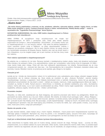 Źródło: http://old.mimowszystko.org/pl/aktualnosci/biezace/2898,Siostro-Anno.html Wygenerowano: Piątek, 3 marca 2017, 13:25 „Siostro Anno” „Do mnie chorzy podchodzą z rezerwą, no bo, wiadomo, aktorka, wiecznie piękna, młoda i nigdy chora, co taka baba może wiedzieć o życiu. Czasem przecież słyszę o sobie: moralizatorka, Matkę Boską udaje” – mówi w wywiadzie dla "Tygodnika Powszechnego" Anna Dymna. KATARZYNA KUBISIOWSKA: Do roku 1989 ludzie niepełnosprawni w Polsce praktycznie byli niewidoczni. ANNA DYMNA: W szczęśliwym kraju socjalistycznym nie mogło być niepełnosprawnych. W 1973 r. przeżyłam szok, kiedy jako młoda aktorka wyjechałam do Londynu z „Nocą listopadową". Pomyślałam: „A to biedny naród, tylu tu niepełnosprawnych, a u nas wszyscy zdrowi”. Gdy wiele lat później spędzałam z moim malutkim synem urlop w Dębkach, na plaży obserwowałam rodzinę z chłopcem po porażeniu mózgowym. Ale to wiem dopiero dzisiaj, bo wtedy jeszcze nie rozróżniałam porażenia od Zespołu Downa. Rodzice cały czas się śmiali razem z tym chłopakiem, a ja nie mogłam pojąć, jak to jest możliwe, że ktoś tak chory może być radosny. Fot.: Joanna Pieczara Pani rodzice opowiadali o niepełnosprawnych? No właśnie nie, w rodzinie ich nie było. Pierwszy kontakt z niedołężnością miałam wtedy, kiedy mój dziadziuś zachorował. Kilka miesięcy nie wstawał z łóżka, a ja, piętnastoletnia, myłam go i przewijałam, tylko trochę mnie to krępowało. W 1996 r. moja mama miała zator mózgu. Przez pół roku byk całkowicie sparaliżowana, nie mówiła. Porozumiewała się ze mną mrugnięciami powiek, raz – znaczyło tak, dwa razy – nie. Rozmawiałyśmy tak o wszystkim. Pamiętam, dostałam wtedy rudą kociczkę, Czaczę. Mówiłam mamie, że przemycę ją do szpitala, gdy nikogo tu nie będzie. Cieszyło ją to? Leciały jej Izy i śmiała się równocześnie. Lekarz mi to wytłumaczył: przy uszkodzeniu pnia mózgu człowiek reaguje bardzo emocjonalnie, ale te reakcje mieszają się. Dużo wtedy jej czytałam na głos: „Kubusia Puchatka", wiersze księdza Twardowskiego, rozmowy z papieżem. Karol Wojtyła bierzmował mnie w kościele misjonarzy, mama też go poznała. Po spektaklach przychodziłam do niej dzień w dzień – robiłam jej masaże, manicure, miała wypielęgnowane dłonie jak nigdy. I czesałam ją, bardzo to lubiła. Rytuał jeszcze z dzieciństwa: w niedzielę, po obiedzie siadałyśmy przy radiu, słuchałyśmy audycji, mama piła kawę, a ja w tym czasie szczotkowałam jej włosy. Potem mama nagle wypiękniała – zmarszczki jej się wygładziły, odleżyny zagoiły. Umarła we śnie – młoda i uśmiechnięta. Przestała cierpieć. Wszystko, co robię dziś, zawdzięczam jej. Była księgową, ale powinna pracować jako lekarz czy pielęgniarka. Wokół niej gromadzili się ludzie, dobrze się z nią czuli. Dobry człowiek. Nie mówiła, że trzeba innym pomagać, tylko: „Wiesz, Małgosiu – tak na mnie w domu wołano – jak chcesz sobie krzyczeć, śpiewać, to bardzo proszę, tylko sprawdź najpierw, czy Jureczek nie śpi”. Jureczek to jest mój młodszy brat. Nie pouczając, uczyła najważniejszego – zważaj na innych, nie jesteś sama. I pomagaj w najprostszych sprawach. Gdy pan leżał pijany przy śmietniku, to mama nie robiła „fuj", tylko pytała z troską: „Czy coś się stało, może panu zimno, czego pan potrzebuje?”. Nauka nie poszła w las. Już jako dorosła kobieta, szłam kiedyś ulicą z moim mężem, Wieśkiem, i facet przed nami niespodziewanie wywrócił się, uderzając głową o krawężnik. Nachylam się, chcę mu pomóc, a on, kompletnie pijany, zaczyna mnie dusić, wyzywając od najgorszych. Dymny tylko powiedział: „Aniu, ostrożnie z tym pomaganiem, bo ktoś cię kiedyś za to udusi”. Czyli już w dzieciństwie miała Pani ustalone życiowe kierunkowskazy. Takie dzieciństwo to kapitał, kiedy jest mi trudno dzisiaj, zawsze wracam do niego. Pomaga. Ojciec – uczciwy do bólu, antykomunista, za co władza ludowa mu życie zatruwała. Złota rączka, nawet piekarnik mamie zrobił, który co prawda kopał prądem i dziwnie się nagrzewał, ale piec się dało. W domu się nie narzekało, że czegoś brakuje, a przecież bieda była. Sami potrafiliśmy wiele rzeczy zrobić, ozdoby na choinkę zaczynaliśmy kleić już w październiku, do grudnia po domu walały się kolorowe papiery i bibułki. Teraz z moimi przyjaciółmi i rodziną na święta też lepimy z masy solnej szopki i baranki. Zatrudnia Pani nawet podopiecznych w swojej Fundacji, jak Janusza Świtaja. Pewnego dnia rozdzwonili się do mnie dziennikarze. Mówią, że całkowicie sparaliżowany dwudziestokilkulatek prosi o eutanazję, i co ja na to. Wtedy miałam próby generalne „Orestei” i powiedziałam, żeby mi dali święty spokój. Ale wróciłam do domu, włączam telewizor, a w wiadomościach widzę faceta, którego przecież znam. Kiedyś prosił Fundację o pomoc i kupiliśmy mu ssak do odfegmiania i materac przeciwodleżynowy. Gdy się zorientowałam, że to Janusz prosi o prawo do zaprzestania uporczywej terapii, zadzwoniłam natychmiast i opieprzyłam go z góry na dół: „Nudzi ci się chyba – krzyczałam – może byś się do roboty wziął”. A potem myślę: „Jezu, co ja do niego mówię”. Bo tak naprawdę Janusz, prosząc o eutanazję, krzyczał o życie. Czuł się balastem dla otoczenia, choć ma fantastycznych rodziców, którzy się nim opiekuj ą. Ale Janusz wyobrażał sobie, co się stanie, kiedy umrą, i trafi do domu opieki społecznej, jak on to mówił: „do pokoju z zamalowanymi szybami”, gdzie wszyscy będą czekali aż umrze. A to facet, któremu kipi w środku energia niczym lawa w zamkniętym wulkanie. Janusz został więc zatrudniony na pół etatu w fundacji, dość komicznie wyglądało obowiązkowe przeszkolenie BHP. „Jak będzie się paliło, to lej” 