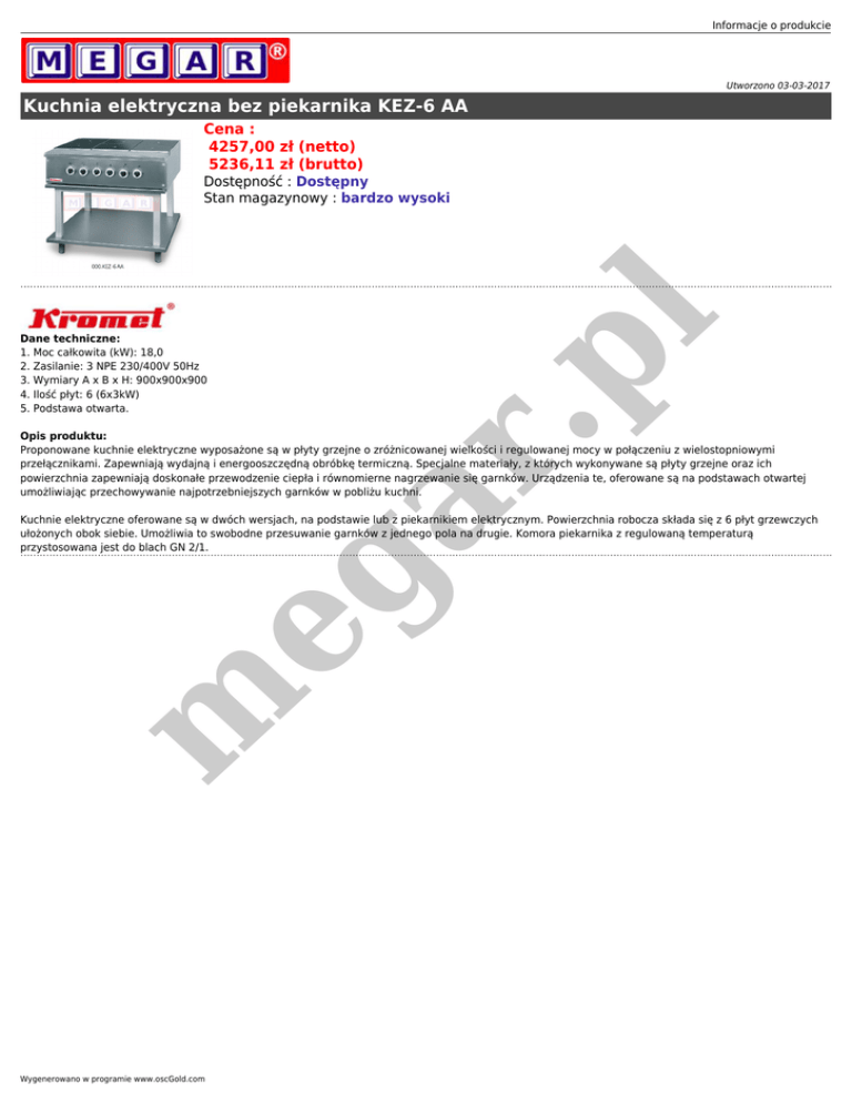 Informacje o produkcie Utworzono 03-03-2017 Kuchnia elektryczna bez piekarnika KEZ-6 AA Cena : 4257,00 zł (netto) 5236,11 zł (brutto) .p l Dostępność : Dostępny Stan magazynowy : bardzo wysoki Dane techniczne: 1. Moc całkowita (kW): 18,0 2. Zasilanie: 3 NPE 230/400V 50Hz 3. Wymiary A x B x H: 900x900x900 4. Ilość płyt: 6 (6x3kW) 5. Podstawa otwarta. ar Opis produktu: Proponowane kuchnie elektryczne wyposażone są w płyty grzejne o zróżnicowanej wielkości i regulowanej mocy w połączeniu z wielostopniowymi przełącznikami. Zapewniają wydajną i energooszczędną obróbkę termiczną. Specjalne materiały, z których wykonywane są płyty grzejne oraz ich powierzchnia zapewniają doskonałe przewodzenie ciepła i równomierne nagrzewanie się garnków. Urządzenia te, oferowane są na podstawach otwartej umożliwiając przechowywanie najpotrzebniejszych garnków w pobliżu kuchni. m eg Kuchnie elektryczne oferowane są w dwóch wersjach, na podstawie lub z piekarnikiem elektrycznym. Powierzchnia robocza składa się z 6 płyt grzewczych ułożonych obok siebie. Umożliwia to swobodne przesuwanie garnków z jednego pola na drugie. Komora piekarnika z regulowaną temperaturą przystosowana jest do blach GN 2/1. Wygenerowano w programie www.oscGold.com