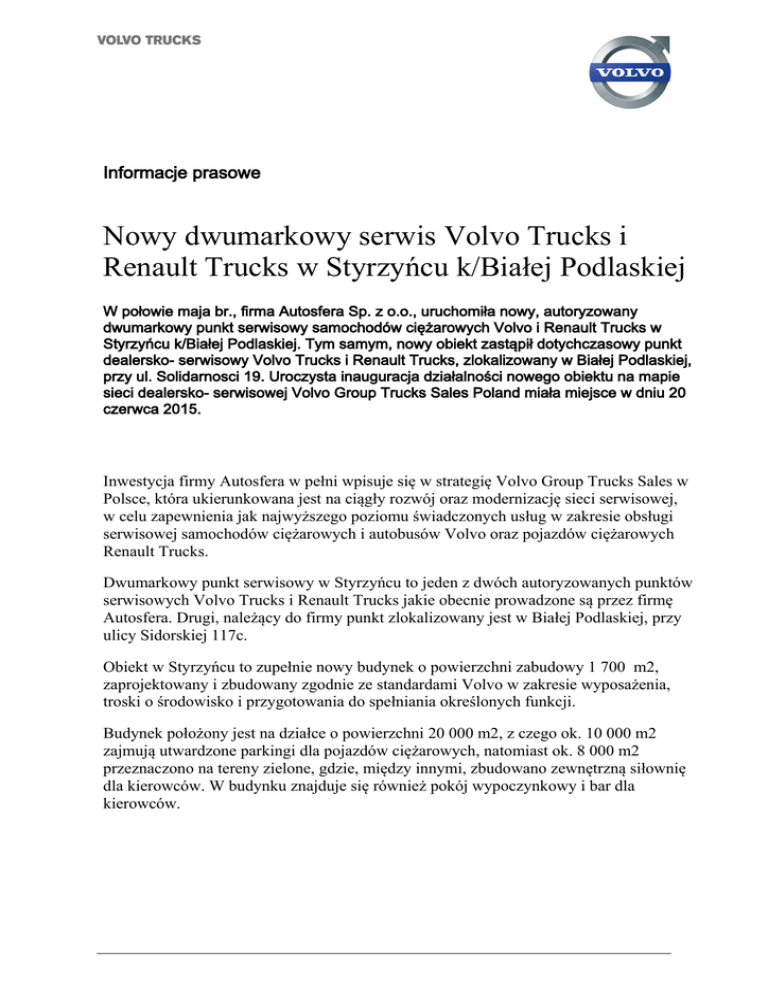Informacje prasowe Nowy dwumarkowy serwis Volvo Trucks i Renault Trucks w Styrzyńcu k/Białej Podlaskiej W połowie maja br., firma Autosfera Sp. z o.o., uruchomiła nowy, autoryzowany dwumarkowy punkt serwisowy samochodów ciężarowych Volvo i Renault Trucks w Styrzyńcu k/Białej Podlaskiej. Tym samym, nowy obiekt zastąpił dotychczasowy punkt dealersko- serwisowy Volvo Trucks i Renault Trucks, zlokalizowany w Białej Podlaskiej, przy ul. Solidarnosci 19. Uroczysta inauguracja działalności nowego obiektu na mapie sieci dealersko- serwisowej Volvo Group Trucks Sales Poland miała miejsce w dniu 20 czerwca 2015. Inwestycja firmy Autosfera w pełni wpisuje się w strategię Volvo Group Trucks Sales w Polsce, która ukierunkowana jest na ciągły rozwój oraz modernizację sieci serwisowej, w celu zapewnienia jak najwyższego poziomu świadczonych usług w zakresie obsługi serwisowej samochodów ciężarowych i autobusów Volvo oraz pojazdów ciężarowych Renault Trucks. Dwumarkowy punkt serwisowy w Styrzyńcu to jeden z dwóch autoryzowanych punktów serwisowych Volvo Trucks i Renault Trucks jakie obecnie prowadzone są przez firmę Autosfera. Drugi, należący do firmy punkt zlokalizowany jest w Białej Podlaskiej, przy ulicy Sidorskiej 117c. Obiekt w Styrzyńcu to zupełnie nowy budynek o powierzchni zabudowy 1 700 m2, zaprojektowany i zbudowany zgodnie ze standardami Volvo w zakresie wyposażenia, troski o środowisko i przygotowania do spełniania określonych funkcji. Budynek położony jest na działce o powierzchni 20 000 m2, z czego ok. 10 000 m2 zajmują utwardzone parkingi dla pojazdów ciężarowych, natomiast ok. 8 000 m2 przeznaczono na tereny zielone, gdzie, między innymi, zbudowano zewnętrzną siłownię dla kierowców. W budynku znajduje się również pokój wypoczynkowy i bar dla kierowców. W części warsztatowej punktu serwisowego w Styrzyńcu, 660 m2 zajmuje hala napraw z 3 przejazdowymi stanowiskami obsługowo-naprawczymi o długości 30 m i 1 stanowiskiem nie przejazdowym. Na terenie obiektu znajduje się również rozbudowane zaplecze serwisowe z bogato wyposażonym magazynem części zamiennych. Nowy punkt serwisowy w Styrzyńcu, w chwili obecnej, zatrudnia 20 pracowników, w tym 11 mechaników, świadcząc pełną gamę usług serwisowych dla samochodów ciężarowych i autobusów Volvo oraz pojazdów Renault Trucks. Na terenie obiektu znajdują się również przeniesione z ul. Solidarności 19 punkty sprzedaży nowych i używanych samochodów ciężarowych Volvo i Renault Trucks, prowadzone przez Volvo Group Trucks Sales, Poland. Nowa inwestycja firmy Autosfera mieści również ekologiczną myjnię dla samochodów ciężarowych oraz okręgową stację kontroli pojazdów, która jest wyposażona w ścieżkę diagnostyczną MAHA. Klienci dwumarkowego punktu serwisowego w Styrzyńcu z pewnością docenią też jego bardzo dogodną lokalizację - obiekt usytuowany jest przy międzynarodowej trasie E30. Uroczysta inauguracja nowego obiektu na mapie sieci serwisowej Volvo Trucks i Renault Trucks w Polsce, odbyła się w dniu 20 czerwca br., z udziałem wielu zgromadzonych z tej okazji gości, wśród których znaleźli się Klienci firmy, partnerzy biznesowi oraz przedstawiciele lokalnych władz i mediów. - Cieszymy się bardzo, że dzięki wieloletniej, owocnej współpracy z firmą Autosfera, możemy zaoferować Klientom tak profesjonalny obiekt na mapie sieci Volvo Trucks i Renault Trucks w Polsce - powiedziała Małgorzata Kulis, Vice President, Volvo Group Trucks Sales, Baltic Sea Market. - Jestem przekonana, że ten nowoczesny, doskonale wyposażony i spełniający najwyższe standardy Volvo punkt serwisowy, jeden z najnowocześniejszych tego typu obiektów na ścianie wschodniej, będzie trwałym i solidnym wsparciem dla działalności transportowej wszystkich Klientów korzystających z jego szerokiej oferty produktów i usług na najwyższym poziomie, dodała. Dane teleadresowe nowego punktu: Autosfera Sp. z o.o. ul. Sadowa 2, Styrzyniec 21-500 Biała Podlaska Telefon: +48 83 343 20 20 Telefon 24-godz.: +48 691 102 200 Godziny otwarcia: pn: 07.00 - 19.00 wt-pt: 07.00 - 21.00 sb: 07.00 - 15.00 W celu uzyskania dodatkowych informacji, prosimy o kontakt z: Renata Stefańska, Menedżer ds. PR, Volvo Group Trucks Sales, Baltic Sea Market, [email protected]; tel. +48 601 33 44 38 Aby uzyskać dostęp do filmów o jakości telewizyjnej, związanych z niniejszą informacją prasową i nie tylko, odwiedź stronę http://www.thenewsmarket.com/volvotrucks Zdjęcia i filmy są dostępne w galerii zdjęć i filmów Volvo Trucks, pod adresem http://images.volvotrucks.com Koncern Volvo Trucks dostarcza kompletne rozwiązania transportowe dla profesjonalistów i wymagających klientów, oferując pełną gamę samochodów ciężarowych o średniej i dużej ładowności. Serwis zapewnia 2100 dealerów i stacji obsługi w ponad 140 krajach. Samochody ciężarowe są produkowane w 14 krajach. W 2013 r. dostarczono ponad 116 000 tych pojazdów. Koncern Volvo Trucks jest częścią Grupy Volvo, jednego z czołowych światowych producentów samochodów ciężarowych, autobusów, maszyn budowlanych oraz morskich i stacjonarnych układów napędowych. Grupa Volvo dostarcza również kompletne rozwiązania finansowe i serwisowe. Kluczowymi wartościami Volvo są jakość, bezpieczeństwo i troska o środowisko naturalne.