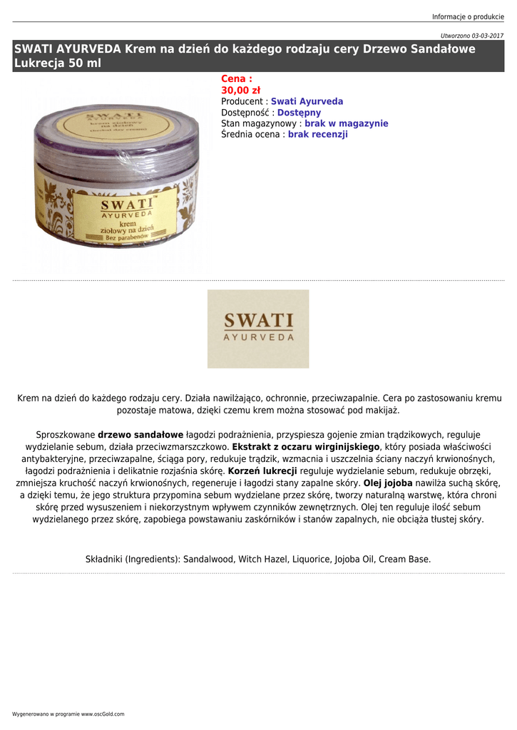 Informacje o produkcie Utworzono 03-03-2017 SWATI AYURVEDA Krem na dzień do każdego rodzaju cery Drzewo Sandałowe Lukrecja 50 ml Cena : 30,00 zł Producent : Swati Ayurveda Dostępność : Dostępny Stan magazynowy : brak w magazynie Średnia ocena : brak recenzji Krem na dzień do każdego rodzaju cery. Działa nawilżająco, ochronnie, przeciwzapalnie. Cera po zastosowaniu kremu pozostaje matowa, dzięki czemu krem można stosować pod makijaż. Sproszkowane drzewo sandałowe łagodzi podrażnienia, przyspiesza gojenie zmian trądzikowych, reguluje wydzielanie sebum, działa przeciwzmarszczkowo. Ekstrakt z oczaru wirginijskiego, który posiada właściwości antybakteryjne, przeciwzapalne, ściąga pory, redukuje trądzik, wzmacnia i uszczelnia ściany naczyń krwionośnych, łagodzi podrażnienia i delikatnie rozjaśnia skórę. Korzeń lukrecji reguluje wydzielanie sebum, redukuje obrzęki, zmniejsza kruchość naczyń krwionośnych, regeneruje i łagodzi stany zapalne skóry. Olej jojoba nawilża suchą skórę, a dzięki temu, że jego struktura przypomina sebum wydzielane przez skórę, tworzy naturalną warstwę, która chroni skórę przed wysuszeniem i niekorzystnym wpływem czynników zewnętrznych. Olej ten reguluje ilość sebum wydzielanego przez skórę, zapobiega powstawaniu zaskórników i stanów zapalnych, nie obciąża tłustej skóry. Składniki (Ingredients): Sandalwood, Witch Hazel, Liquorice, Jojoba Oil, Cream Base. Wygenerowano w programie www.oscGold.com