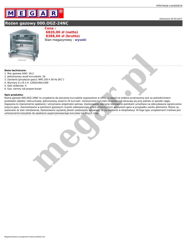Informacje o produkcie Utworzono 03-03-2017 Rożen gazowy 000.OGZ-24NC Cena : 6820,00 zł (netto) 8388,60 zł (brutto) .p l Stan magazynowy : wysoki Dane techniczne: 1. Moc gazowa (kW): 16,2 2. Jednorazowy wsad kurczaków: 24 3. Zasilanie [przyłącze gazu]: NPE 230 V 50 Hz [R1”] 4. Wymiary A x B x H: 1200x540x1300 5. Ilość widelców: 4 6. Gaz: ziemny lub propan-butan m eg ar Opis produktu: Rożna gazowe 000.OGZ-24NC to urządzenia do pieczenia kurczaków wyposażone w silnik, a napęd na widelce przenoszony jest za pośrednictwem przekładni zębatej i łańcuchowej. Jednorazowy wsad to 24 kurczaki. Umieszczone kurczaki na widelcach obracają się przy palniku w sposób ciągły. Zapewnia to równomierne opiekanie i utrzymanie wilgotności potraw. Zastosowane sekcyjne sterowanie palnikami umożliwia na zdecydowane ograniczenie zużycia gazu. Zainstalowane w palnikach gazowych czujniki zabezpieczają przed samoczynnym wypływem gazu w przypadku zaniku płomienia. Rożna są wykonane ze stali nierdzewnej. Zastosowane wysokiej jakości podzespoły sprawiają, że są one tanie w eksploatacji. W tego typu urządzeniach możliwe jest umieszczenie koszyków do opiekania wyporcjonowanego kurczaka lub innych mięs. Wygenerowano w programie www.oscGold.com