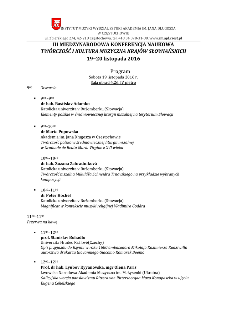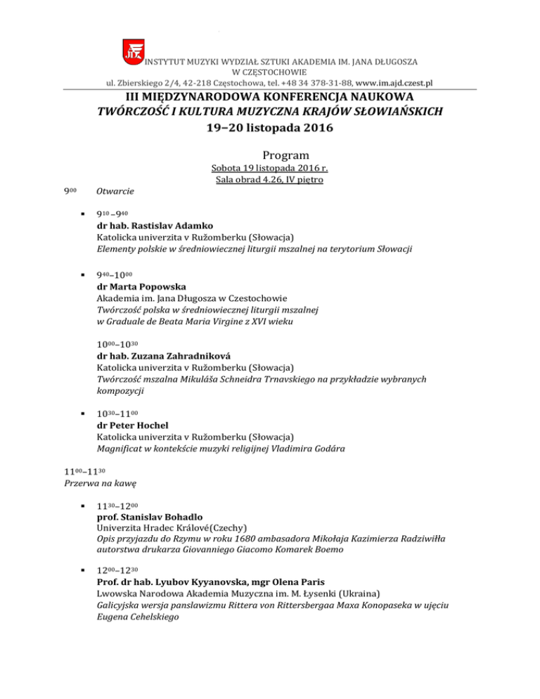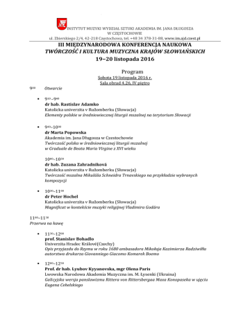 INSTYTUT MUZYKI WYDZIAŁ SZTUKI AKADEMIA IM. JANA DŁUGOSZA W CZĘSTOCHOWIE ul. Zbierskiego 2/4, 42-218 Częstochowa, tel. +48 34 378-31-88, www.im.ajd.czest.pl III MIĘDZYNARODOWA KONFERENCJA NAUKOWA TWÓRCZOŚĆ I KULTURA MUZYCZNA KRAJÓW SŁOWIAŃSKICH 19–20 listopada 2016 Program Sobota 19 listopada 2016 r. Sala obrad 4.26, IV piętro 900 Otwarcie 910 –940 dr hab. Rastislav Adamko Katolicka univerzita v Ružomberku (Słowacja) Elementy polskie w średniowiecznej liturgii mszalnej na terytorium Słowacji 940–1000 dr Marta Popowska Akademia im. Jana Długosza w Czestochowie Twórczość polska w średniowiecznej liturgii mszalnej w Graduale de Beata Maria Virgine z XVI wieku 1000–1030 dr hab. Zuzana Zahradniková Katolicka univerzita v Ružomberku (Słowacja) Twórczość mszalna Mikuláša Schneidra Trnavskiego na przykładzie wybranych kompozycji 1030–1100 dr Peter Hochel Katolicka univerzita v Ružomberku (Słowacja) Magnificat w kontekście muzyki religijnej Vladimira Godára 1100–1130 Przerwa na kawę 1130–1200 prof. Stanislav Bohadlo Univerzita Hradec Králové(Czechy) Opis przyjazdu do Rzymu w roku 1680 ambasadora Mikołaja Kazimierza Radziwiłła autorstwa drukarza Giovanniego Giacomo Komarek Boemo 1200–1230 Prof. dr hab. Lyubov Kyyanovska, mgr Olena Paris Lwowska Narodowa Akademia Muzyczna im. M. Łysenki (Ukraina) Galicyjska wersja panslawizmu Rittera von Rittersbergaa Maxa Konopaseka w ujęciu Eugena Cehelskiego INSTYTUT MUZYKI WYDZIAŁ SZTUKI AKADEMIA IM. JANA DŁUGOSZA W CZĘSTOCHOWIE ul. Zbierskiego 2/4, 42-218 Częstochowa, tel. +48 34 378-31-88, www.im.ajd.czest.pl 1230–1300 dr Ulyana Hrab Lwowska Narodowa Akademia Muzyczna im. M. Łysenki (Ukraina) Związki polsko-ukraińskie w działalności Zakładu Muzykologii Uniwersytetu Lwowskiego w latach 1912–1939 1300–1330 dr Lilia Nazar Lwowska Narodowa Akademia Muzyczna im. M. Łysenki (Ukraina) Słowiańskie wątki etniczne w twórczości Wasyla Barwińskiego 1330–1430 Obiad 1430–1500 dr hab. Magdalena Dziadek, mgr Michał Jaczyński Uniwersytet Jagielloński w Krakowie Występy Sergiusza Rachmaninowa w Polsce 1500–1530 dr hab. Bogumiła Mika Uniwersytet Śląski w Katowicach, Instytut Muzyki w Cieszynie Polacy na Promsach 1530–1600 dr Monika Karwaszewska Akademia Muzyczna im. St. Moniuszki w Gdańsku Wątki polskie w mszach Jana Adama Maklakiewicza i Tadeusza Maklakiewicza 1600–1630 Przerwa na kawę 1630–1700 mgr Lyubov Nazarova Univerzita Hradec Králové (Czechy) Analiza twórczości Bohdany Filc na przykładzie cyklu fortepianowego „Dziesięć zakarpackich nowelet” 1700–1730 dr Magdalena Szyndler Uniwersytet Śląski w Katowicach Instytut Muzyki w Cieszynie Zmiany endogenne i egzogenne folkloru pieśniowego Trójwsi (Beskid Śląski). Badania własne 1730 Kolacja INSTYTUT MUZYKI WYDZIAŁ SZTUKI AKADEMIA IM. JANA DŁUGOSZA W CZĘSTOCHOWIE ul. Zbierskiego 2/4, 42-218 Częstochowa, tel. +48 34 378-31-88, www.im.ajd.czest.pl Niedziela 20 listopada 2016 r. Sale obrad 4.26, IV piętro i 5.02, V piętro 815–900 Śniadanie Panel 1, sala 4.26 900–930 mgr Olga Mek Uniwersytet Warszawski Etnogeneza kultury słowiańskiej 930–1000 mgr Katarzyna Lidia Babulewicz Uniwersytet Jagielloński w Krakowie O traktorze pędzącym w rytm Kalinki. Folklor w filmach animowanych Europy Środkowo-Wschodniej 1000–1030 dr Danuta Zoń-Ciuk Uniwersytet Śląski w Katowicach, Instytut Muzyki w Cieszynie „Tren dla Jan Sztwiertni” Ryszarda Gabrysia – ludowość i współczesność 1030–1100 Przerwa na kawę 1100–1130 dr hab. Marcin Tadeusz Łukaszewski Uniwersytet Muzyczny Fryderyka Chopina w Warszawie Związki Wojciecha Łukaszewskiego ze Śląskiem 1130–1200 dr Magdalena Stochniol Akademia Muzyczna im. K. Szymanowskiego w Katowicach Space Opera Aleksandra Nowaka - prezentacja utworu 1200–1230 mgr Joanna Piszczelok Państwowa Szkoła Muzyczna I i II stopnia im. M. Karłowicza w Katowicach Twórczość Mikołaja Góreckiego na scenach koncertowych Europy oraz w nagraniach – próba charakterystyki 1230–1300 mgr Katarzyna Bartos INSTYTUT MUZYKI WYDZIAŁ SZTUKI AKADEMIA IM. JANA DŁUGOSZA W CZĘSTOCHOWIE ul. Zbierskiego 2/4, 42-218 Częstochowa, tel. +48 34 378-31-88, www.im.ajd.czest.pl Akademia Muzyczna im. K. Lipińskiego we Wrocławiu Natura, jako źródło inspiracji w twórczości Grażyny Pstrokońskiej-Nawratil Panel 2, sala 5.02 900–930 dr Maryla Renat Akademia im. Jana Długosza w Częstochowie Koncert fortepianowy „Słowiański” Feliksa Nowowiejskiego 930–1000 dr Daniel Lis Akademia Muzyczna im. K. Szymanowskiego w Katowicach Władysław Zołotariow Sonata nr 3 – inspiracje, symbolika, interpretacja 1000–1030 dr hab. Ewa Grabowska-Lis Akademia im. Jana Długosza w Częstochowie Andrzej Krzanowski, Edward Bogusławski – nieznane dzieła, wybitni twórcy 1030–1100 Przerwa na kawę 1100–1130 mgr Jakub Brawata Akademia im. Jana Długosza w Częstochowie Miniatura fortepianowa końca XX wieku na przykładach wybranych utworów Bronisława Kazimierza Przybylskiego i Zygmunta Krauzego 1130–1200 mgr Mateusz Meisner Katolicka univerzita v Ružomberku (Słowacja) Nauczanie gry na fortepianie z wykorzystaniem współczesnych utworów kompozytorów polskich 1200–1230 dr Anna Stachura-Bogusławska Akademia im. Jana Długosza w Częstochowa Elementy współczesnego języka muzycznego w wybranych utworach fortepianowych dla dzieci kompozytorów śląskich XX i XXI wieku 1300–1315 Podsumowanie. Zamkniecie konferencji. Sala 4.26 1315 Obiad