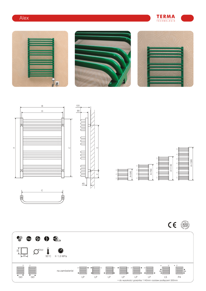 Alex 120 90 E A C' B D 5 4 A=1140 4 4 A=540 3 F 4 3 3 3 A=760 4 4 4 A=1580 4 5 4 4 4 5 5 45 C 30 30 Æ 22 30 95°C ≤ 1,0 MPa * * na zamówienie: GD GD 500 LP LP LP LP LP LP 500 L5 * do wysokości grzejnika 1140mm rozstaw podłączeń 500mm P4 A B C C' Δt=50°C Δt=60°C [mm] [mm] [mm] [mm] [W] [W] [W] 300 400 500 600 300 400 500 600 300 400 500 600 500 600 700 270 370 470 570 270 370 470 570 270 370 470 570 470 570 670 500 500 500 500 720 720 720 720 1100 1100 1100 1100 1540 1540 1540 200 269 328 378 290 370 445 515 414 526 662 756 888 1014 1166 250 336 410 473 363 463 556 644 518 658 828 945 1110 1268 1458 200 300 300 400 300 400 400 600 400 600 600 800 1000 1000 1000 540 540 540 540 760 760 760 760 1140 1140 1140 1140 1580 1580 1580 D E F [mm] [mm] [mm] 270 370 470 570 270 370 470 570 270 370 470 570 470 570 670 355 355 355 355 575 575 575 575 955 955 955 955 1395 1395 1395 94 94 94 94 94 94 94 94 94 94 94 94 94 94 94