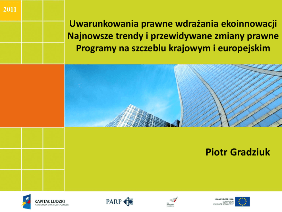 2011 Uwarunkowania prawne wdrażania ekoinnowacji Najnowsze trendy i przewidywane zmiany prawne Programy na szczeblu krajowym i europejskim Piotr Gradziuk Poziomy regulacji Obszar energetyki odnawialnej jest uregulowany na trzech poziomach: 1. międzynarodowym globalnym 2. międzynarodowym albo ponadnarodowym regionalnym 3. krajowym OZE – poziom globalny • Najistotniejszą regulacją globalną odnosząca się do rozwoju energetyki odnawialnej stanowi Konwencja Klimatyczna, która przyjęta została 9 maja 1992 r. w Nowym Yorku i weszła w życie 21 marca 1994 r. • Wspomniana umowa międzynarodowa tworzy fundament dla systemu prawa ochrony klimatu oraz wyznacza długofalowe cele zmierzające do transformacji gospodarki ( co najmniej na kilkadziesiąt lat ). • Stabilizacja gazów cieplarnianych jest w obszarze redukcji emisji ściśle powiązana z wprowadzaniem nowych technologii w sektorze energetycznym. OZE – poziom globalny • Protokół z Kyoto , został przyjęty w 1997 r. • Jest kolejnym aktem globalnym, który odnosi się do rozwoju energetyki odnawialnej – tym razem bezpośrednio. • W związku z obowiązkami redukcyjnymi paostw wysokorozwiniętych przewidziano szereg instrumentów, wśród których znajdują się: badania , wsparcie, rozwój i wzrost wykorzystania nowych i odnawialnych zasobów energii . OZE – poziom globalny – Protokół z Kyoto • Przeważa ścieżka ograniczenia emisji • Zobowiązania dotyczą paostw rozwiniętych • Ściśle określony przedział czasowy 2008-2012 • Rozpoczynają się negocjacje nad post-Kioto • Dla rozwoju OZE są istotne trzy mechanizmy elastyczne: handel uprawnieniami do emisji ET mechanizm wspólnych wdrożeo JI mechanizm czystego rozwoju CDM OZE – poziom unijny - przyczyny • Podstawowe znaczenie posiada osiągniecie zrównoważonego rozwoju, na który wpływają dwa zagadnienia: bezpieczeostwo dostaw oraz ochrona środowiska . • Aspekt gospodarczy - Europa jest w coraz większym stopniu uzależniona od importu nośników energii. • Aspekt środowiskowy - Energetyka jest główną przyczyną zmian klimatycznych i zanieczyszczenia powietrza. • Aspekt społeczny - Polityka energetyczna powinna generalnie przyczynid się do rozwoju gospodarczego i powstawania nowych miejsc pracy w Europie. Powinna dad ważny impuls dla rozwoju nowych technologii i przełożyd się na rozwój nauki i edukacji. OZE – poziom unijny Traktat o funkcjonowaniu FUE • 1 grudnia 2009 r. wszedł w życie Traktat Lizbooski z 13 grudnia 2007 r. • Zgodnie z art. 4 Traktatu o funkcjonowaniu Unii Europejskiej energia lit i oraz transport lit g należą do kompetencji dzielonych. • Paostwa Członkowskie wykonują swoją kompetencję w zakresie, w jakim Unia nie wykonała swojej kompetencji. Paostwa Członkowskie ponownie wykonują swoją kompetencję w zakresie, w jakim Unia postanowiła zaprzestad wykonywania swojej kompetencji – art. 2 ust. 2. • Oprócz lit. i i g do energii będą się odnosiły pośrednio postanowienia dotyczące: unii celnej i ustanawiania reguł konkurencji niezbędnych do funkcjonowania rynku wewnętrznego oraz rynku wewnętrznego, polityki społecznej, spójności gospodarczej, środowiska naturalnego, sieci transeuropejskich. OZE – poziom unijny – dyrektywa 2001/77/EC • Podstawowym aktem odnoszącym się do OZE w prawie wtórnym jest dyrektywa 2001/77/EC z dnia 27 września 2001 r. w sprawie wspierania produkcji na rynku wewnętrznym energii elektrycznej wytwarzanej ze źródeł odnawialnych. • Jak dotychczas jest to swoista „konstytucja” dla OZE w prawie unijnym . OZE – poziom unijny – polityczne podstawy pakietu klimatyczno-energetycznego • Polityka energetyczna dla Europy 5282/07 [COM(2007) 1] • • Ograniczenie globalnych zmian klimatu do 2 stopni Celsjusza – Droga do 2020 r. i dalej 5422/07 + ADD 1 + ADD 2 [COM(2007) 2] • Wkład Rady Energetycznej do wiosennej Rady Europejskiej 2007 - 6453/07 • Cele UE w obszarze dalszego rozwoju międzynarodowego prawa zmian klimatu po 2012 - 6621/07 • Dokument podstawowych kwestii Rady Środowiskowej do wiosennej Rady Europejskiej 2007 - 6629/07 Cele pakietu klimatyczno-energetycznego • 20 procentowy udział energii wyprodukowanej w oze w ogólnej konsumpcji energii • 10 procentowy udział biopaliw w całkowitej konsumpcji paliw • 20 procentowa redukcja emisji gazów cieplarnianych w porównaniu do 1990 r. • 20 procentowa oszczędnośd energii OZE – poziom unijny – dyrektywa 2009/28/EC • Rozwój energetyki odnawialnej powinien stanowid istotny element w osiągnięciu podwójnego celu, jakim jest zwiększenie bezpieczeostwa dostaw i ograniczenie emisji gazów cieplarnianych. Oznacza to, iż niezbędna jest zmiana sposobu w jaki Wspólnota promuje OZE. Konieczne jest wzmocnienie i rozszerzenie istniejących ram prawnych. W szczególności ważne jest zapewnienie podjęcia przez wszystkie paostwa członkowskie koniecznych działao gwarantujących zwiększenie udziału źródeł odnawialnych w ich koszyku energetycznym. OZE – poziom unijny – dyrektywa 2009/28/EC - cele • ogólny wiążący cel wspólnotowy przewidujący 20%-owy udział odnawialnej źródeł energii w zużyciu energii ( obecnie 8,5 udział ) • wiążące cele krajowe udziału OZE do 2020 r., które są zgodne z ogólnym celem wspólnotowym wynoszącym 20% • minimalny wiążący cel przewidujący 10%-owy udział biopaliw w transporcie, który ma zostad osiągnięty przez wszystkie paostwa członkowskie • zagwarantowanie pewności dla inwestorów OZE – poziom unijny – dyrektywa 2009/28/EC – obszar regulacji • Dyrektywa dotyczy trzech sektorów: elektroenergetyki, ciepłownictwa i chłodnictwa oraz transportu. Postanowienia zakładają zachowanie przez paostwa członkowskie uprawnienia do decydowania o udziale tych sektorów w osiągnięciu celu krajowego. Proponuje się jednak, aby każde paostwo członkowskie osiągnęło co najmniej 10%-o