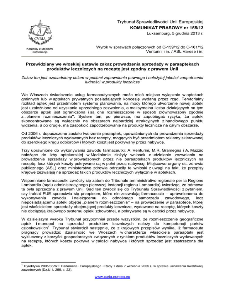 Trybunał Sprawiedliwości Unii Europejskiej KOMUNIKAT PRASOWY nr 155/13 Luksemburg, 5 grudnia 2013 r. Kontakty z Mediami i Informacja Wyrok w sprawach połączonych od C-159/12 do C-161/12 Venturini i in. / ASL Varese i in. Przewidziany we włoskiej ustawie zakaz prowadzenia sprzedaży w paraaptekach produktów leczniczych na receptę jest zgodny z prawem Unii Zakaz ten jest uzasadniony celem w postaci zapewnienia pewnego i należytej jakości zaopatrzenia ludności w produkty lecznicze We Włoszech świadczenie usług farmaceutycznych może mieć miejsce wyłącznie w aptekach gminnych lub w aptekach prywatnych posiadających koncesję wydaną przez rząd. Terytorialny rozkład aptek jest przedmiotem systemu planowania, na mocy którego utworzenie nowej apteki jest uzależnione od uzyskania uprzedniego zezwolenia, a maksymalna liczba działających na tym obszarze aptek jest ograniczona i są one rozmieszczone w sposób zrównoważony zgodnie z „planem rozmieszczenia”. System ten, po pierwsze, ma zapobiegać ryzyku, że apteki skoncentrowane są wyłącznie na obszarach najbardziej atrakcyjnych z handlowego punktu widzenia, a po drugie, ma zaspokoić zapotrzebowanie na produkty lecznicze na całym obszarze. Od 2006 r. dopuszczone zostało tworzenie paraaptek, upoważnionych do prowadzenia sprzedaży produktów leczniczych wydawanych bez recepty, mogących być przedmiotem reklamy skierowanej do szerokiego kręgu odbiorców i których koszt jest pokrywany przez nabywcę. Trzy uprawnione do wykonywania zawodu farmaceutki: A. Venturini, M.R. Gramegna i A. Muzzio należące do izby aptekarskiej w Mediolanie złożyły wniosek o udzielenie zezwolenia na prowadzenie sprzedaży w prowadzonych przez nie paraaptekach produktów leczniczych na receptę, lecz których koszty pokrywane są w pełni przez nabywcę. Miejscowe organy ds. zdrowia publicznego (ASL) oraz ministerstwo zdrowia odrzuciły te wnioski z uwagi na fakt, że przepisy krajowe zezwalają na sprzedaż takich produktów leczniczych wyłącznie w aptekach. Wspomniane farmaceutki zwróciły się zatem do Tribunale amministrativo regionale per la Regione Lombardia (sądu administracyjnego pierwszej instancji regionu Lombardia) twierdząc, że odmowa ta była sprzeczna z prawem Unii. Sąd ten zwrócił się do Trybunału Sprawiedliwości z pytaniem, czy traktat FUE sprzeciwia się przepisom, które nie zezwalają farmaceucie – uprawnionemu do wykonywania zawodu i należącemu do odnośnego samorządu zawodowego, lecz nieposiadającemu apteki objętej „planem rozmieszczenia” – na prowadzenie w paraaptece, której jest właścicielem sprzedaży obejmującej produkty lecznicze, wydawane na receptę, których koszty nie obciążają krajowego systemu opieki zdrowotnej, a pokrywane są w całości przez nabywcę. W dzisiejszym wyroku Trybunał przypomniał przede wszystkim, że rozmieszczenie geograficzne aptek i monopol na sprzedaż produktów leczniczych należy do kompetencji państw członkowskich1. Trybunał stwierdził następnie, że z krajowych przepisów wynika, iż farmaceuta pragnący prowadzić działalność we Włoszech w charakterze właściciela paraapteki jest wykluczony z korzyści gospodarczych związanych z rynkiem produktów leczniczych wydawanych na receptę, których koszty pokrywa w całości nabywca i których sprzedaż jest zastrzeżona dla aptek. 1 Dyrektywa 2005/36/WE Parlamentu Europejskiego i Rady z dnia 7 września 2005 r. w sprawie uznawania kwalifikacji zawodowych (Dz.U. L 255, s. 22). www.curia.europa.eu Przepisy te stanowią ograniczenie swobody przedsiębiorczości, gdyż mogą utrudniać lub czynić mniej atrakcyjnym prowadzenie działalności na terytorium włoskim przez farmaceutę będącego obywatelem innego państwa członkowskiego, który chciałby we Włoszech prowadzić paraaptekę. Mogą one być jednak uzasadnione nadrzędnymi względami interesu ogólnego. Włoskie przepisy mają na celu zagwarantowanie pewnego i należytej jakości zaopatrzenia ludności w produkty lecznicze, co podlega jeszcze bardziej ogólnemu celowi w postaci ochrony zdrowia publicznego. W tym względzie Trybunał przypomniał, że system planowania może okazać się nieodzowny w celu wypełnienia ewentualnych luk w dostępie do usług opieki zdrowotnej i zapobieżenia tworzeniu powielających się struktur, tak aby zapewnić opiekę zdrowotną, która byłaby dostosowana do zapotrzebowania ludności, pokrywała całe terytorium i uwzględniała rejony geograficznie odizolowane lub z innych względów znajdujące się w gorszej sytuacji2. Umożliwienie sprzedaży niektórych produktów leczniczych na receptę w paraaptekach oznaczałoby, że te produkty lecznicze mogą być sprzedawane bez objęcia ich wymogiem planowania terytorialnego, co mogłoby prowadzić do koncentracji paraaptek w miejscowościach uznawanych za najbardziej dochodowe i spowodować zmniejszenie liczby klientów aptek w tych miejscowościach, a zatem utratę ich dochodów. Taka sytuacja mogłaby zatem powodować obniżenie jakości usług świadczonych w aptekach na rzecz ogółu klientów, a nawet prowadzić do ostatecznego zamknięcia niektórych aptek. Niedobór aptek w niektórych częściach terytorium prowadziłby zatem do braku pewnego i należytej jakości zaopatrzenia w produkty lecznicze. Trybunał podkreślił ponadto, że każde państwo członkowskie może decydować o poziomie, na jakim zamierza zapewnić ochronę zdrowia publicznego i o sposobach osiągnięcia tego poziomu. Włoski system, który nie zezwala na sprzedaż w paraaptekach produktów leczniczych na receptę, których koszty nie obciążają krajowego systemu opieki zdrowotnej, a pokrywane są w całości przez nabywcę wpływa na obniżenie ryzyka niedoboru aptek w sposób proporcjonalny względem celu polegającego na zapewnieniu pewnego i należytej jakości zaopatrzenia ludności w produkty lecznicze. UWAGA: Odesłanie prejudycjalne pozwala sądom państw cz