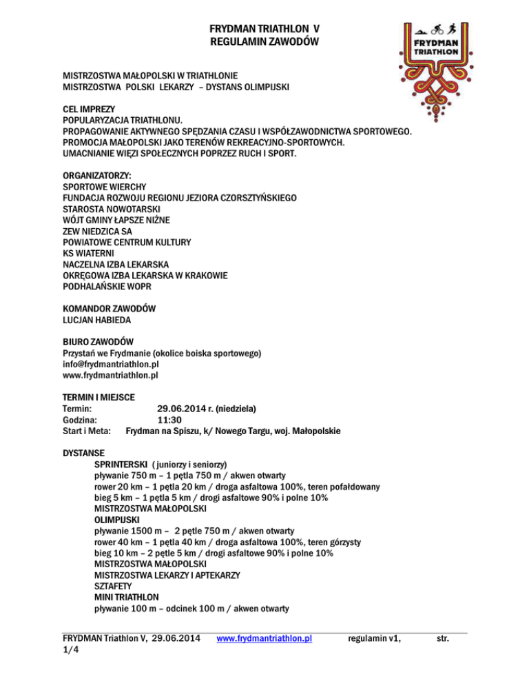 FRYDMAN TRIATHLON V REGULAMIN ZAWODÓW MISTRZOSTWA MAŁOPOLSKI W TRIATHLONIE MISTRZOSTWA POLSKI LEKARZY – DYSTANS OLIMPIJSKI CEL IMPREZY POPULARYZACJA TRIATHLONU. PROPAGOWANIE AKTYWNEGO SPĘDZANIA CZASU I WSPÓŁZAWODNICTWA SPORTOWEGO. PROMOCJA MAŁOPOLSKI JAKO TERENÓW REKREACYJNO-SPORTOWYCH. UMACNIANIE WIĘZI SPOŁECZNYCH POPRZEZ RUCH I SPORT. ORGANIZATORZY: SPORTOWE WIERCHY FUNDACJA ROZWOJU REGIONU JEZIORA CZORSZTYŃSKIEGO STAROSTA NOWOTARSKI WÓJT GMINY ŁAPSZE NIŻNE ZEW NIEDZICA SA POWIATOWE CENTRUM KULTURY KS WIATERNI NACZELNA IZBA LEKARSKA OKRĘGOWA IZBA LEKARSKA W KRAKOWIE PODHALAŃSKIE WOPR KOMANDOR ZAWODÓW LUCJAN HABIEDA BIURO ZAWODÓW Przystań we Frydmanie (okolice boiska sportowego) [email protected] www.frydmantriathlon.pl TERMIN I MIEJSCE Termin: 29.06.2014 r. (niedziela) Godzina: 11:30 Start i Meta: Frydman na Spiszu, k/ Nowego Targu, woj. Małopolskie DYSTANSE SPRINTERSKI ( juniorzy i seniorzy) pływanie 750 m – 1 pętla 750 m / akwen otwarty rower 20 km – 1 pętla 20 km / droga asfaltowa 100%, teren pofałdowany bieg 5 km – 1 pętla 5 km / drogi asfaltowe 90% i polne 10% MISTRZOSTWA MAŁOPOLSKI OLIMPIJSKI pływanie 1500 m – 2 pętle 750 m / akwen otwarty rower 40 km – 1 pętla 40 km / droga asfaltowa 100%, teren górzysty bieg 10 km – 2 pętle 5 km / drogi asfaltowe 90% i polne 10% MISTRZOSTWA MAŁOPOLSKI MISTRZOSTWA LEKARZY I APTEKARZY SZTAFETY MINI TRIATHLON pływanie 100 m – odcinek 100 m / akwen otwarty FRYDMAN Triathlon V, 29.06.2014 1/4 www.frydmantriathlon.pl regulamin v1, str. FRYDMAN TRIATHLON V REGULAMIN ZAWODÓW rower 2,5 km – 1 pętla 2,5 km / droga polna, teren pofałdowany bieg 500 m – 1 pętla 500 m / drogi polne KLASYFIKACJA I KATEGORIE WIEKOWE Generalna – kobiet i mężczyzn K miejsce 1,2,3 M miejsce 1,2,3 DYSTANS SPRINTERSKI I OLIPIJSKI Kobiety – K, Mężczyźni – M K/M 2: 16 – 17 lat ; K/M 3: 18 – 19 lat; K/M 4: 20 – 29 lat; K/M 5: 30 – 39 lat; K/M 6: 40 – 49 lat; K7: 50 lat i powyżej, M7: 50 – 59 lat; M8: 60 lat i powyżej MINI TRIATHLON Dzieci – D D1: 7 – 9 lat; D2: 10 – 12 lat; D3: 13 – 15 lat O przynależności do kategorii wiekowej decyduje rok urodzenia. SZTAFETY Zespoły trzy-osobowe (pływak, rowerzysta, biegacz) na dystansie olimpijskim. WARUNKI UCZESTNICTWA Zgłoszenie i opłacenie wpisowego w terminie przewidzianym przez regulamin. Pisemne oświadczenie o stanie zdrowia umożliwiającym uprawianie sportów wytrzymałościowych lub takież zaświadczenie lekarskie. - na dystansie sprinterskim mogą wystartować osoby które ukończyły 16 lat. - na dystansie olimpijskim mogą wystartować osoby które ukończyły 18 lat. - w Mistrzostwach Lekarzy i Aptekarzy osoby posiadające prawo do wykonywania zawodu (okazane przy zapisach). - w Mini Triathlonie dzieci od 7 do 15 lat. ZGŁOSZENIA Po wypełnieniu formularza zgłoszeniowego zawodnik będzie automatycznie umieszczony na liście startowej. O terminie zgłoszenia decyduje data wpływu środków na konto Organizatora. Limit startujących jest ograniczony do 500 zawodników. Zgłoszenia należy wypełniać elektronicznie na stronie www.sport-timing.pl Zgłoszenia online będą aktywne do 15.06.2014 r. , późniejsza rejestracja będzie niemożliwa. WPISOWE ZAWODNICY INDYWIDUALNI 150 PLN płatne w terminie do 30.04.2014r. 200 PLN płatne w terminie od 01.05 do 31.05.2014r. 250 PLN płatne w terminie od 01.06 do 15.06.2014r. SZTAFETY 240 PLN płatne w terminie do 30.04.2014r. 360 PLN płatne w terminie od 01.05 do 31.05.2014r. FRYDMAN Triathlon V, 29.06.2014 2/4 www.frydmantriathlon.pl regulamin v1, str. FRYDMAN TRIATHLON V REGULAMIN ZAWODÓW 450 PLN płatne w terminie od 01.06 do 15.06.2014r. Młodzież Szkół Podstawowych i Gimnazjum oraz mieszkańcy gminy Łapsze Niżne – bezpłatnie. Opłaty za dystans sprinterski i olimpijski są takie same. KONTO BANKOWE: Fundacja Rozwoju Regionu Jeziora Czorsztyńskiego 34-400 Nowy Targ Nr konta: 18 1240 1574 1111 0000 0790 6224 PKO SA O/Nowy Targ z dopiskiem: Frydman tri + imię i nazwisko Wpisowe nie podlega zwrotowi. ZMIANA ZAWODNIKA Opłacony pakiet startowy, w szczególnych przypadkach losowych, można przekazać na innego zawodnika. Należy wypełnić formularz na stronie www.sport-timing.pl jak dla nowego uczestnika. Dodatkowa opłata zamiany na innego zawodnika wynosi 20zł (płatne przy odbiorze pakietu startowego). NAGRODY Dla zawodników, którzy ukończą zawody przewidziane są pamiątkowe medale, dyplomy a dla zwycięzców puchary. Nagrody rzeczowe będą przyznawane w zależności od pozyskanych sponsorów. NOCLEGI rekomendujemy (rezerwacje i opłaty we własnym zakresie) Dom Wypoczynkowy Pod Taborem, os. Pod Taborem 2, 34-441 Niedzica Tel: 18 26 29 322, Fax: 18 26 29 383 wew. 231 e-mail: [email protected] Hotel Pieniny ,ul. Kanada 38, 34-441 Niedzica Tel: 18 26 29 383, Tel: 018 26 29 474 e-mail: [email protected] Ośrodek Wczasowy Trzy Korony, ul. Jana Pawła II 28A, 34-435 Frydman Tel: 18 285 19 61, Tel: 18 265 61 03 e-mail: [email protected] Pensjonat Tajemniczy Ogród, ul. Jana Pawła II 31, 34-435 Frydman Tel. 18 285 18 72 e-mail: [email protected] UWAGI KOŃCOWE 1. Zawody odbędą się bez względu na warunki atmosferyczne. 2. Ostateczne zamknięcie listy startowej nastąpi 15.06.2014r. o godz. 22:00. 3. Odbiór pakietów startowych w dniu 28.06.2014 w godz. 17:00 - 20:00 4. Limit zawodników na obu dystansach wynosi 500 osób. Jeśli do dnia 01.06.2014r. będzie zgłoszonych i opłaconych więcej niż 500 uczestników limit zostanie zwiększony tak, aby wszyscy zawodnicy z opłaconym wpisowym mogli wystartować. 5. Start na obu dystansach rozpoczyna się „z wody” o tej samej godzinie 11:30. FRYDMAN Triathlon V, 29.06.2014 3/4 www.frydmantriathlon.pl regulamin v1, str. FRYDMAN TRIATHLON V REGULAMIN ZAWODÓW 6. Zawody odbywają się w konwencji non-drafting (zabroniona tzw. jazda na kole, podciąganie). 7. Limit czasowy wynosi: a. dla dystansu sprinterskiego 2,5 h b. dla dystansu o