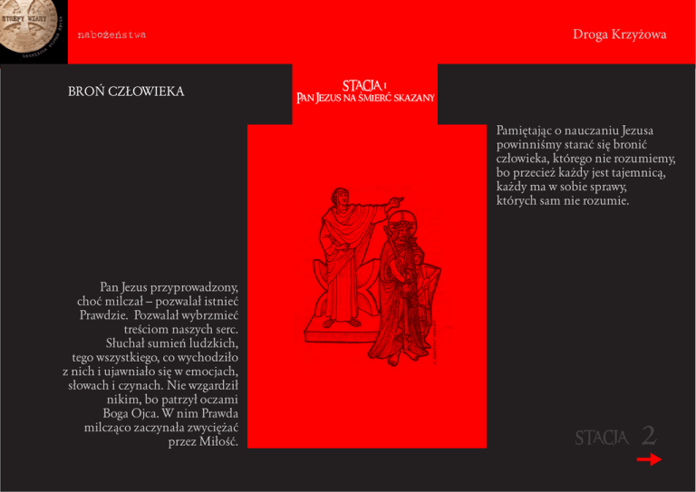 Droga Krzyżowa nabożeństwa BROŃ CZŁOWIEKA STACJA 1 Pan Jezus na śmierć skazany Pamiętając o nauczaniu Jezusa powinniśmy starać się bronić człowieka, którego nie rozumiemy, bo przecież każdy jest tajemnicą, każdy ma w sobie sprawy, których sam nie rozumie. Pan Jezus przyprowadzony, choć milczał – pozwalał istnieć Prawdzie. Pozwalał wybrzmieć treściom naszych serc. Słuchał sumień ludzkich, tego wszystkiego, co wychodziło z nich i ujawniało się w emocjach, słowach i czynach. Nie wzgardził nikim, bo patrzył oczami Boga Ojca. W nim Prawda milcząco zaczynała zwyciężać przez Miłość. STACJA 2 Droga Krzyżowa nabożeństwa BĄDŹ ODWAŻNY Jezu, Tyś powiedział: „Jeżeli ktoś chce być moim uczniem, niech się zaprze samego siebie, niech każdego dnia bierze krzyż swój i niech Mnie naśladuje”. Łk 9,23 STACJA 2 Pan Jezus bierze krzyż Wiem Panie, że wybierając krzyż, wybieram cierpienie, samotność, opuszczenie, niezrozumienie. Cierpienie jest tajemnicą. Cierpienie jest doznawaniem zła, ale nabiera wartości zbawczej, gdy przyjmujemy je i niesiemy w zjednoczeniu z Chrystusem. Św. Faustyna pisze w dzienniczku: „Cierpienia i przeciwności… przerażały mnie i odbierały mi odwagę. Toteż modliłam się nieustannie, aby mnie, Jezus wzmocnił i dał mi moc Ducha swojego Świętego, żebym mogła spełnić we wszystkim Jego świętą wolę, bo od początku znałam i znam słabość swoją … To poznanie nędzy mojej daje mi zarazem poznać przepaść miłosierdzia Twojego”. 1 STACJA 3 Droga Krzyżowa nabożeństwa UPADEK SŁOWA STACJA 3 Pierwszy upadek Polecamy Ci Panie naszych rodziców, krewnych – tych żywych i tych zmarłych. Polecamy nas samych w naszych codziennych upadkach. Jezu, teraz sam jesteś jak potłuczona przez Mojżesza kamienna płyta Dekalogu – leżysz przed ludem, kołacząc do grobów – tych żywych i tych umarłych. Jezus zawsze ryzykował, gdy mówił do ludzi – przecież mogli Go odrzucić. A jednak zawsze byli ci, którzy zbierali ziarna, wydawali plon – byli Jego radością. 2 STACJA 4 Droga Krzyżowa nabożeństwa LUSTRO MATKI Maryja stała na końcu tłumu cała drżąca. Przyszła! – radością napełniło się serce Syna. W Jej twarzy widział siebie, stan swego ciała. Jednak w Jej oczach zobaczył też zgodę: „Wolny, mogę iść dalej!” STACJA 4 Spotkanie z Matką Najbliżsi są darem dla nas, a nasze powołanie zakonne jest darem dla nich. Polecamy Ci Jezu nas i nasze matki, powierzając się Twojej i naszej Matce – Maryi. Matka Boża z Guadelupe zwraca się też do nas: „Posłuchaj i weź to sobie do serca, mój synu (moja córko), że nie musisz się niczego obawiać ani niczym dręczyć. Nie pozwól, by Twoja twarz ani serce było zmartwione. Nie bój się tego, ani żadnej choroby, ani niczego niszczącego czy dręczącego.Czy nie ma mnie tutaj mnie, która jestem Twoją Matką? Czy nie jesteś w moim cieniu, pod moją opieką? Czy nie jestem fontanną Twojej radości?Czy nie jesteś w fałdach mojego płaszcza, w moich skrzyżowanych ramionach? Czy potrzebujesz czegoś jeszcze?” 3 STACJA 5 Droga Krzyżowa nabożeństwa POWOŁANIE DO POMOCY STACJA 5 Pomoc Szymona O ileż milsza jest pomoc niesiona z dobrej woli, a nie z przymusu. Dopomóż nam to zrozumieć, Jezu, w naszych codziennych obowiązkach i zajęciach, w poszukiwaniu definicji wolności, która się rozmywa ze względu na ból i cierpienie, którego tak bardzo chcielibyśmy uniknąć. Pan Jezus po męce Ogrójca i procesu nie miał dość sił, by nieść belkę krzyża. Upadł pod jego ciężarem. Dlatego przymuszono obcego człowieka, by Mu pomógł. 4 STACJA 6 Droga Krzyżowa nabożeństwa WERONIKA – DZIECKO BOŻE STACJA 6 Weronika Czy widzimy w sobie i w innych dziecko Boże? Czy pozwalamy sobie na ulgę i czy otwieramy się na pomoc innych bez analizy i nieufności? Kiedy odeszli Weronika stała z chustą. Jej wzrok pewnie długo szukał Jezusa w tłumie. Po chwili zobaczyła na swojej chuście Jego oblicze. Przytuliła twarz do odbicia Jego Twarzy. Nie, nie szkodzi, że jeszcze świeża krew! Mogła usłyszeć od chusty: „Tyle ulgi sprawiłaś mi, Weroniko, dzięki tobie zobaczyłam rodzącego się człowieka!” 5 STACJA 7 Droga Krzyżowa nabożeństwa MIEJ CIERPLIWOŚĆ STACJA 7 dRUGI UPA DEK Szatan cieszy się, gdy się zniechęcamy, gdy się niecierpliwimy, gdy jesteśmy zbytnio podejrzliwi. Ale, gdy upadamy, Pan Bóg dyskretnie daje nam moc poprzez Jego Słowo, daje siłę, która pozwala spojrzeć z dystansem na siebie i otoczenie – znowu powraca nadzieja. Czy zauważasz tę siłę? Czasem nie udaje nam się uniknąć upadku, jesteśmy słabi – często potem wyrzucamy sobie grzechy, nawet te już odpuszczone. 6 STACJA 8 Droga Krzyżowa nabożeństwa MIEJ WSPÓŁCZUCIE STACJA 8 Płaczące niewiasty Wśród ludzi stojących przy drodze krzyżowej wielu było takich, którzy kochali Pana Jezusa i współczuli Mu. Były tam również płaczące kobiety, których bardzo poruszyło cierpienie Chrystusa. On wiedział, że każdy z obecnych potrzebuje nawrócenia, by na nowo móc zaprzyjaźnić się z Panem Bogiem. „Nie płaczcie nade mną, ale nad sobą i nad synami waszymi”. 7 STACJA 9 Droga Krzyżowa nabożeństwa PRZYJMUJ PRAWDĘ O SOBIE STACJA 9 Trzeci upadek Upadam i powstaję, upadam i powstaję, upadam i powstaję. Dzięki temu coraz wyraźniej odkrywam Prawdę o Męce Chrystusa i doświadczam swojej męki we własnej rzeczywistości. Naucz nas, Panie, przebywać z Tobą szczególnie w sytuacjach, kiedy nic się nie da zmienić. Dopomóż otwierać nasze serca na przyjęcie Prawdy o nas samych. Jezus nie próbował łatać starych serc kawałkami słów z nowego sukna. Przygotowywał uczniów na przyjęcie Nowego Wina. 8 STACJA 10 Droga Krzyżowa nabożeństwa DZIĘKUJ ZA BRATNIĄ DUSZĘ STACJA 10 Odarcie z szat Dziękujemy Ci, Panie, za bratnie dusze, za dobre serce i pamięć w modlitwie zn